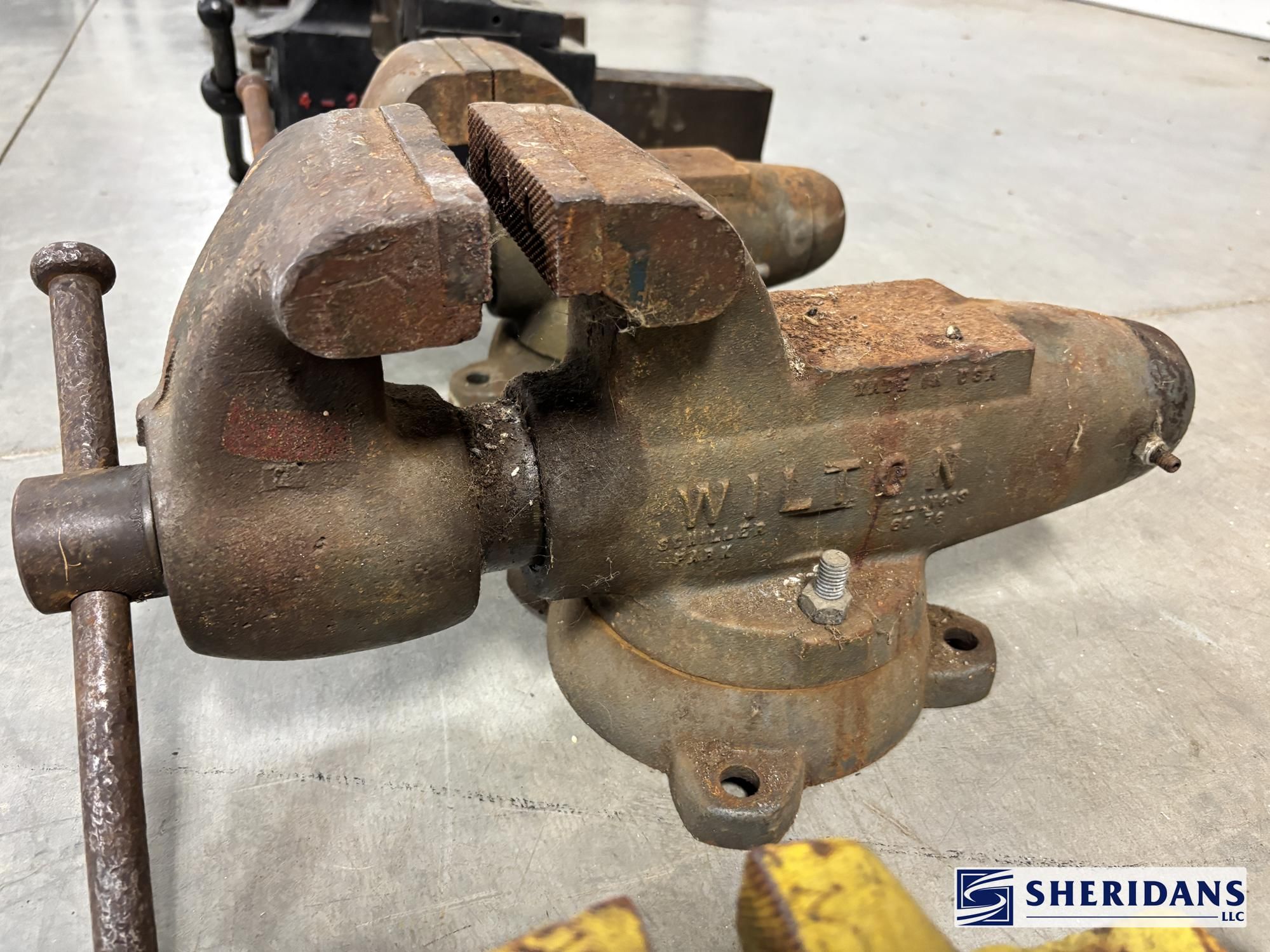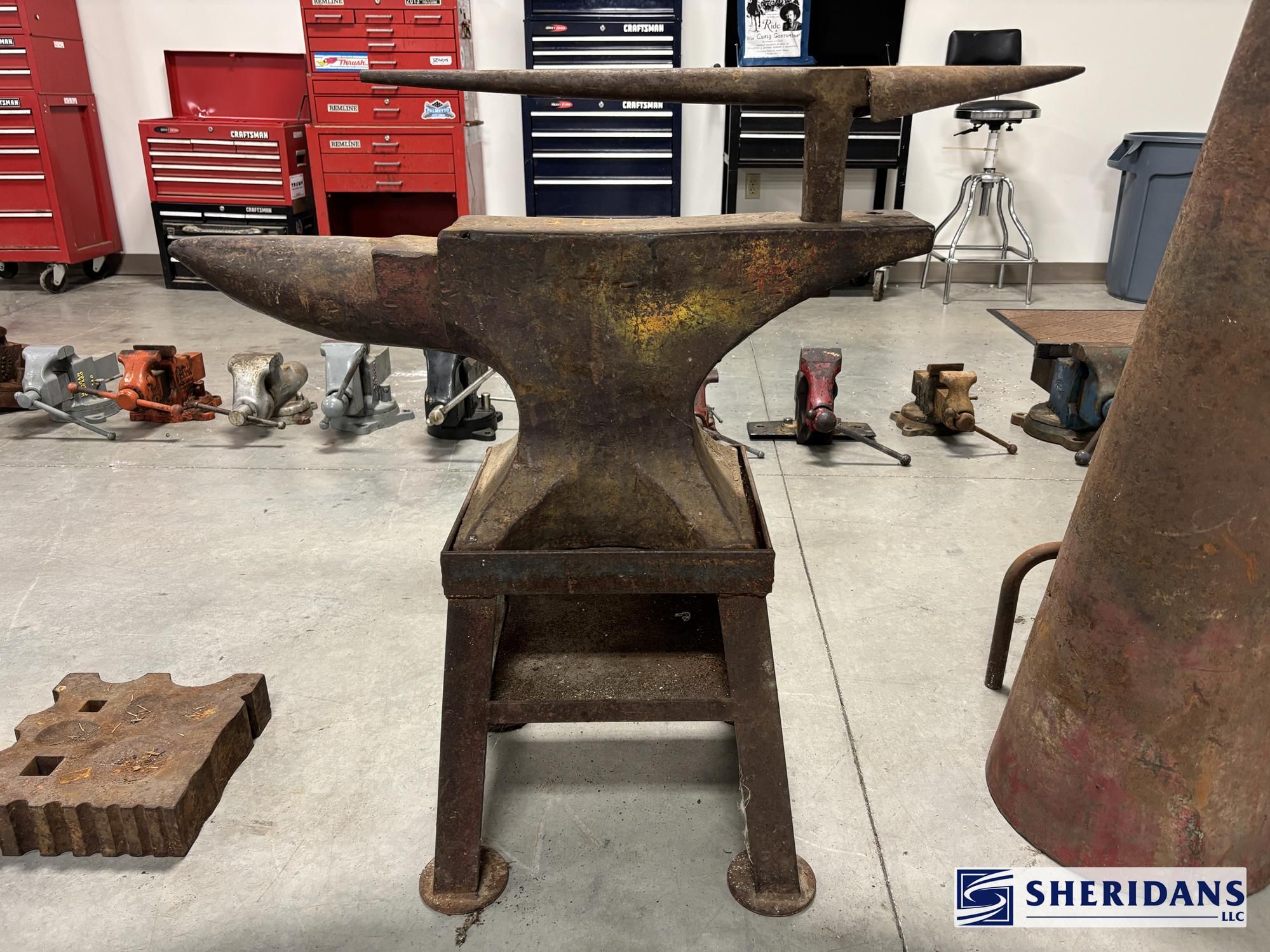 Blacksmithing: 230lb anvil w/stand; 165lb anvil w/ stand; 51” cone anvil; swage block; (20+) bench vises; (7) leg vises; miniature 11” leg vise; miniature vises; hardy tools; tongs; hammers; staking tools; (2) forges w/blower & books.