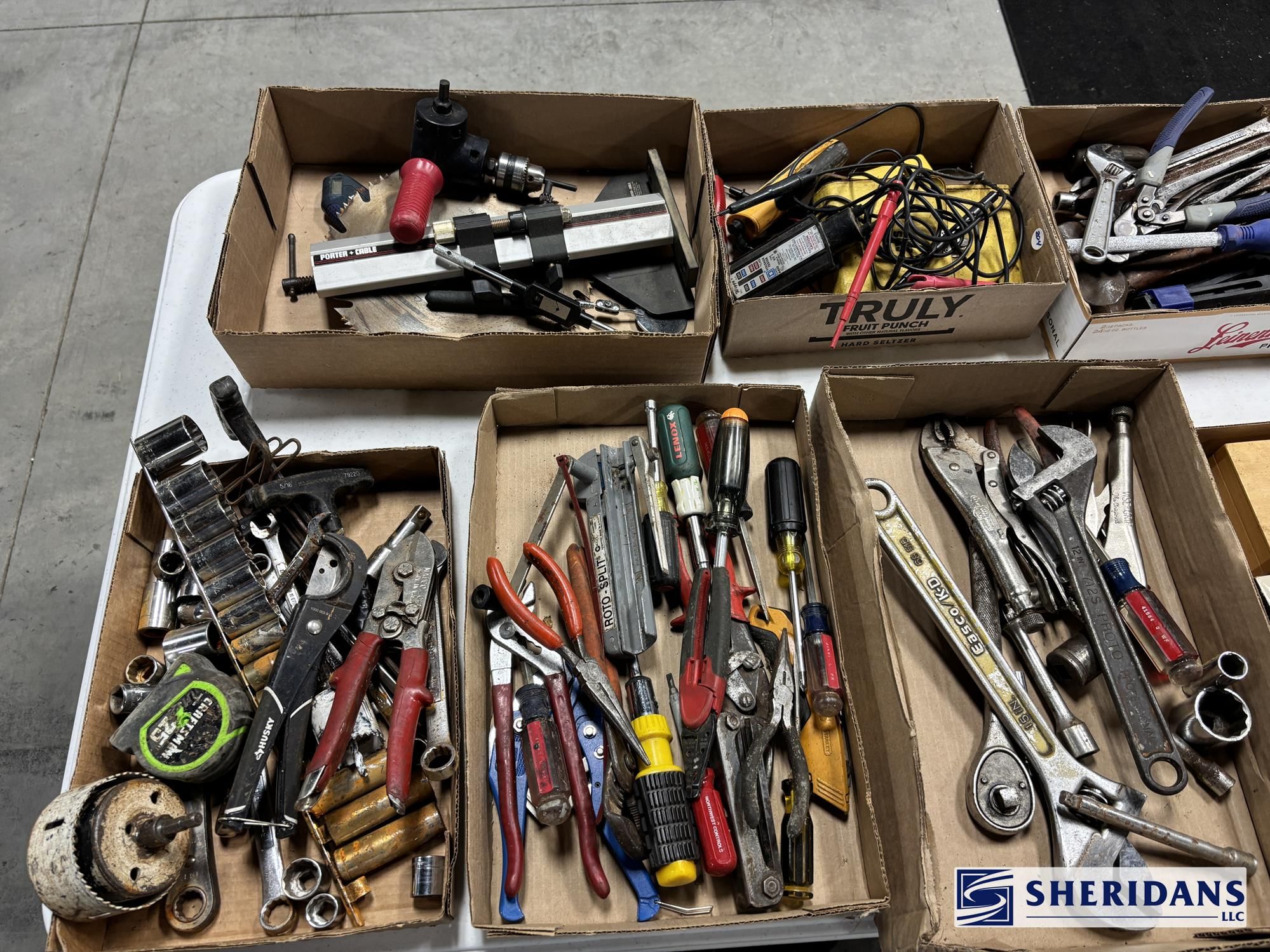 Hand Tools: Large amount of wrenches; hammers; ratchets; sockets; drill bits; machinist tools; levels; bar & C-clamps; quick clamps; router bits; pipe threaders; pipe clamps; drills; sanders; saws; porta power; portable band saw; ½” & ¾” Milwaukee hole hawg drills; Kreg plunge saw w/guide; routers; large amount of battery powered tools; several rolling & portable tool boxes; transit w/ tripod & stick; dovetail jigs; air tools; Paslode nailers & a large amount of other related items.