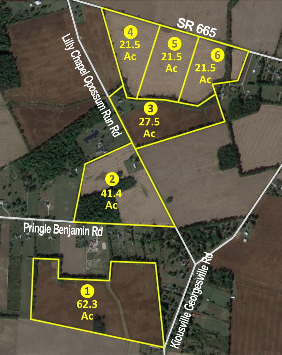 Down Payment:Purchaser(s) will deposit the following amounts as down payment with the Auction Company upon signing of Confirmation of Sale Agreement: Tract 1 - $35,000; Tract 2 - $30,000; Tract 3 - $25,000; Tract 4 - $15,000; Tract 5 - $15,000; Tract 6 - $15,000. Onsite Purchaser(s) will place deposit date of auction; online Purchaser(s) will place deposit within 24 hours of auction’s end. Balance will be due at closing.