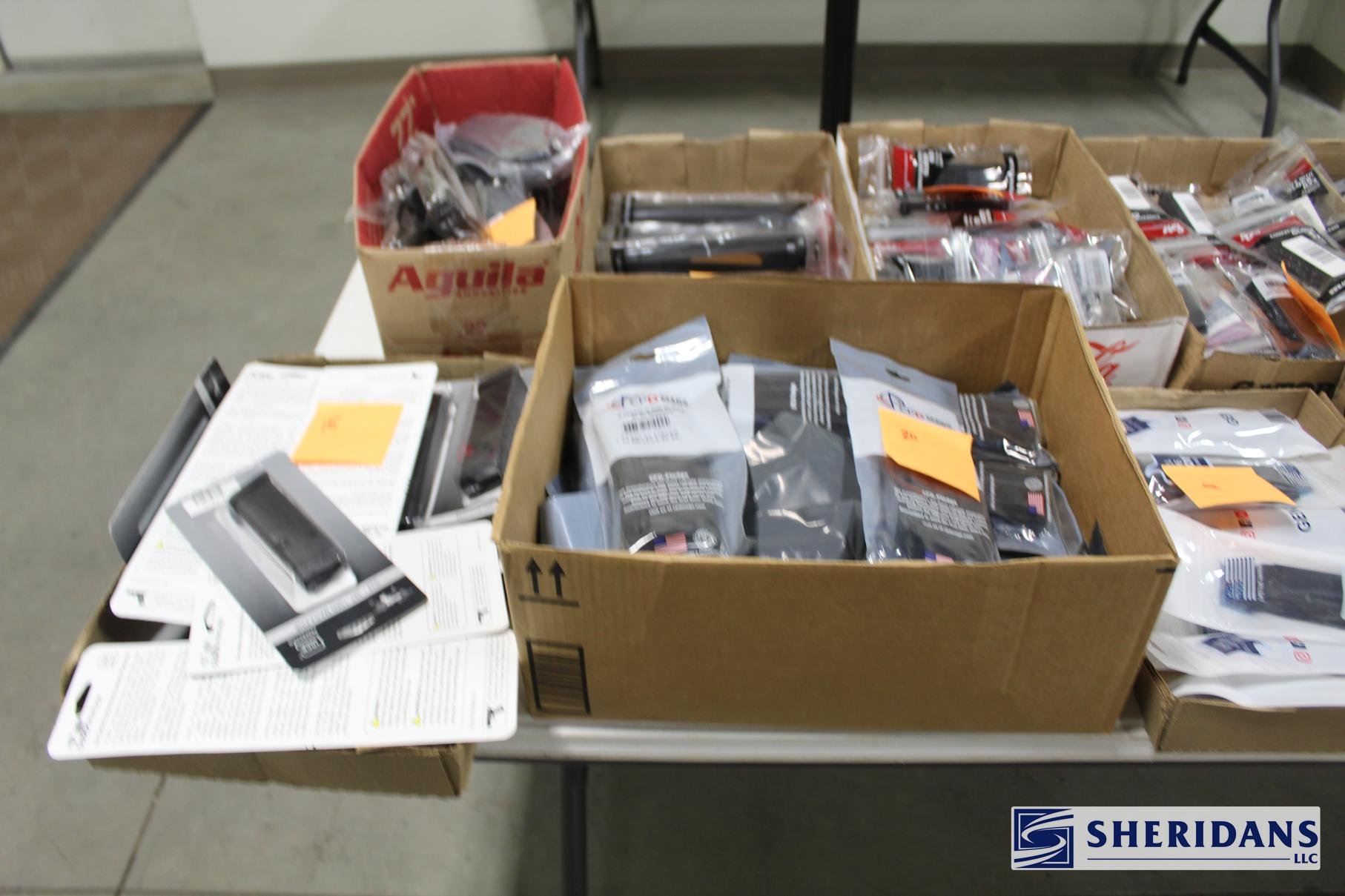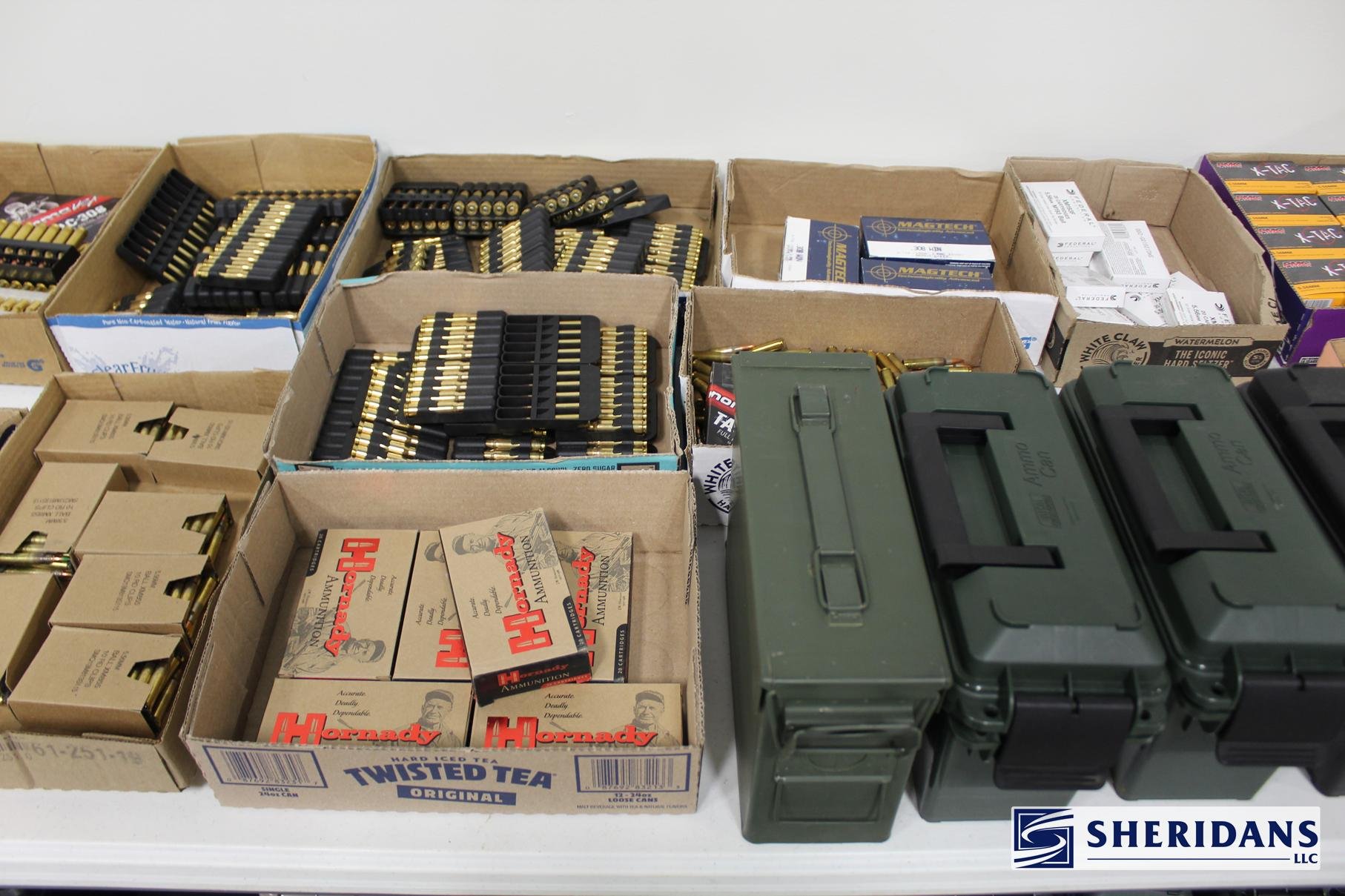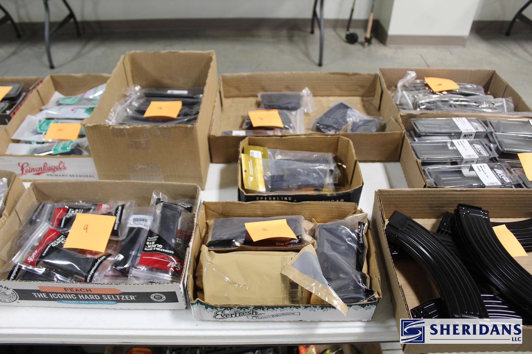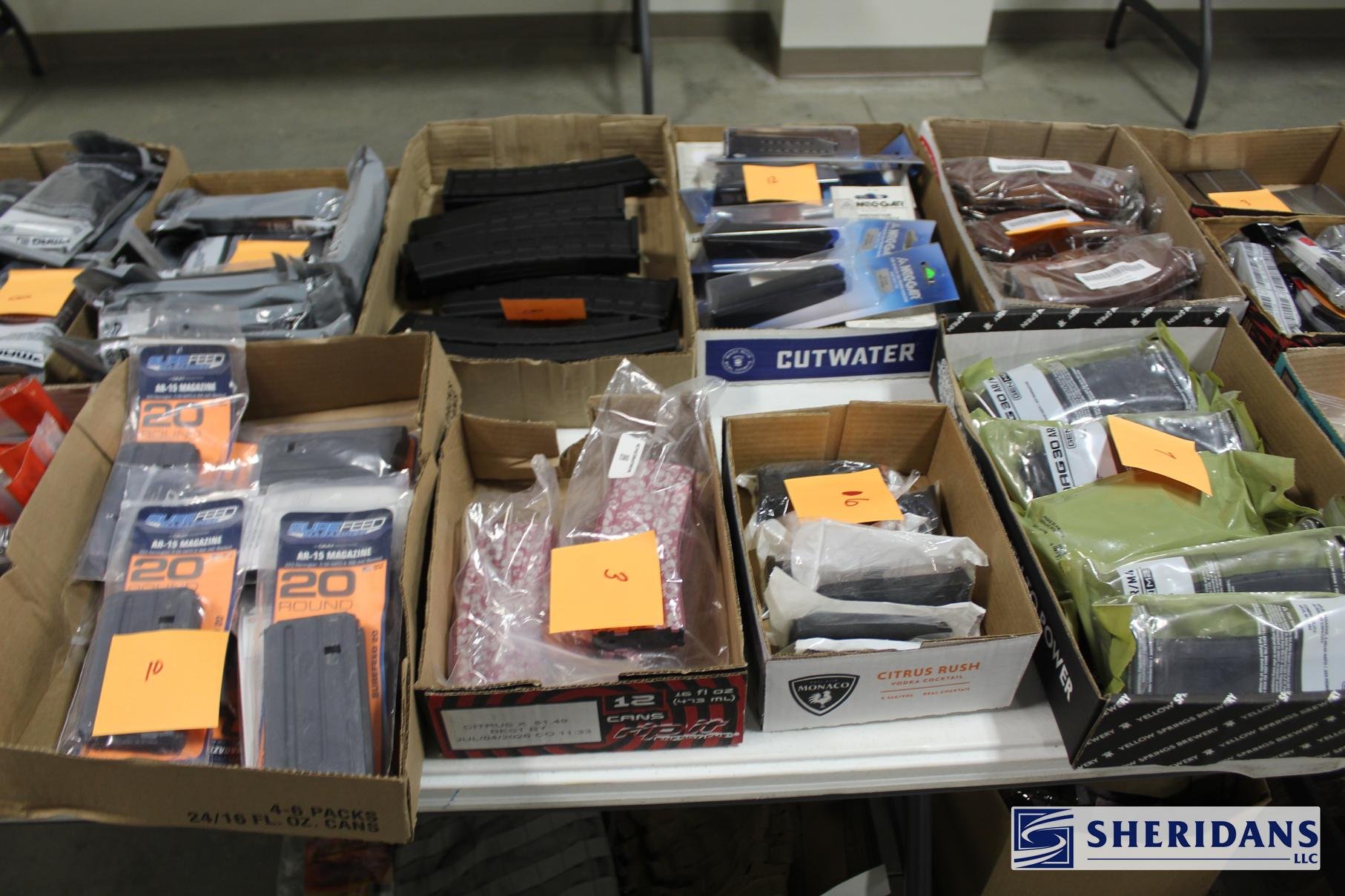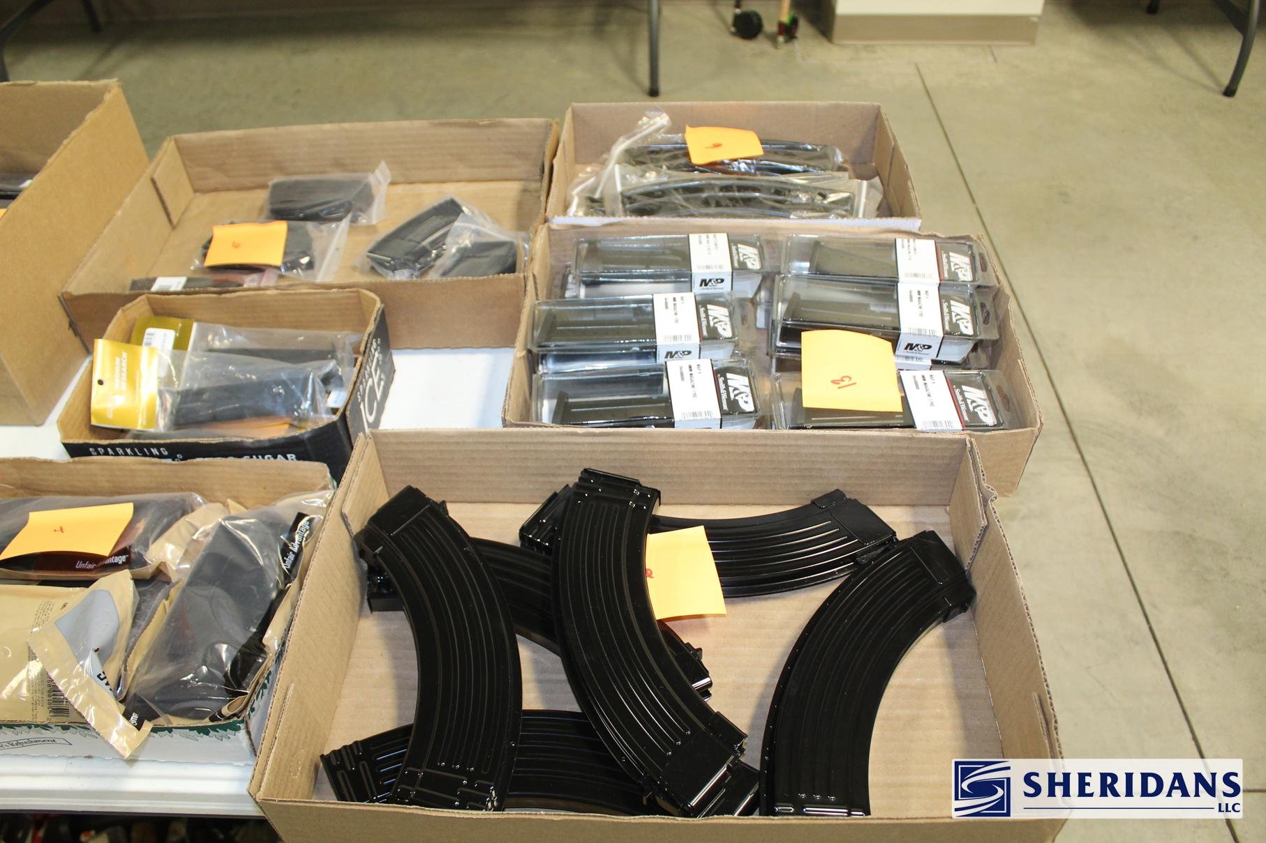 Ammunition & Firearm Accessories: Large selection of handgun, rifle, and shotgun ammunition including .22 LR, 9mm, .38 special, .357, .40 S&W, .45 auto, .45 colt, .308, .223/5.56, 7.62x39, 7.62x25, 9x18, 12 Ga, and .410; large assortment of handgun and rifle magazines (Glock, AR-15, AK, M&P, CZ, Beretta, .308); AR parts & accessories including upper receivers, lower parts kits, bolt carrier groups, buffer tubes, grips, rails, jigs, & armorer tools; Glock and pistol parts, barrels, and conversion barrels; gun cleaning kits, locks, cases, safes, slings, holsters, tactical gear, magazine pouches, ammo cans, optics, binoculars, spotting scopes, and range accessories; antique ammo boxes and vintage firearm-related items.