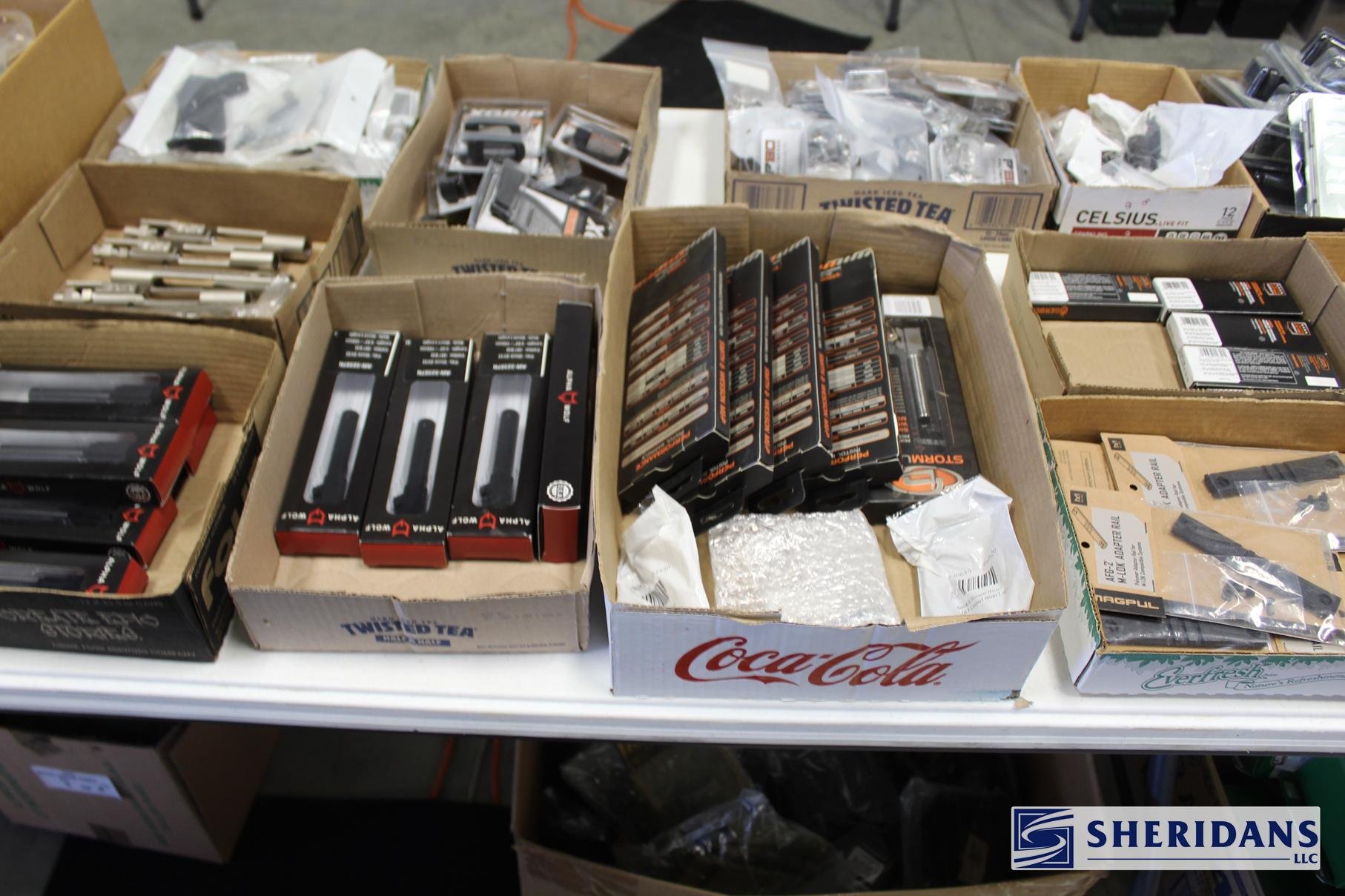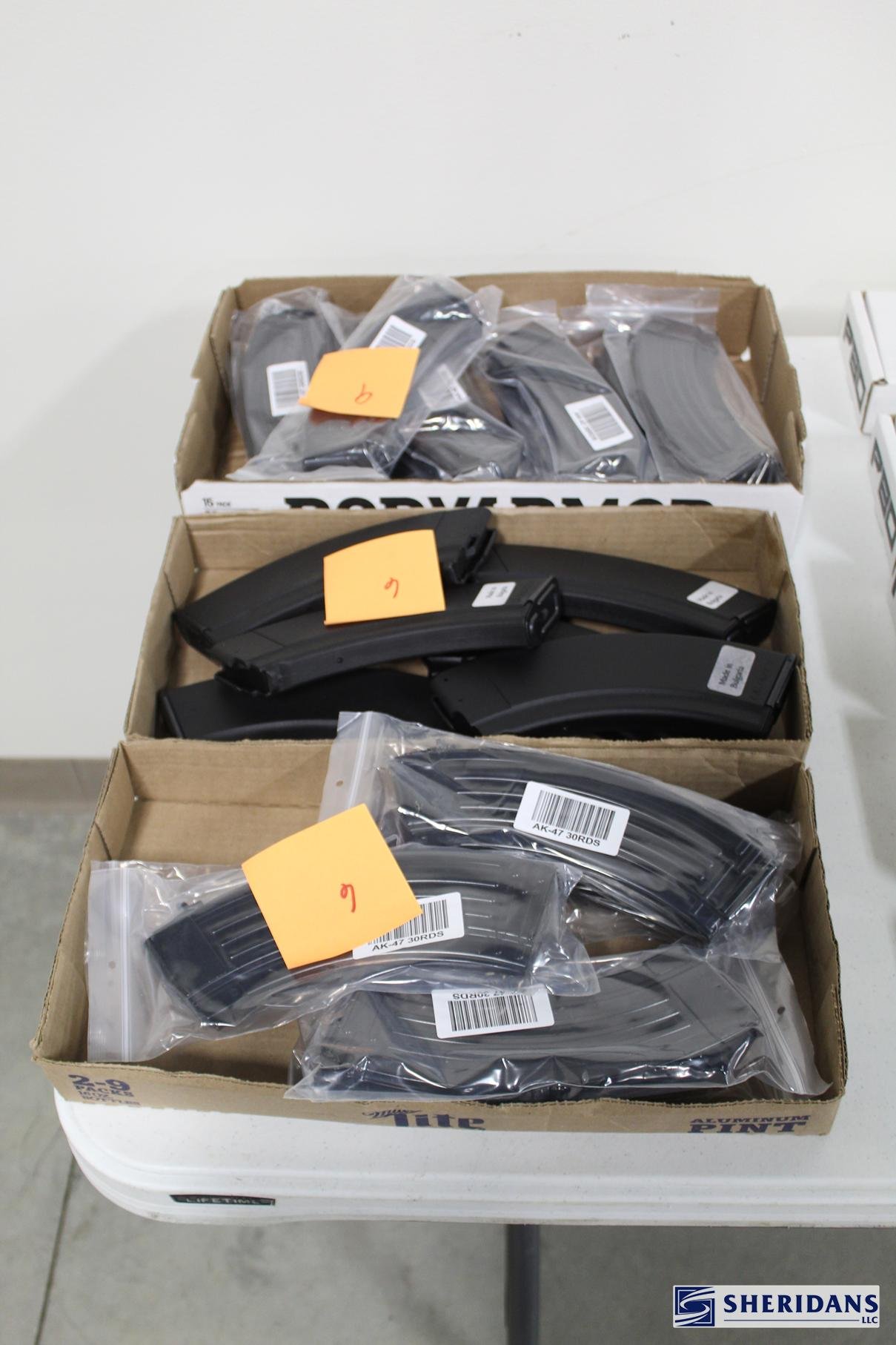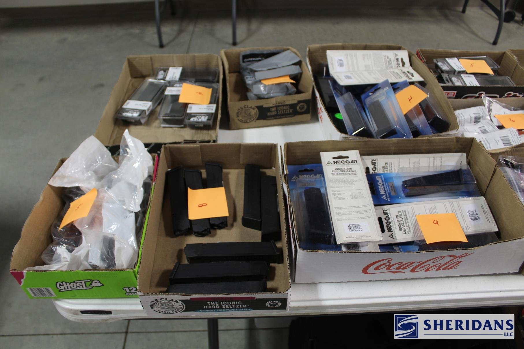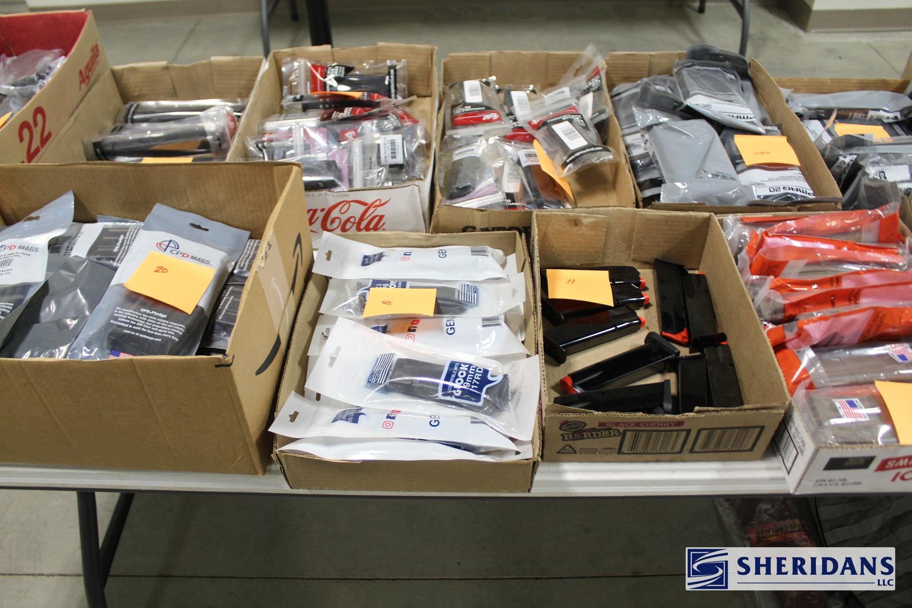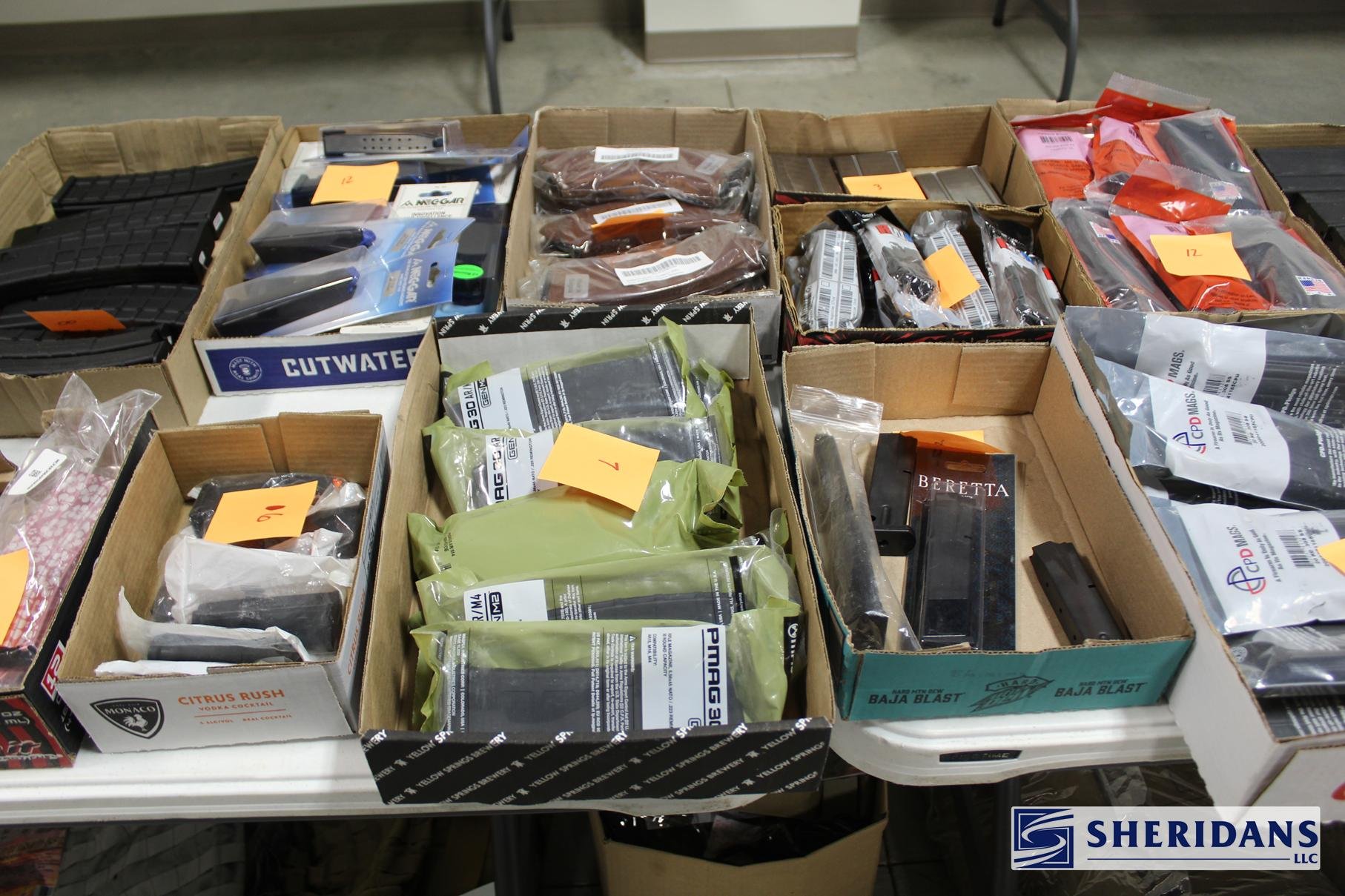 Ammunition & Firearm Accessories: Large selection of handgun, rifle, and shotgun ammunition including .22 LR, 9mm, .38 special, .357, .40 S&W, .45 auto, .45 colt, .308, .223/5.56, 7.62x39, 7.62x25, 9x18, 12 Ga, and .410; large assortment of handgun and rifle magazines (Glock, AR-15, AK, M&P, CZ, Beretta, .308); AR parts & accessories including upper receivers, lower parts kits, bolt carrier groups, buffer tubes, grips, rails, jigs, & armorer tools; Glock and pistol parts, barrels, and conversion barrels; gun cleaning kits, locks, cases, safes, slings, holsters, tactical gear, magazine pouches, ammo cans, optics, binoculars, spotting scopes, and range accessories; antique ammo boxes and vintage firearm-related items.