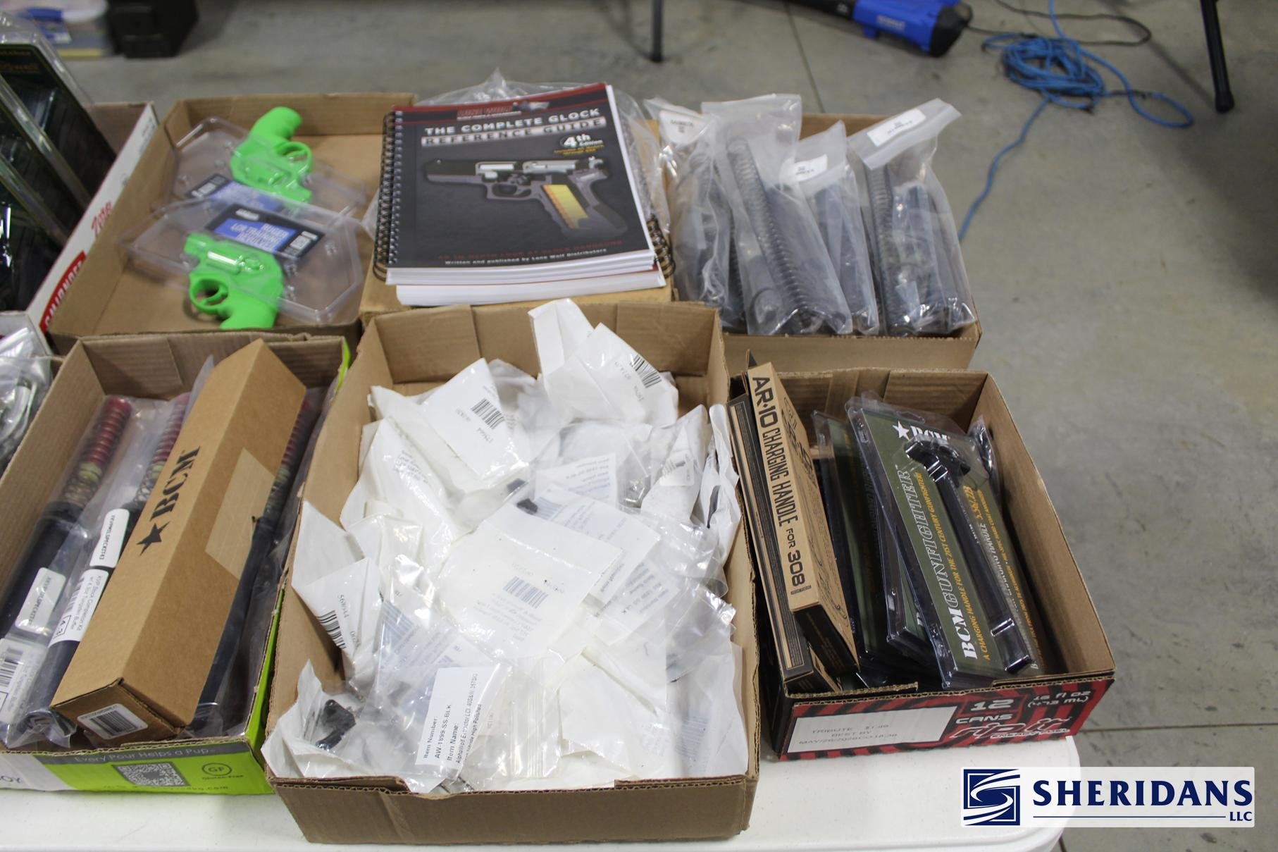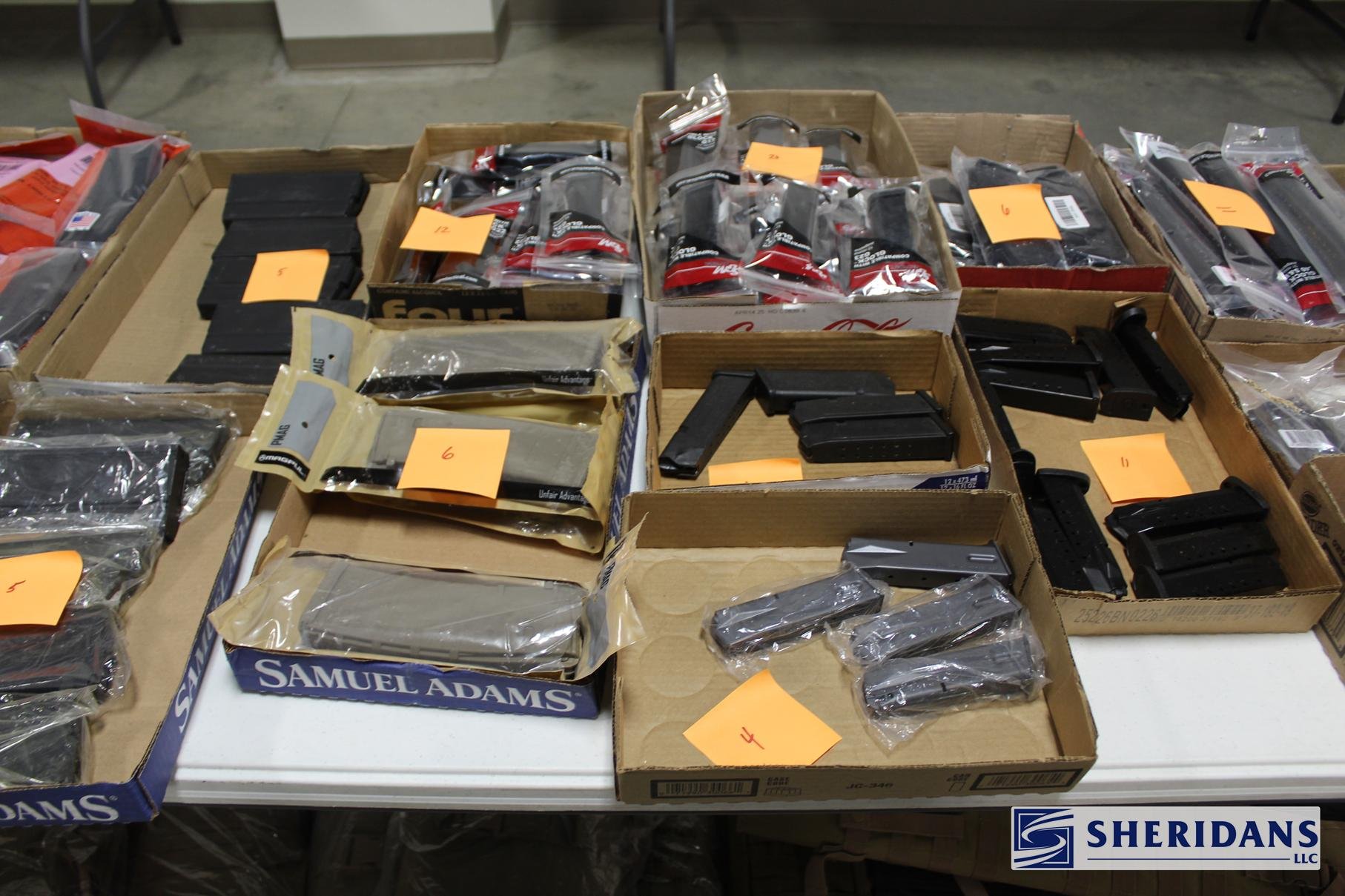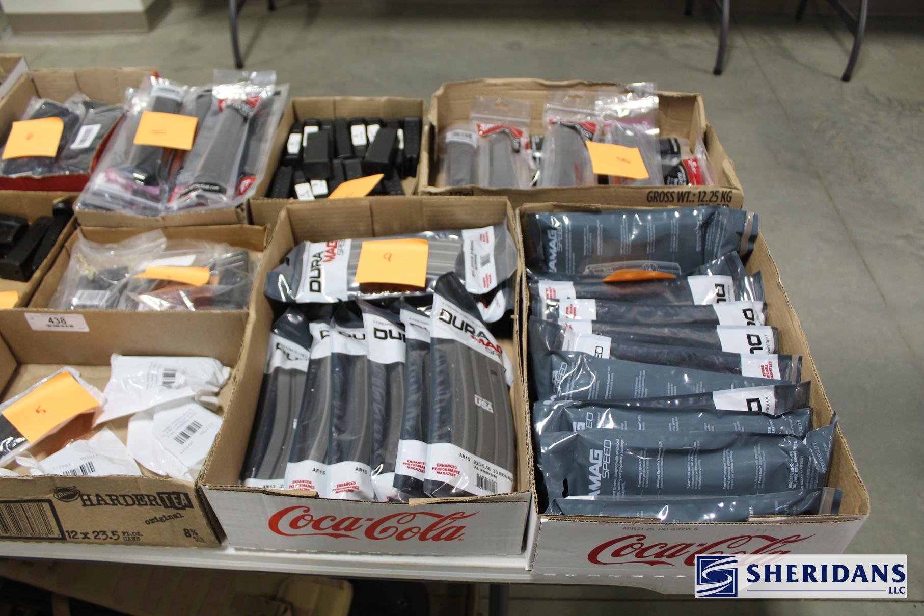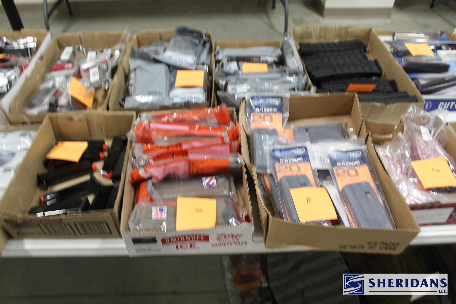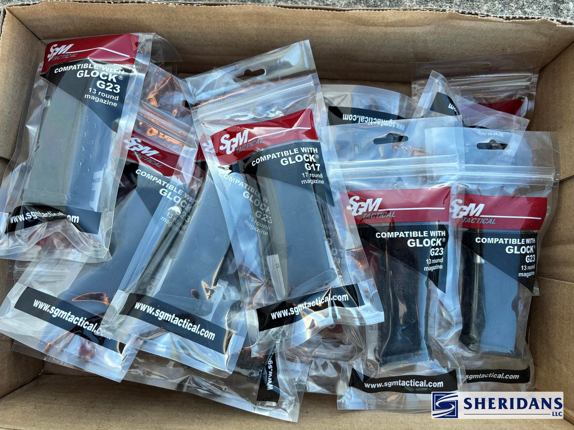 Ammunition & Firearm Accessories: Large selection of handgun, rifle, and shotgun ammunition including .22 LR, 9mm, .38 special, .357, .40 S&W, .45 auto, .45 colt, .308, .223/5.56, 7.62x39, 7.62x25, 9x18, 12 Ga, and .410; large assortment of handgun and rifle magazines (Glock, AR-15, AK, M&P, CZ, Beretta, .308); AR parts & accessories including upper receivers, lower parts kits, bolt carrier groups, buffer tubes, grips, rails, jigs, & armorer tools; Glock and pistol parts, barrels, and conversion barrels; gun cleaning kits, locks, cases, safes, slings, holsters, tactical gear, magazine pouches, ammo cans, optics, binoculars, spotting scopes, and range accessories; antique ammo boxes and vintage firearm-related items.