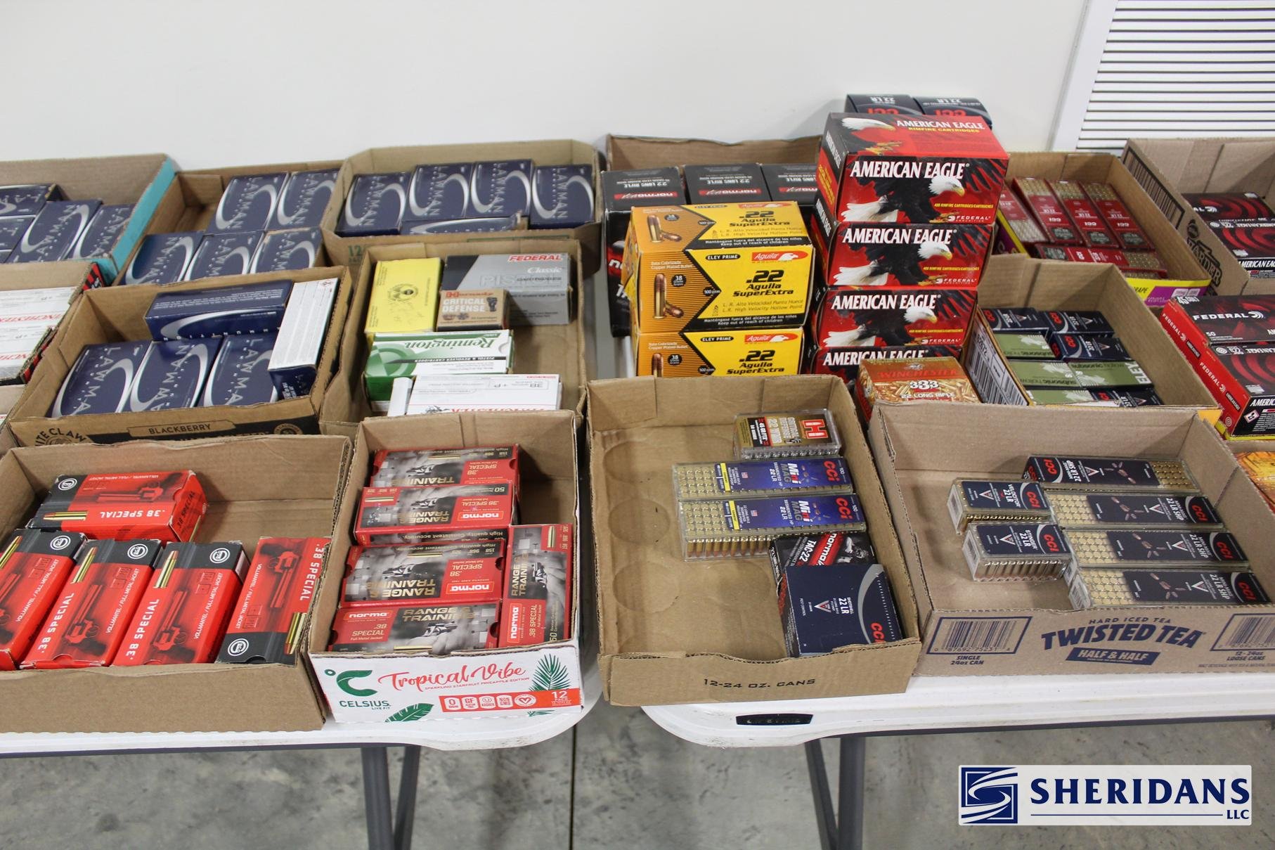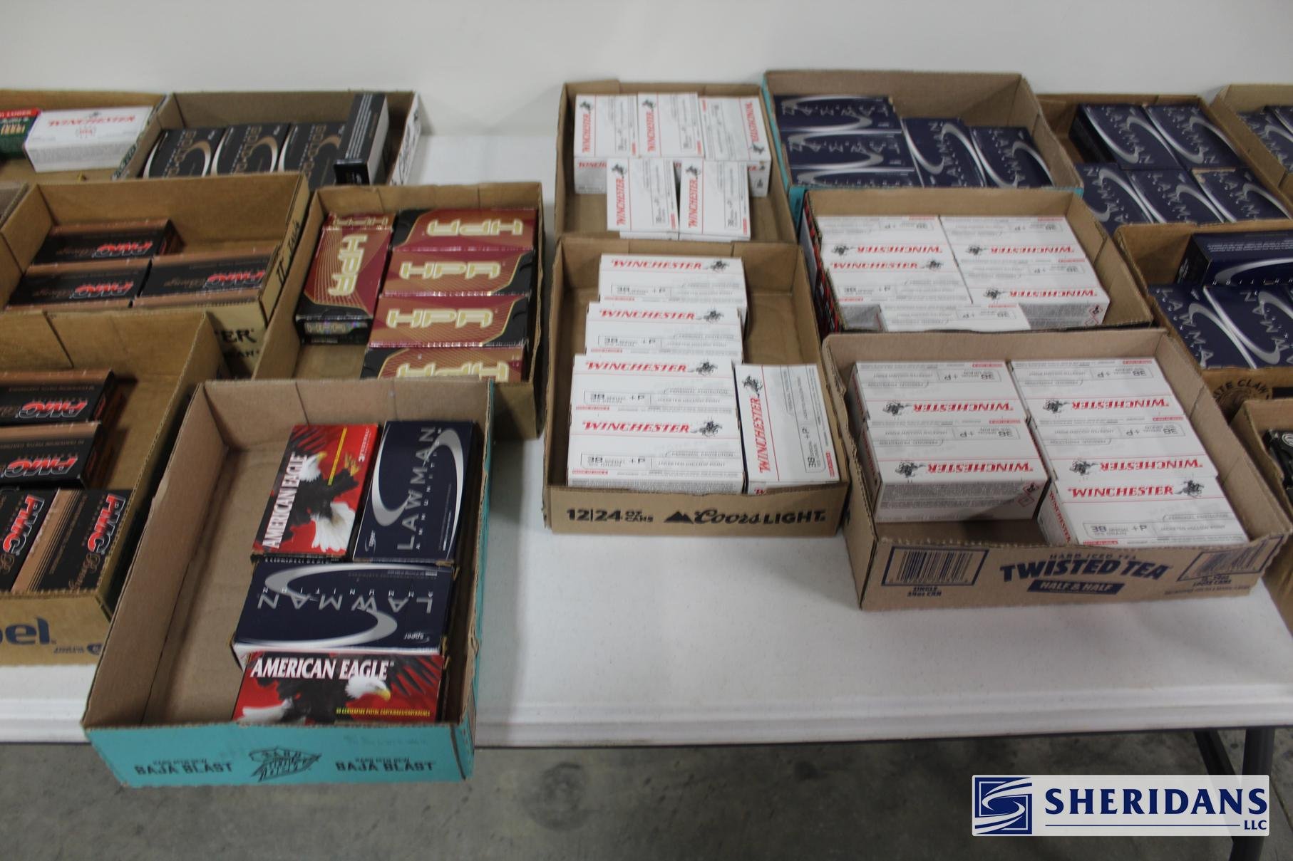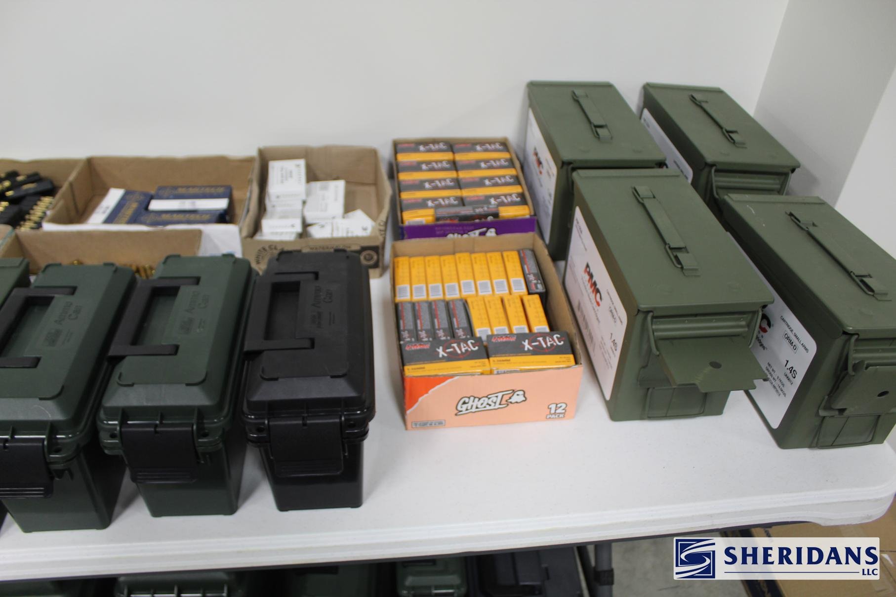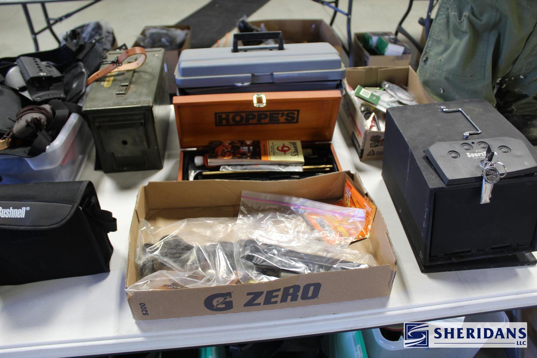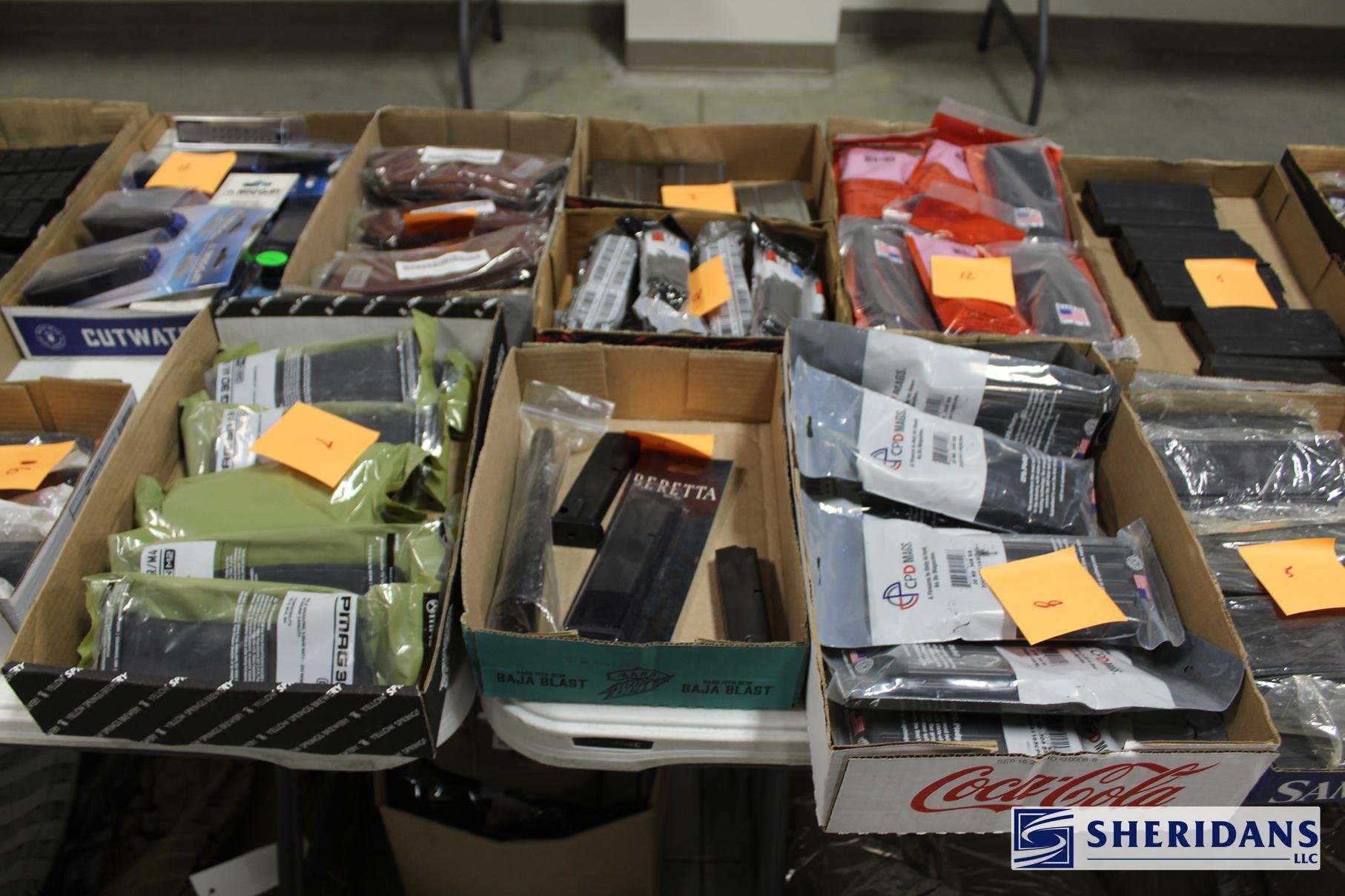 Ammunition & Firearm Accessories: Large selection of handgun, rifle, and shotgun ammunition including .22 LR, 9mm, .38 special, .357, .40 S&W, .45 auto, .45 colt, .308, .223/5.56, 7.62x39, 7.62x25, 9x18, 12 Ga, and .410; large assortment of handgun and rifle magazines (Glock, AR-15, AK, M&P, CZ, Beretta, .308); AR parts & accessories including upper receivers, lower parts kits, bolt carrier groups, buffer tubes, grips, rails, jigs, & armorer tools; Glock and pistol parts, barrels, and conversion barrels; gun cleaning kits, locks, cases, safes, slings, holsters, tactical gear, magazine pouches, ammo cans, optics, binoculars, spotting scopes, and range accessories; antique ammo boxes and vintage firearm-related items.