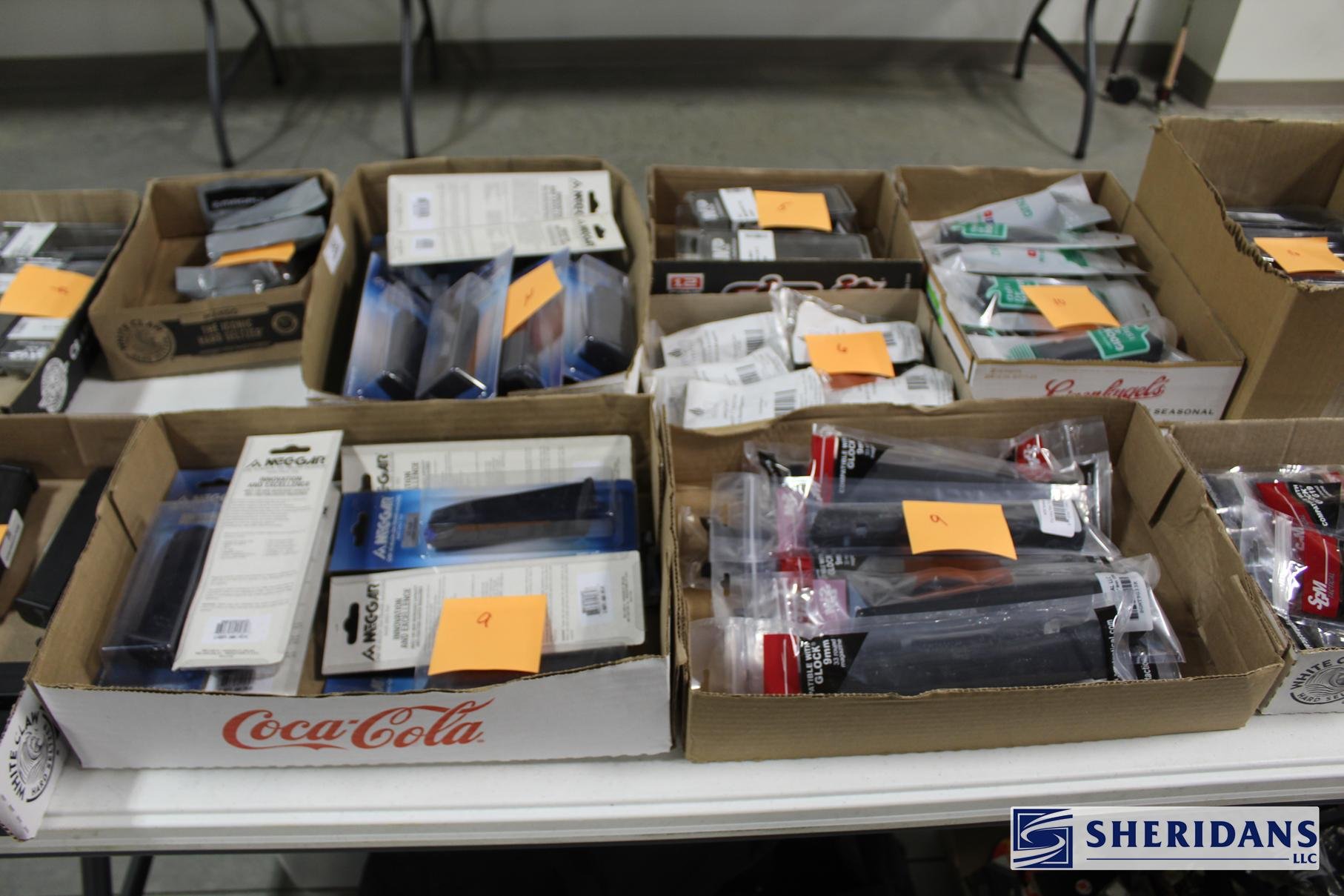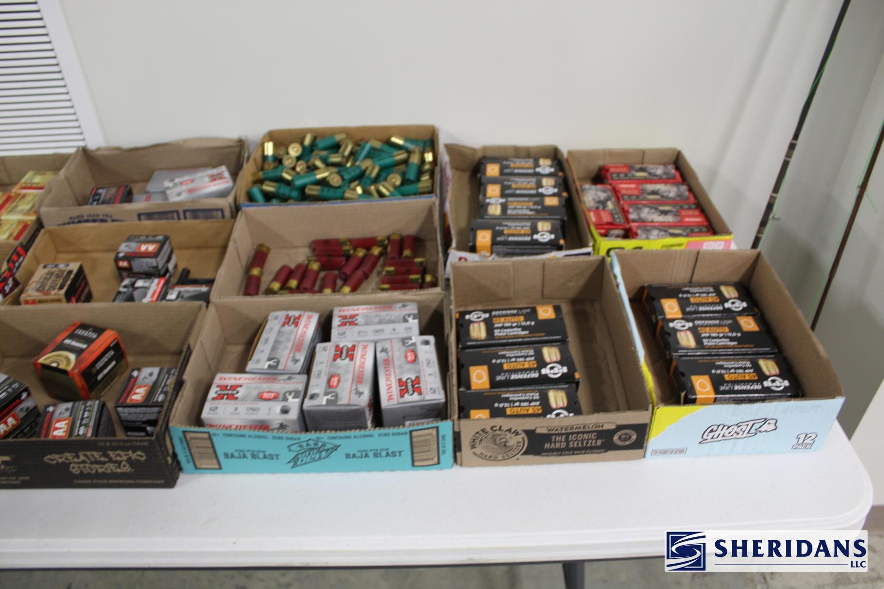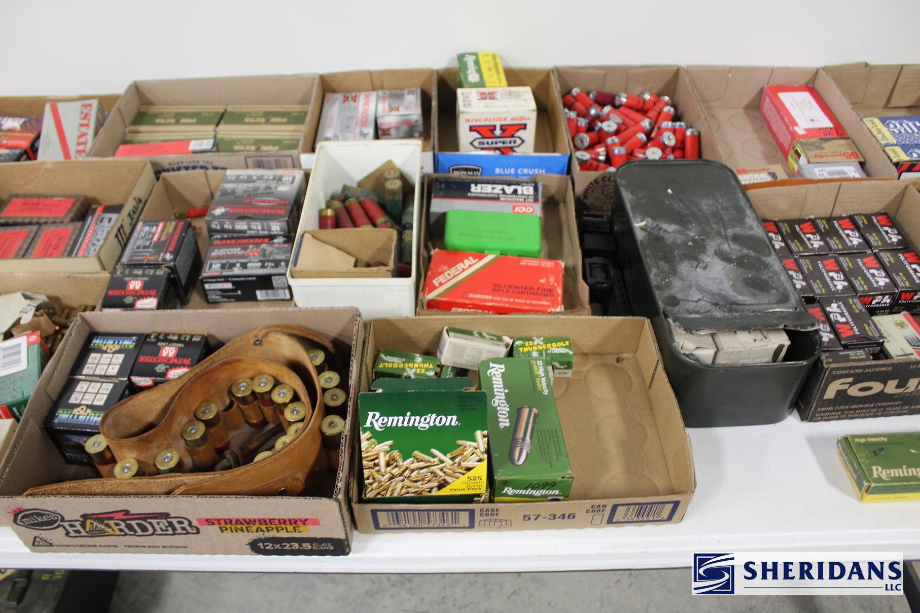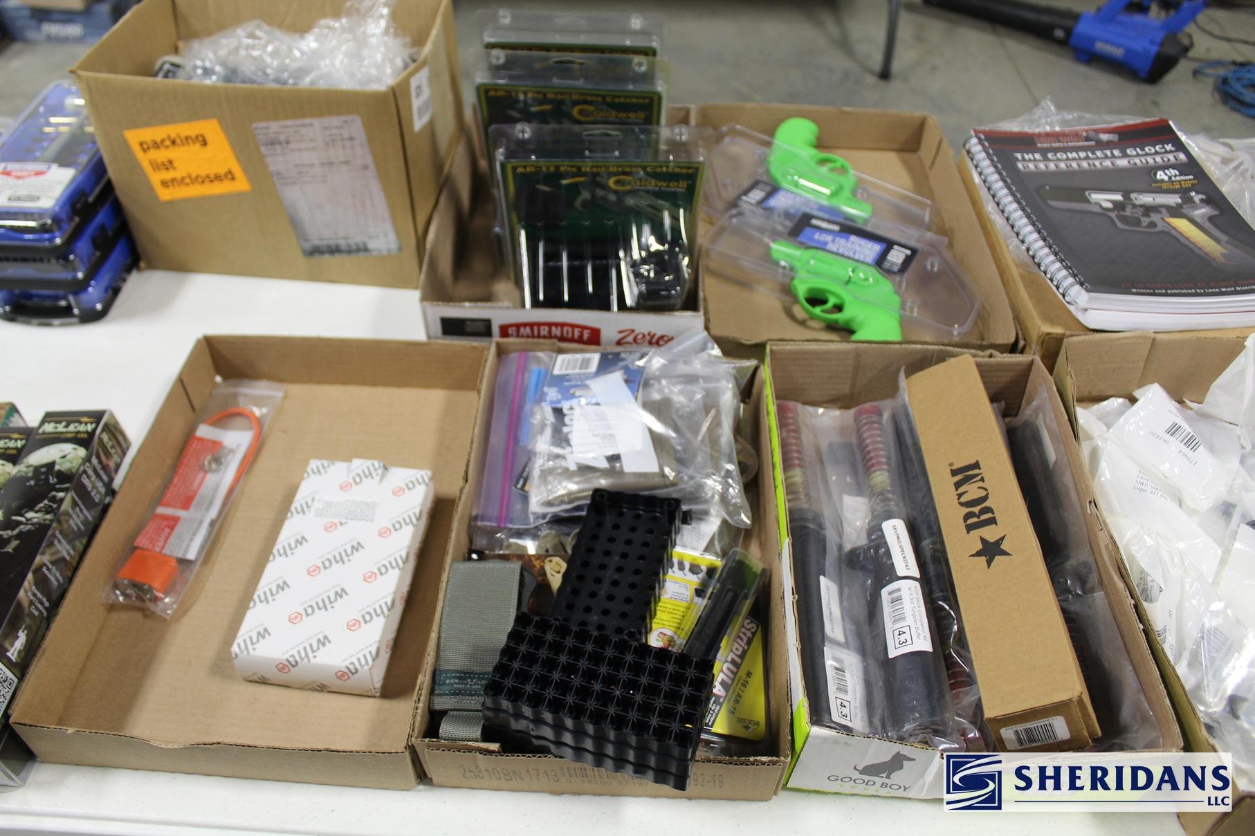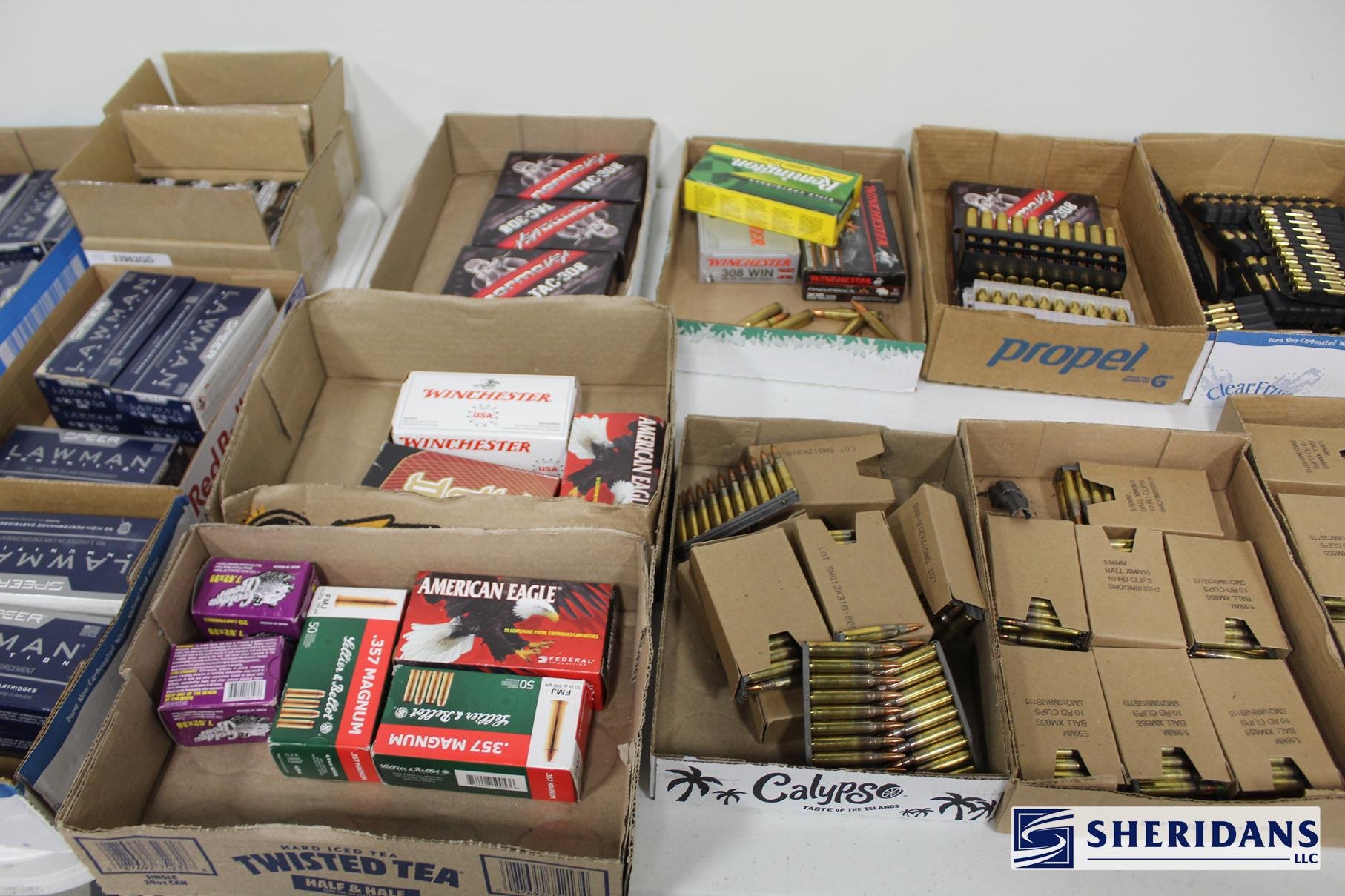 Ammunition & Firearm Accessories: Large selection of handgun, rifle, and shotgun ammunition including .22 LR, 9mm, .38 special, .357, .40 S&W, .45 auto, .45 colt, .308, .223/5.56, 7.62x39, 7.62x25, 9x18, 12 Ga, and .410; large assortment of handgun and rifle magazines (Glock, AR-15, AK, M&P, CZ, Beretta, .308); AR parts & accessories including upper receivers, lower parts kits, bolt carrier groups, buffer tubes, grips, rails, jigs, & armorer tools; Glock and pistol parts, barrels, and conversion barrels; gun cleaning kits, locks, cases, safes, slings, holsters, tactical gear, magazine pouches, ammo cans, optics, binoculars, spotting scopes, and range accessories; antique ammo boxes and vintage firearm-related items.