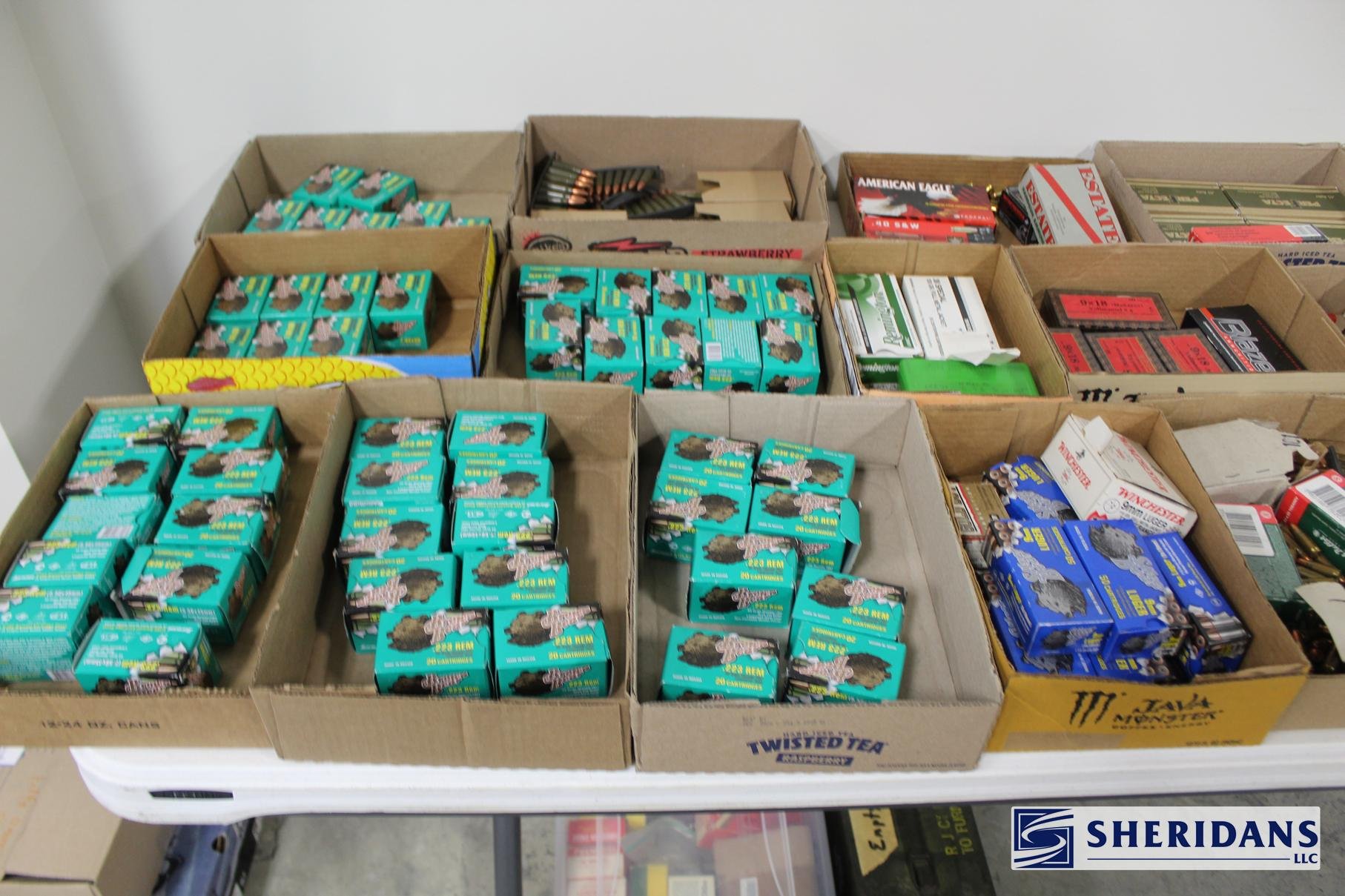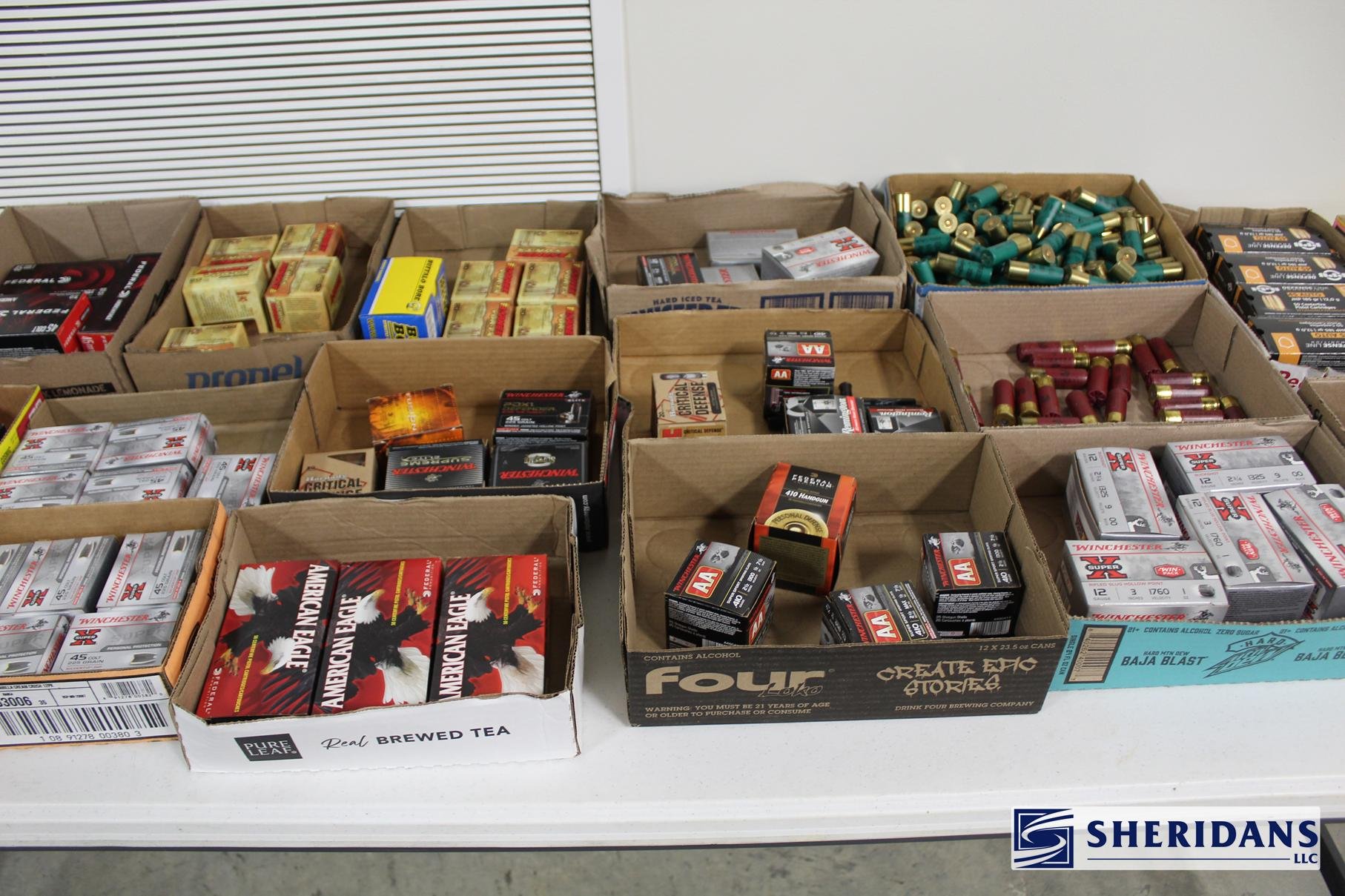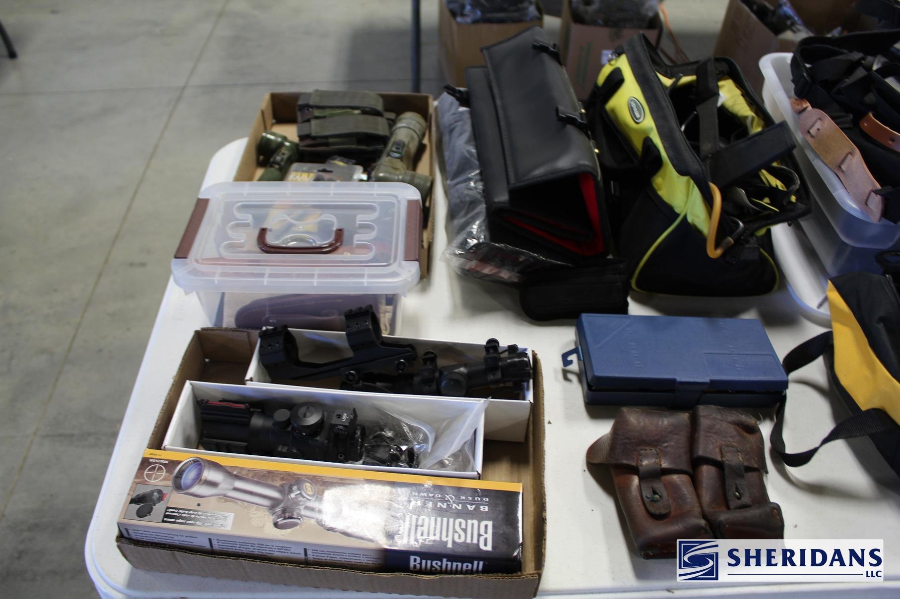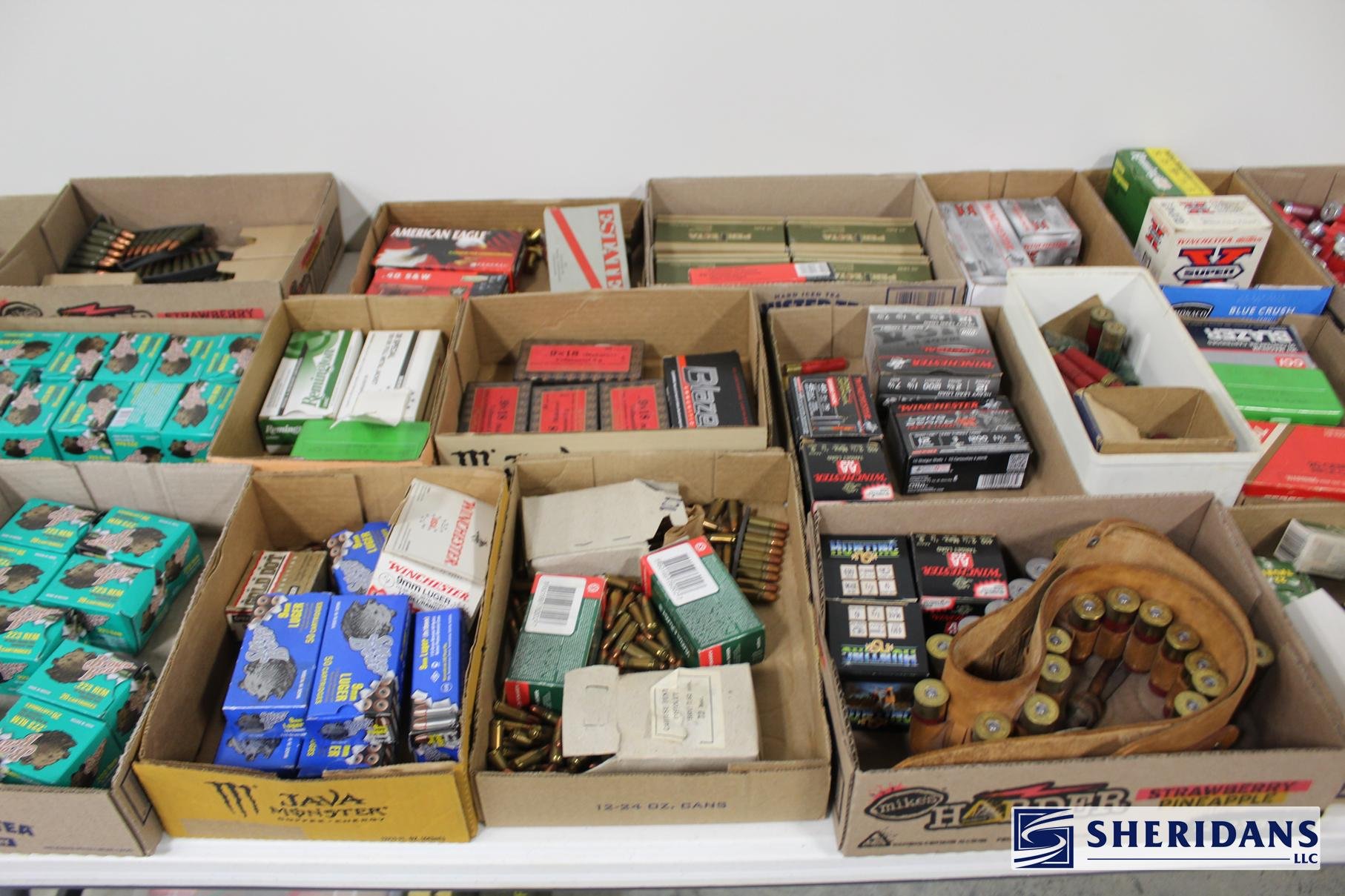 Ammunition & Firearm Accessories: Large selection of handgun, rifle, and shotgun ammunition including .22 LR, 9mm, .38 special, .357, .40 S&W, .45 auto, .45 colt, .308, .223/5.56, 7.62x39, 7.62x25, 9x18, 12 Ga, and .410; large assortment of handgun and rifle magazines (Glock, AR-15, AK, M&P, CZ, Beretta, .308); AR parts & accessories including upper receivers, lower parts kits, bolt carrier groups, buffer tubes, grips, rails, jigs, & armorer tools; Glock and pistol parts, barrels, and conversion barrels; gun cleaning kits, locks, cases, safes, slings, holsters, tactical gear, magazine pouches, ammo cans, optics, binoculars, spotting scopes, and range accessories; antique ammo boxes and vintage firearm-related items.