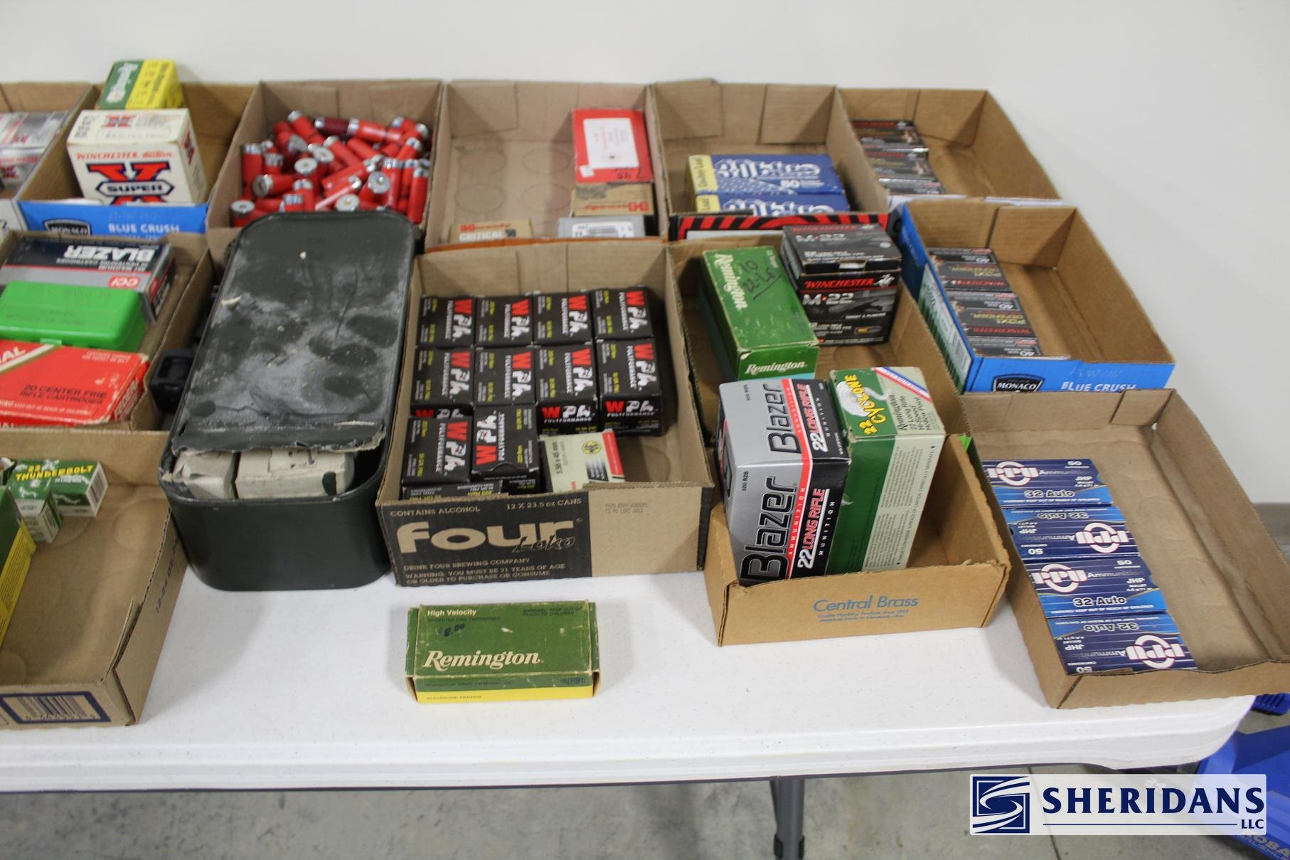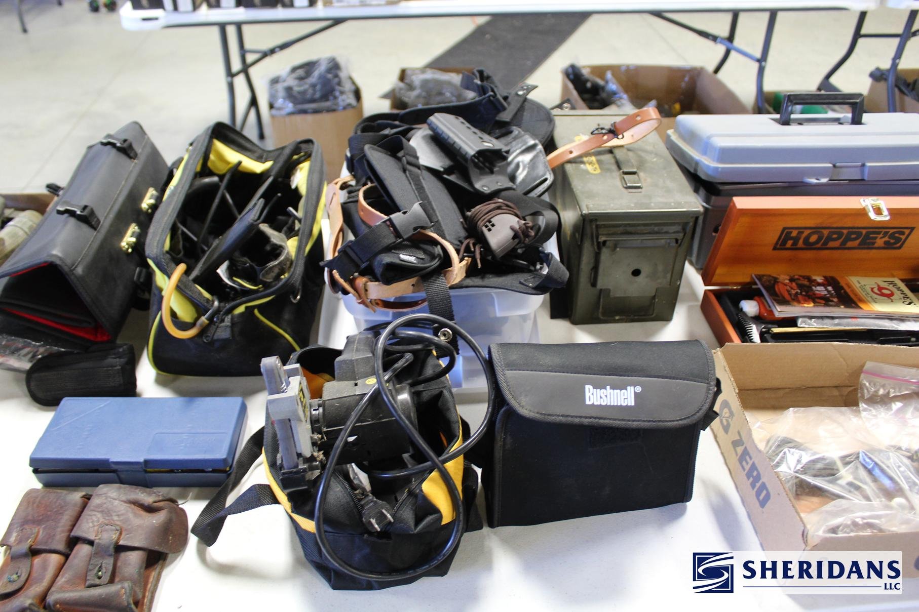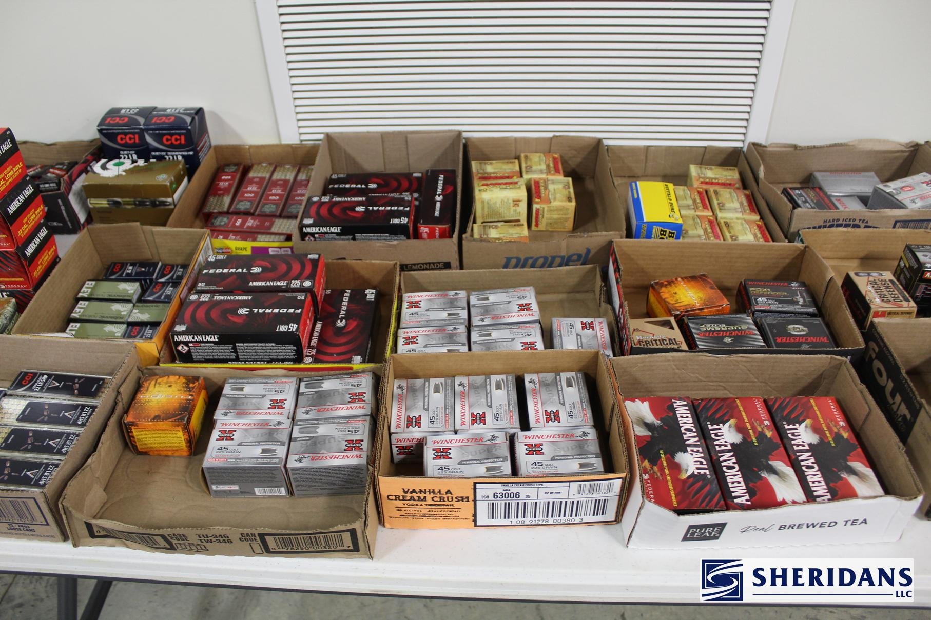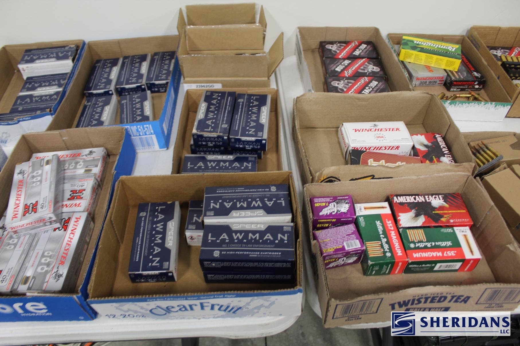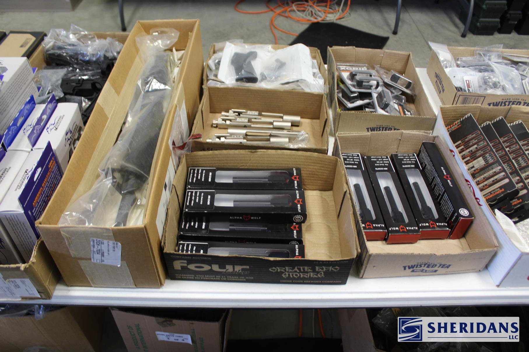 Ammunition & Firearm Accessories: Large selection of handgun, rifle, and shotgun ammunition including .22 LR, 9mm, .38 special, .357, .40 S&W, .45 auto, .45 colt, .308, .223/5.56, 7.62x39, 7.62x25, 9x18, 12 Ga, and .410; large assortment of handgun and rifle magazines (Glock, AR-15, AK, M&P, CZ, Beretta, .308); AR parts & accessories including upper receivers, lower parts kits, bolt carrier groups, buffer tubes, grips, rails, jigs, & armorer tools; Glock and pistol parts, barrels, and conversion barrels; gun cleaning kits, locks, cases, safes, slings, holsters, tactical gear, magazine pouches, ammo cans, optics, binoculars, spotting scopes, and range accessories; antique ammo boxes and vintage firearm-related items.