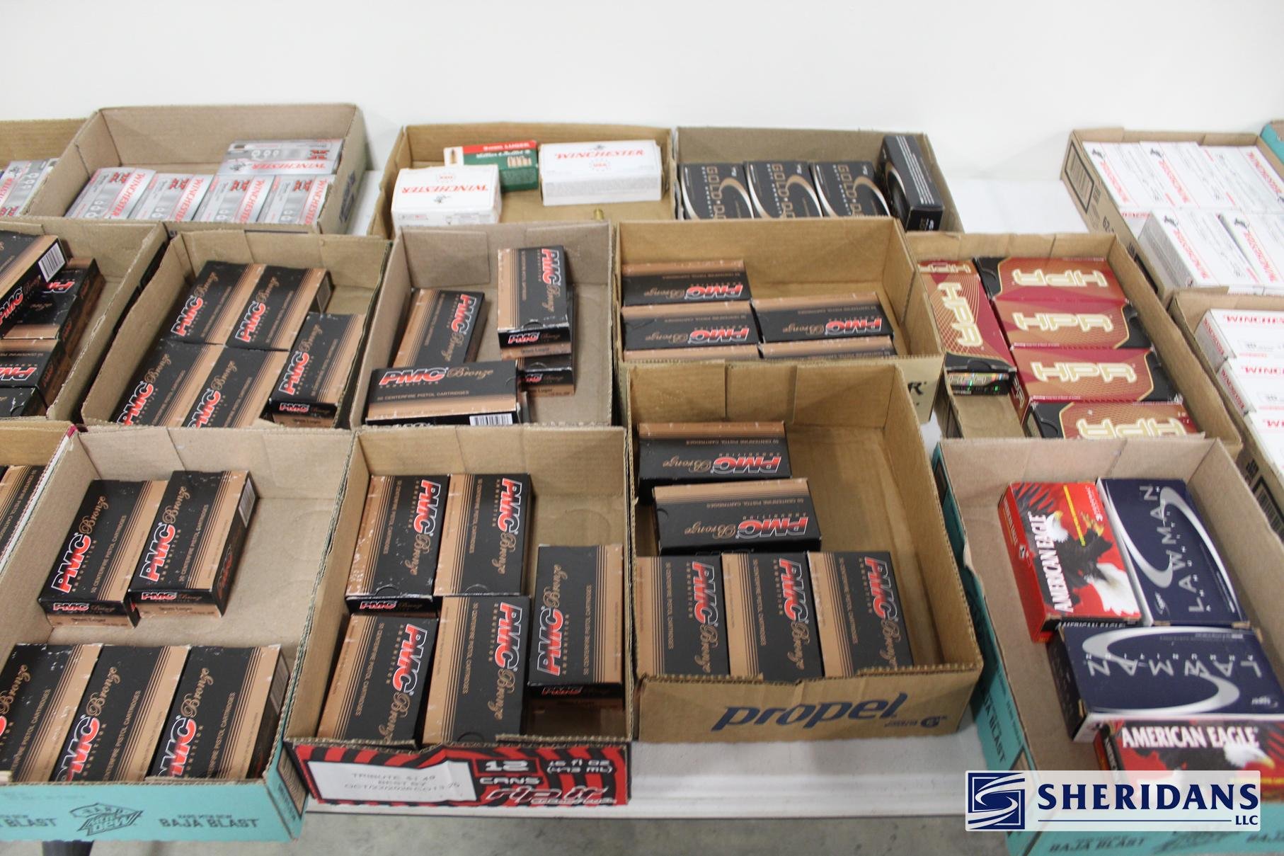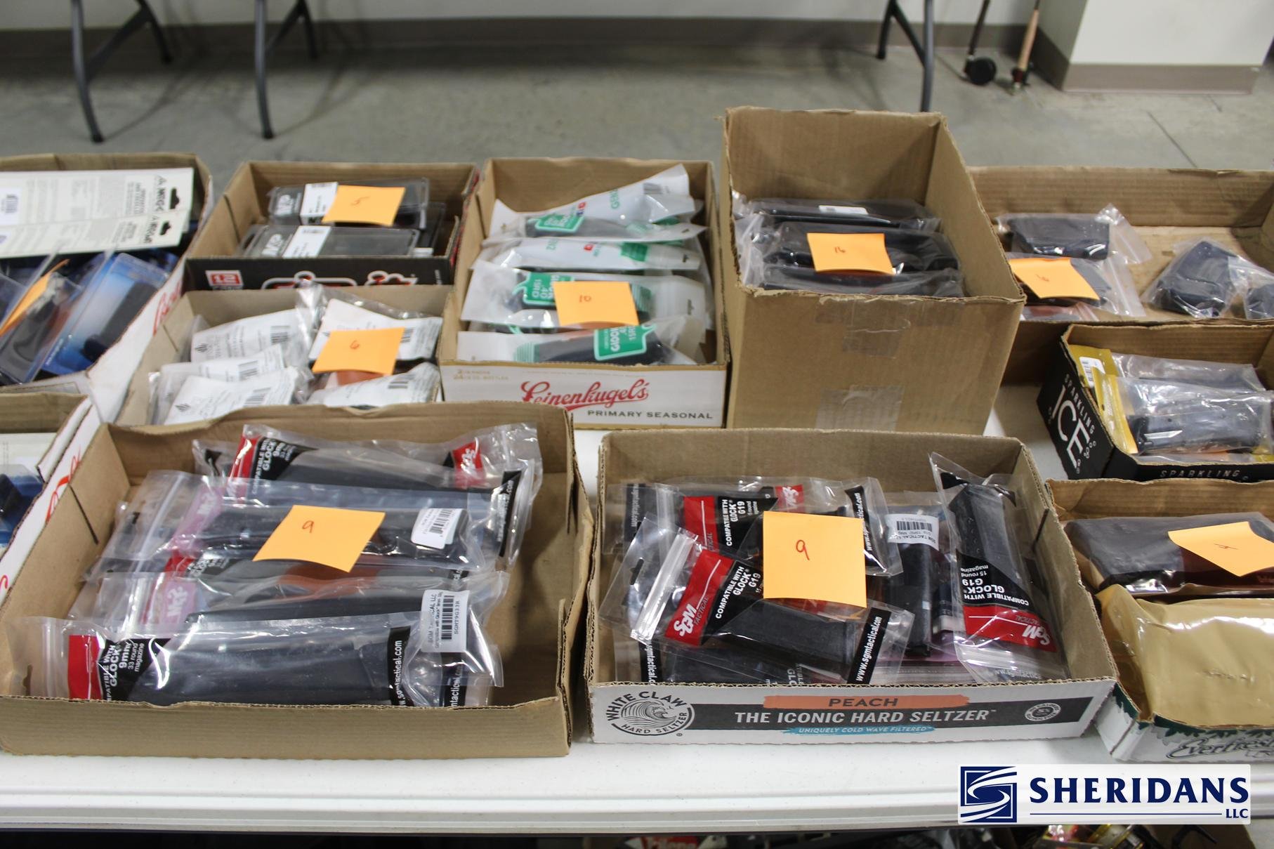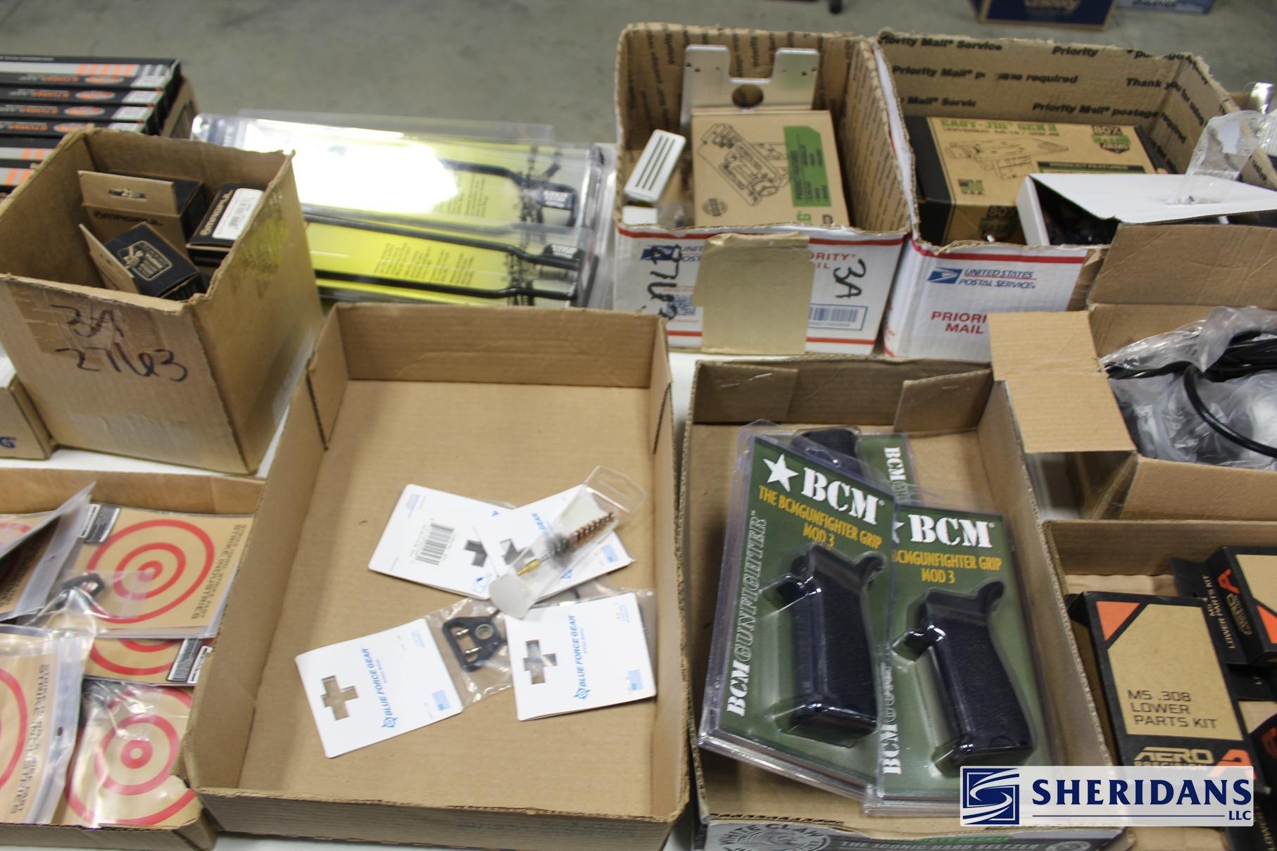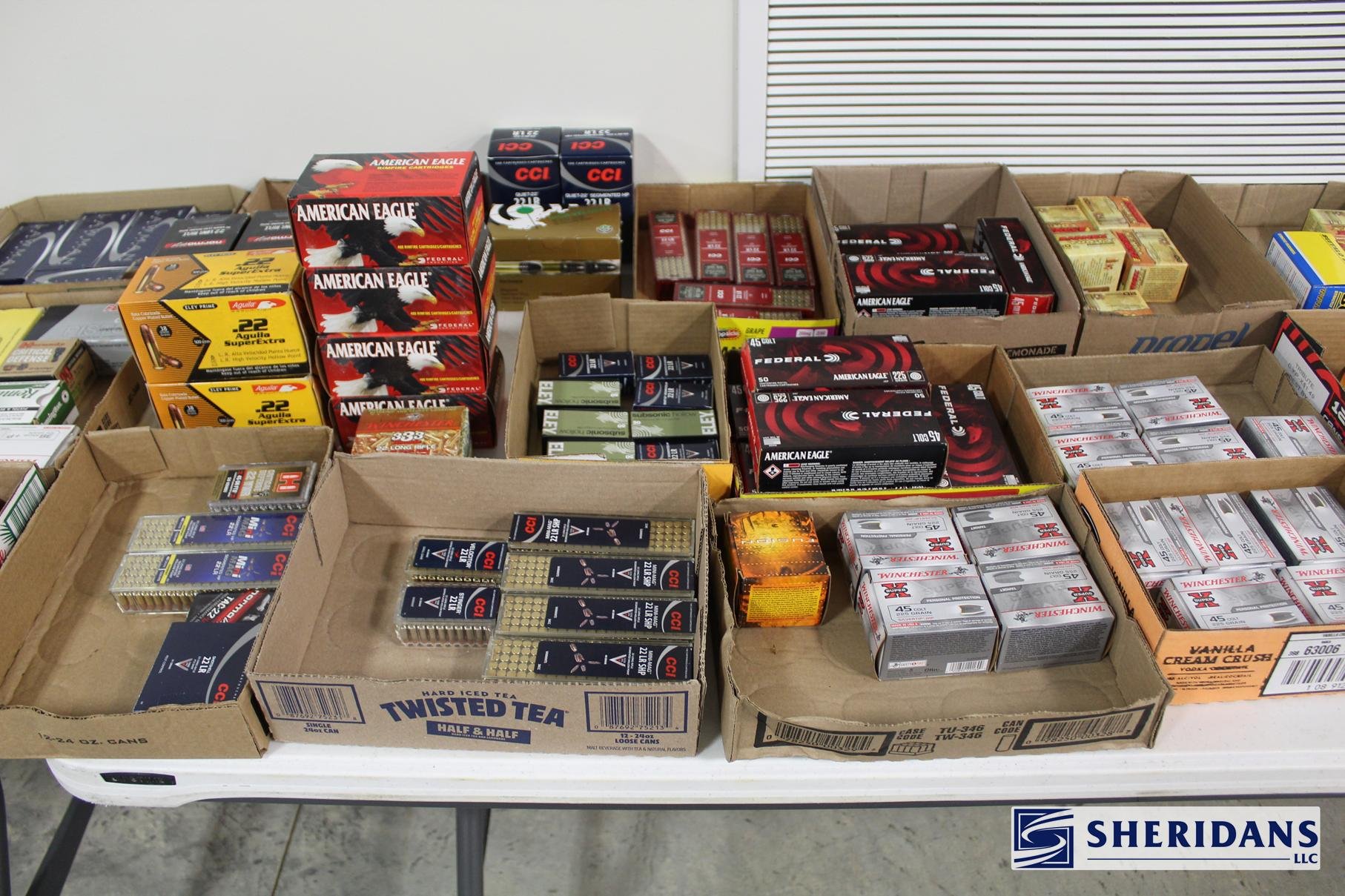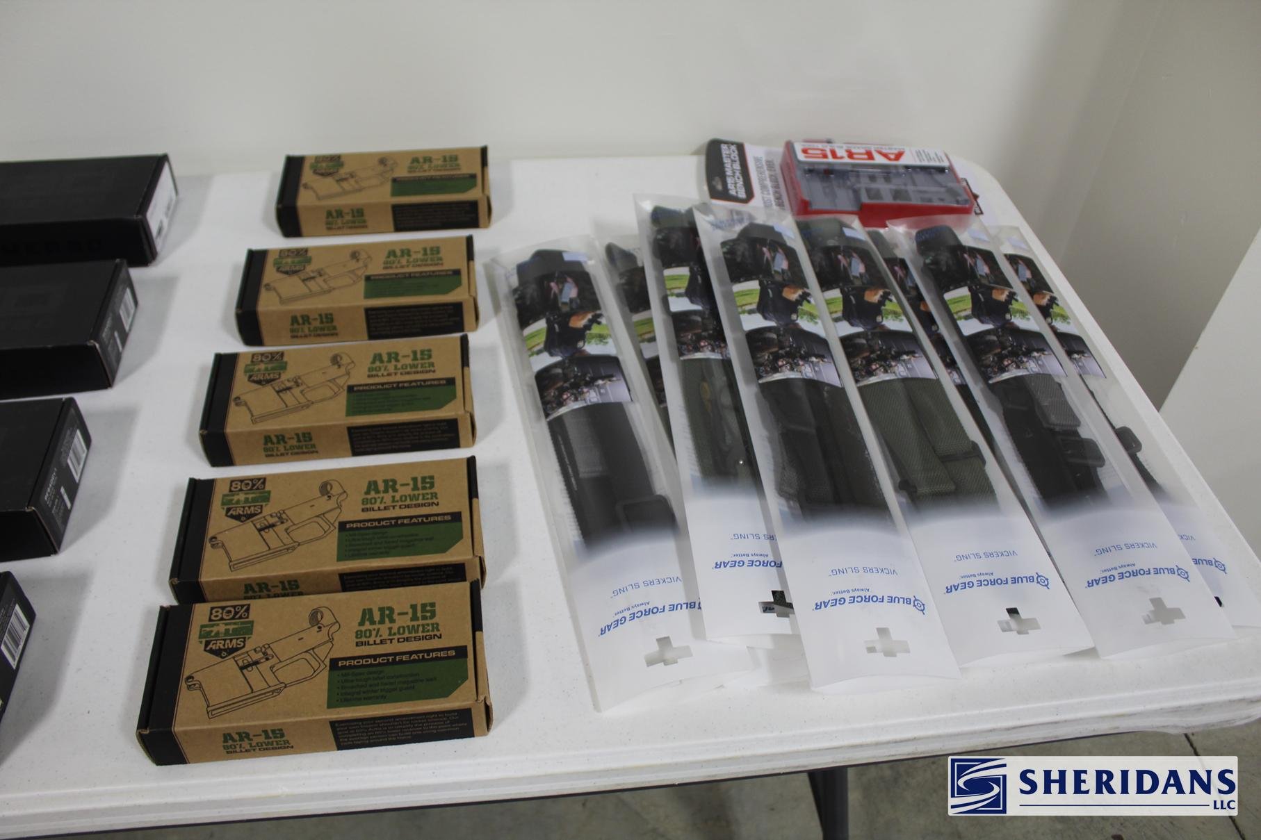 Ammunition & Firearm Accessories: Large selection of handgun, rifle, and shotgun ammunition including .22 LR, 9mm, .38 special, .357, .40 S&W, .45 auto, .45 colt, .308, .223/5.56, 7.62x39, 7.62x25, 9x18, 12 Ga, and .410; large assortment of handgun and rifle magazines (Glock, AR-15, AK, M&P, CZ, Beretta, .308); AR parts & accessories including upper receivers, lower parts kits, bolt carrier groups, buffer tubes, grips, rails, jigs, & armorer tools; Glock and pistol parts, barrels, and conversion barrels; gun cleaning kits, locks, cases, safes, slings, holsters, tactical gear, magazine pouches, ammo cans, optics, binoculars, spotting scopes, and range accessories; antique ammo boxes and vintage firearm-related items.