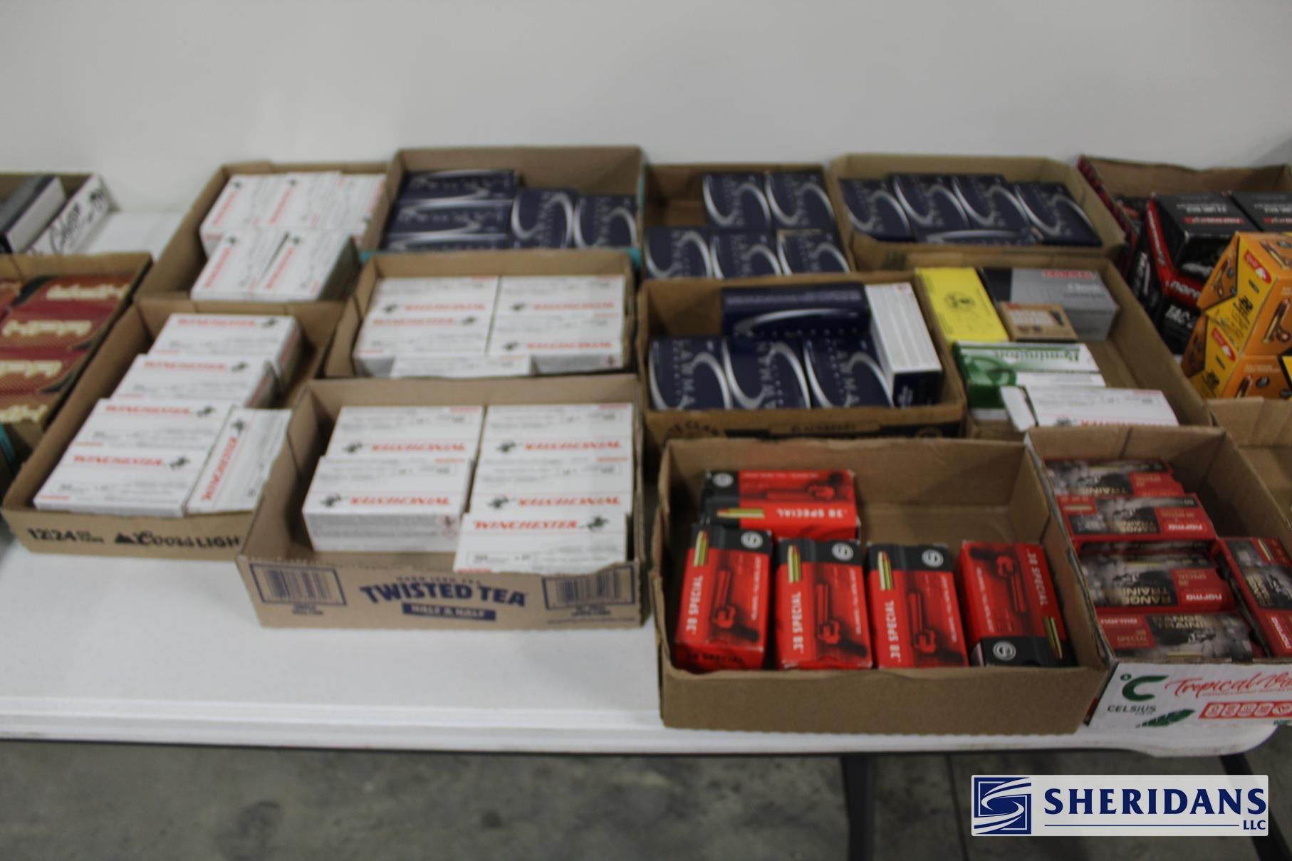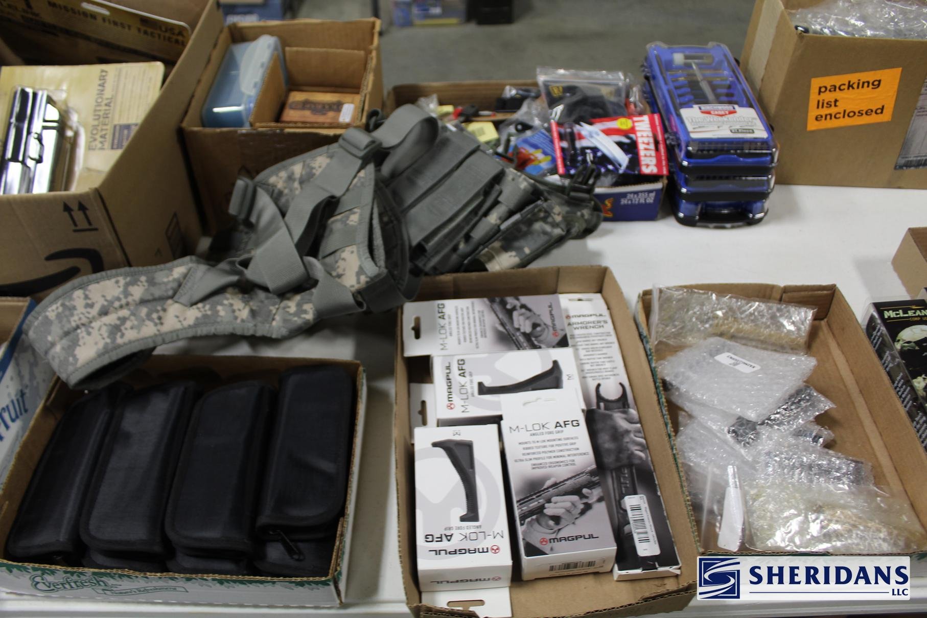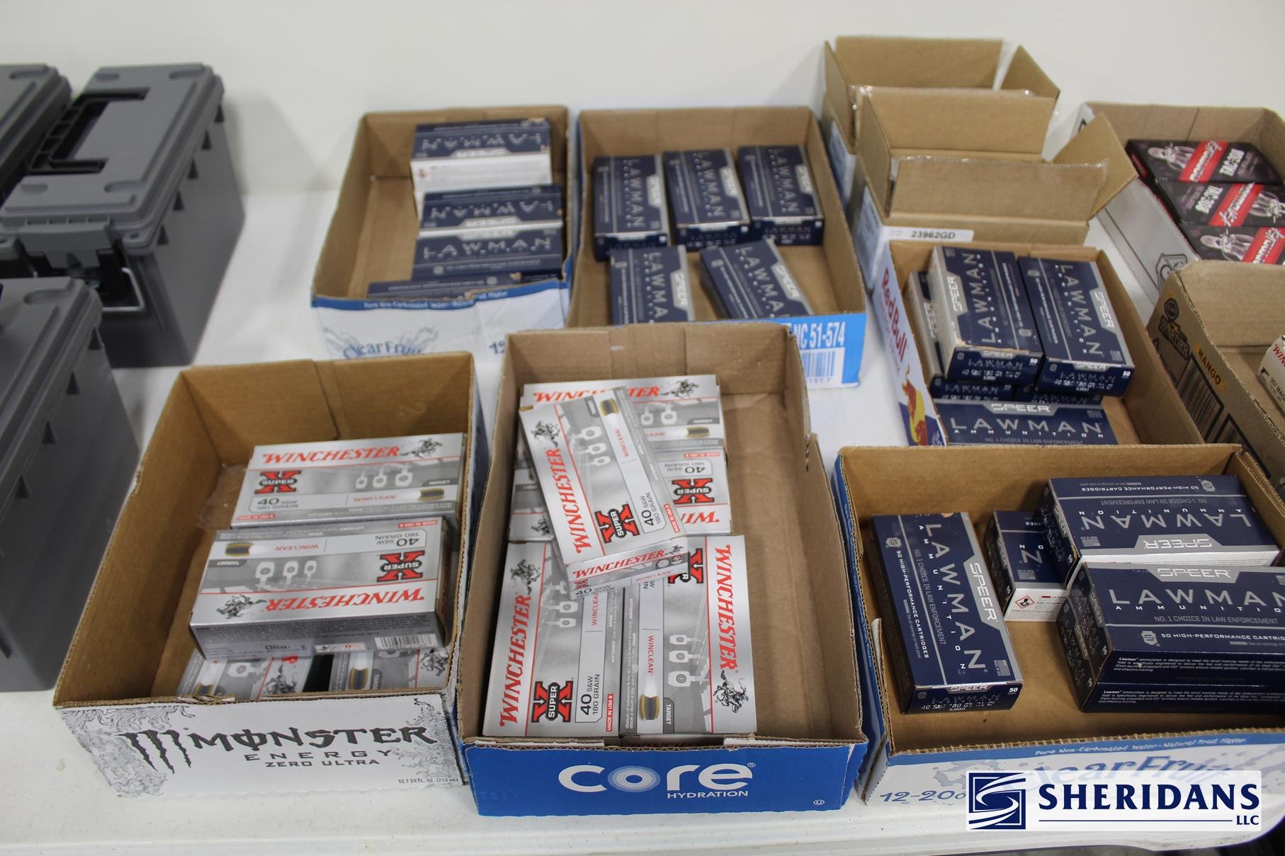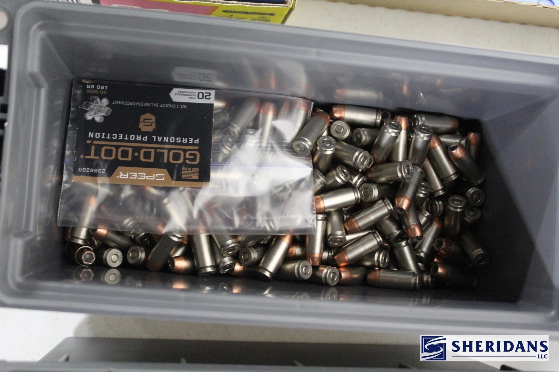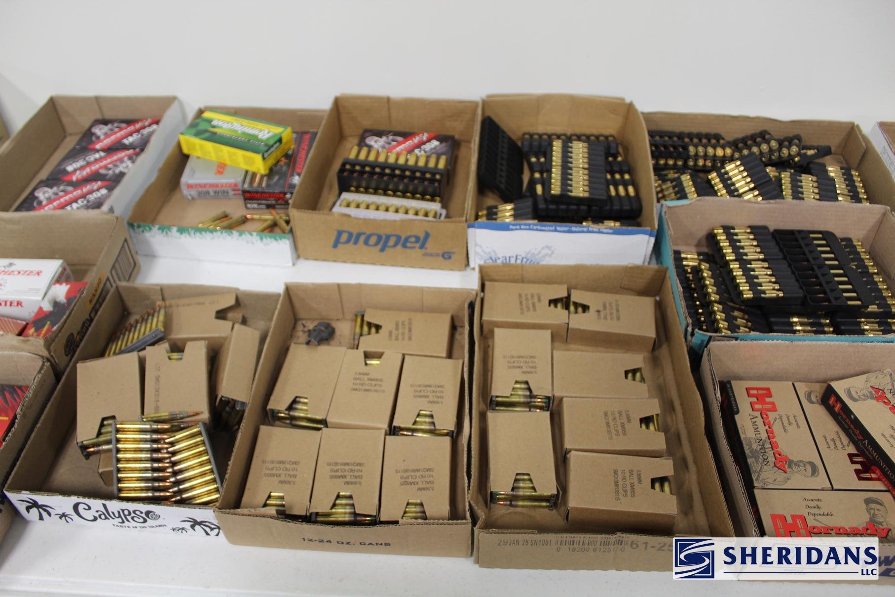 Ammunition & Firearm Accessories: Large selection of handgun, rifle, and shotgun ammunition including .22 LR, 9mm, .38 special, .357, .40 S&W, .45 auto, .45 colt, .308, .223/5.56, 7.62x39, 7.62x25, 9x18, 12 Ga, and .410; large assortment of handgun and rifle magazines (Glock, AR-15, AK, M&P, CZ, Beretta, .308); AR parts & accessories including upper receivers, lower parts kits, bolt carrier groups, buffer tubes, grips, rails, jigs, & armorer tools; Glock and pistol parts, barrels, and conversion barrels; gun cleaning kits, locks, cases, safes, slings, holsters, tactical gear, magazine pouches, ammo cans, optics, binoculars, spotting scopes, and range accessories; antique ammo boxes and vintage firearm-related items.