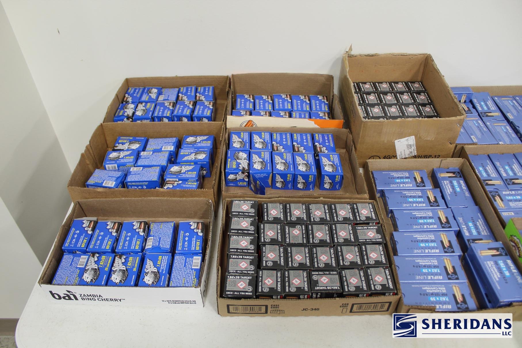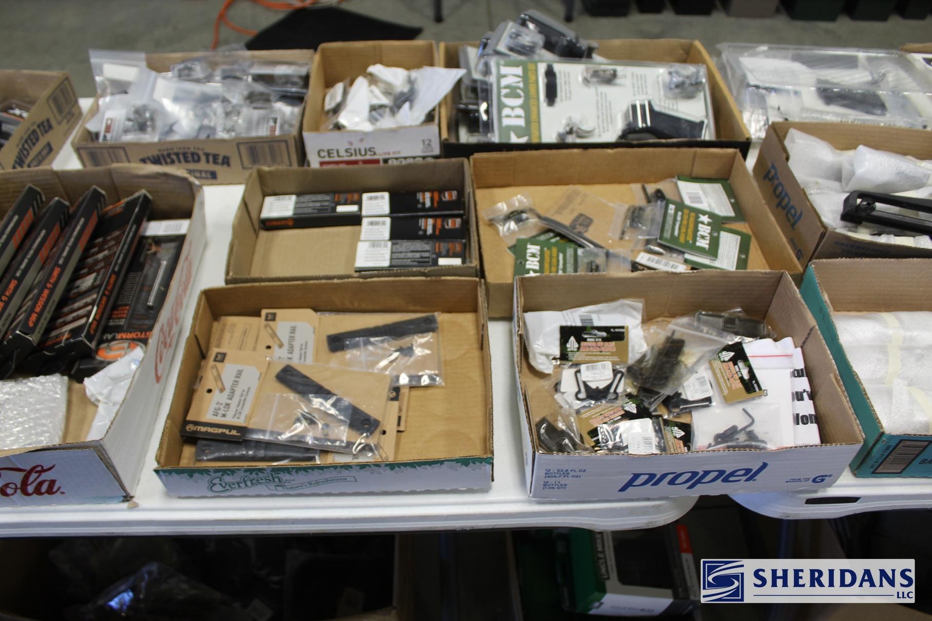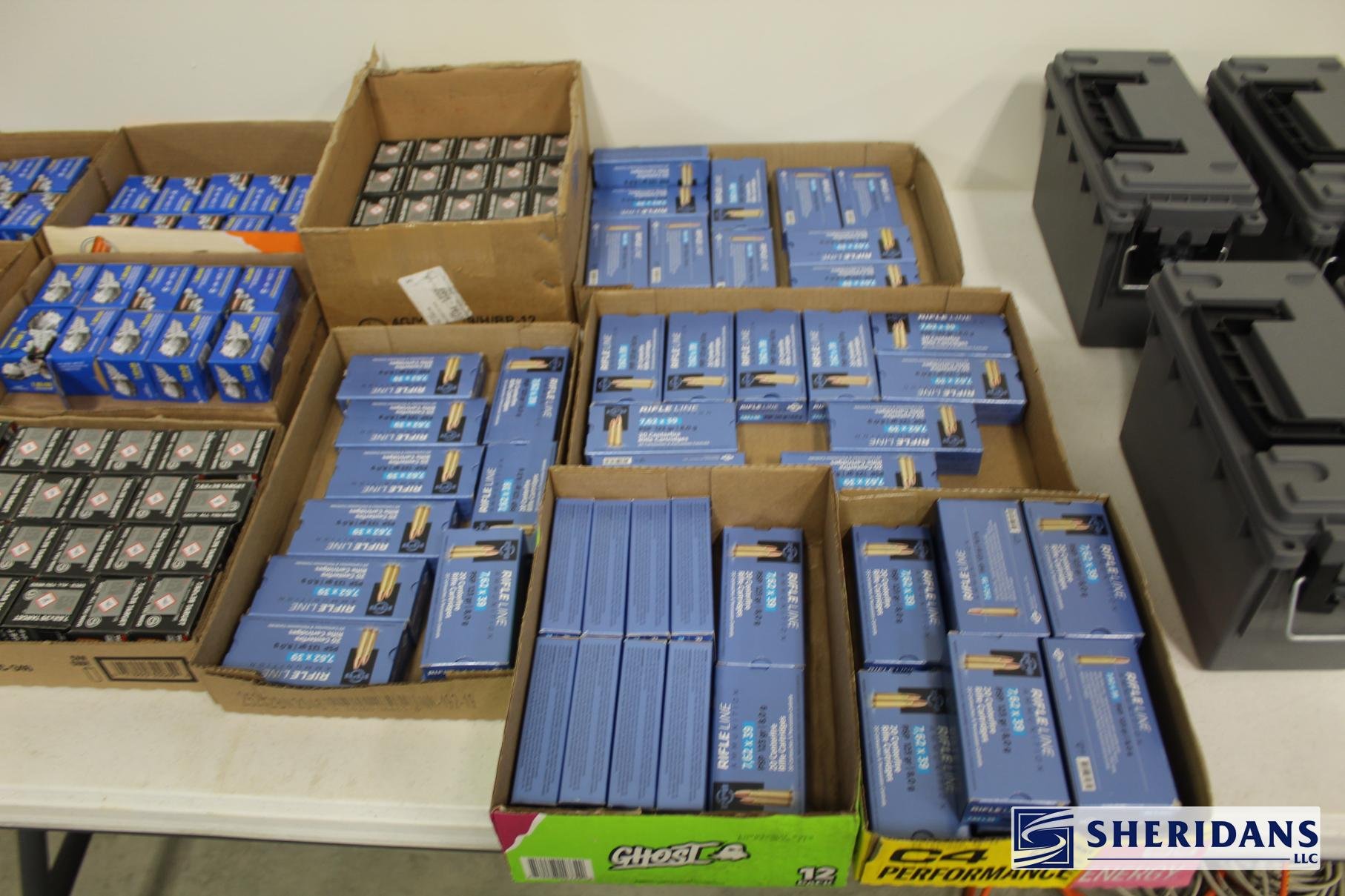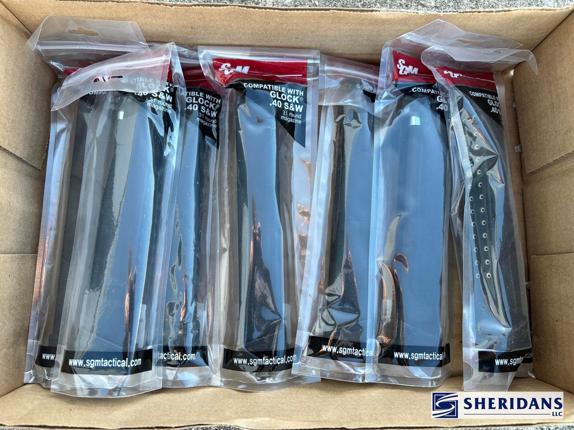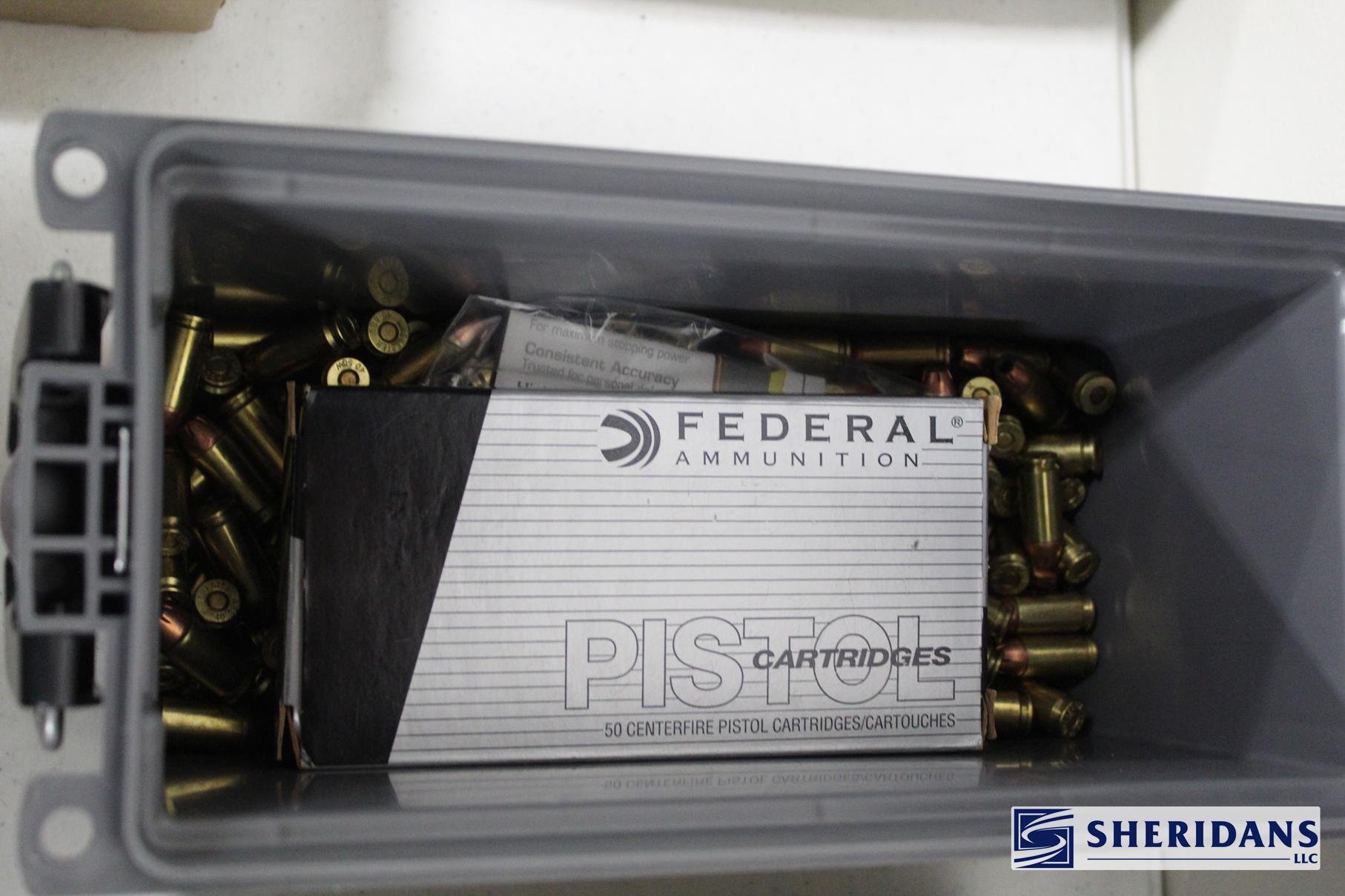 Ammunition & Firearm Accessories: Large selection of handgun, rifle, and shotgun ammunition including .22 LR, 9mm, .38 special, .357, .40 S&W, .45 auto, .45 colt, .308, .223/5.56, 7.62x39, 7.62x25, 9x18, 12 Ga, and .410; large assortment of handgun and rifle magazines (Glock, AR-15, AK, M&P, CZ, Beretta, .308); AR parts & accessories including upper receivers, lower parts kits, bolt carrier groups, buffer tubes, grips, rails, jigs, & armorer tools; Glock and pistol parts, barrels, and conversion barrels; gun cleaning kits, locks, cases, safes, slings, holsters, tactical gear, magazine pouches, ammo cans, optics, binoculars, spotting scopes, and range accessories; antique ammo boxes and vintage firearm-related items.