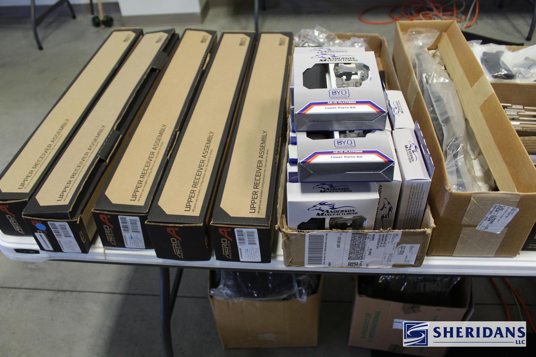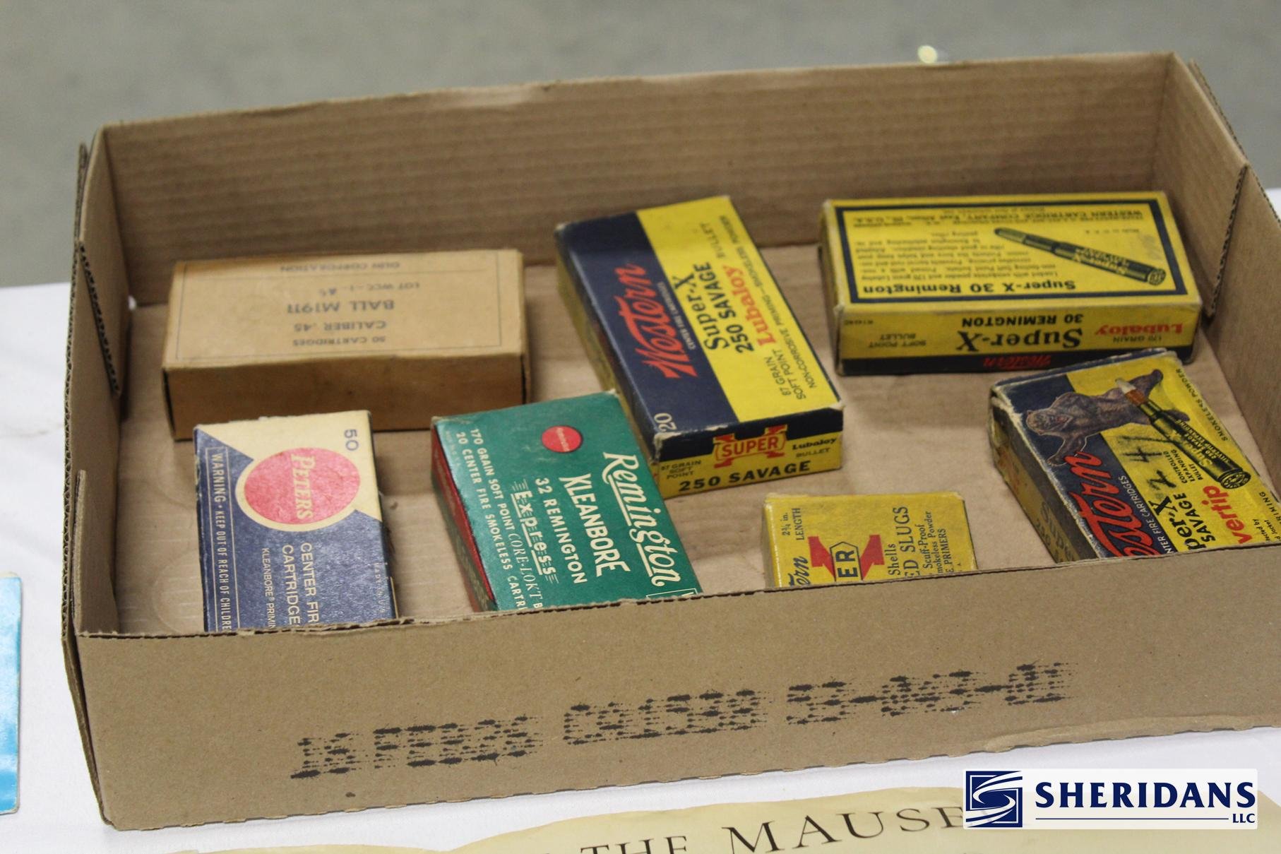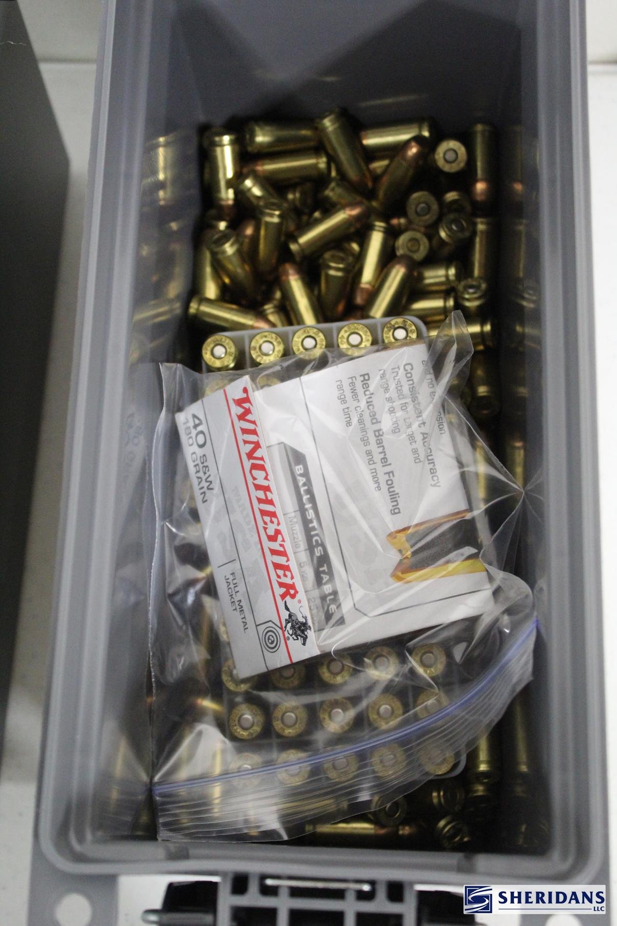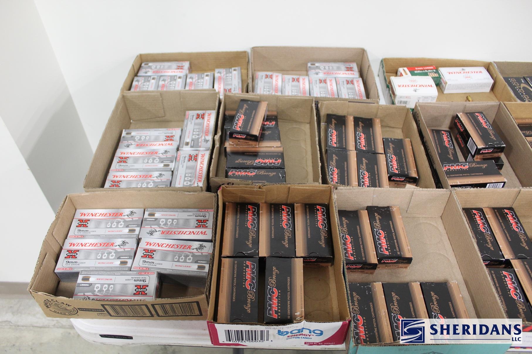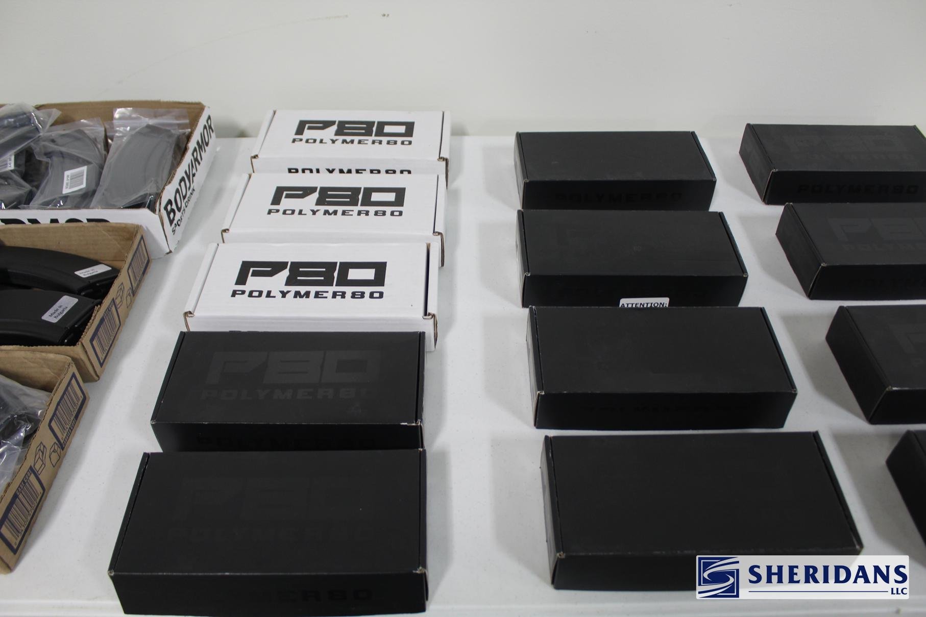 Ammunition & Firearm Accessories: Large selection of handgun, rifle, and shotgun ammunition including .22 LR, 9mm, .38 special, .357, .40 S&W, .45 auto, .45 colt, .308, .223/5.56, 7.62x39, 7.62x25, 9x18, 12 Ga, and .410; large assortment of handgun and rifle magazines (Glock, AR-15, AK, M&P, CZ, Beretta, .308); AR parts & accessories including upper receivers, lower parts kits, bolt carrier groups, buffer tubes, grips, rails, jigs, & armorer tools; Glock and pistol parts, barrels, and conversion barrels; gun cleaning kits, locks, cases, safes, slings, holsters, tactical gear, magazine pouches, ammo cans, optics, binoculars, spotting scopes, and range accessories; antique ammo boxes and vintage firearm-related items.