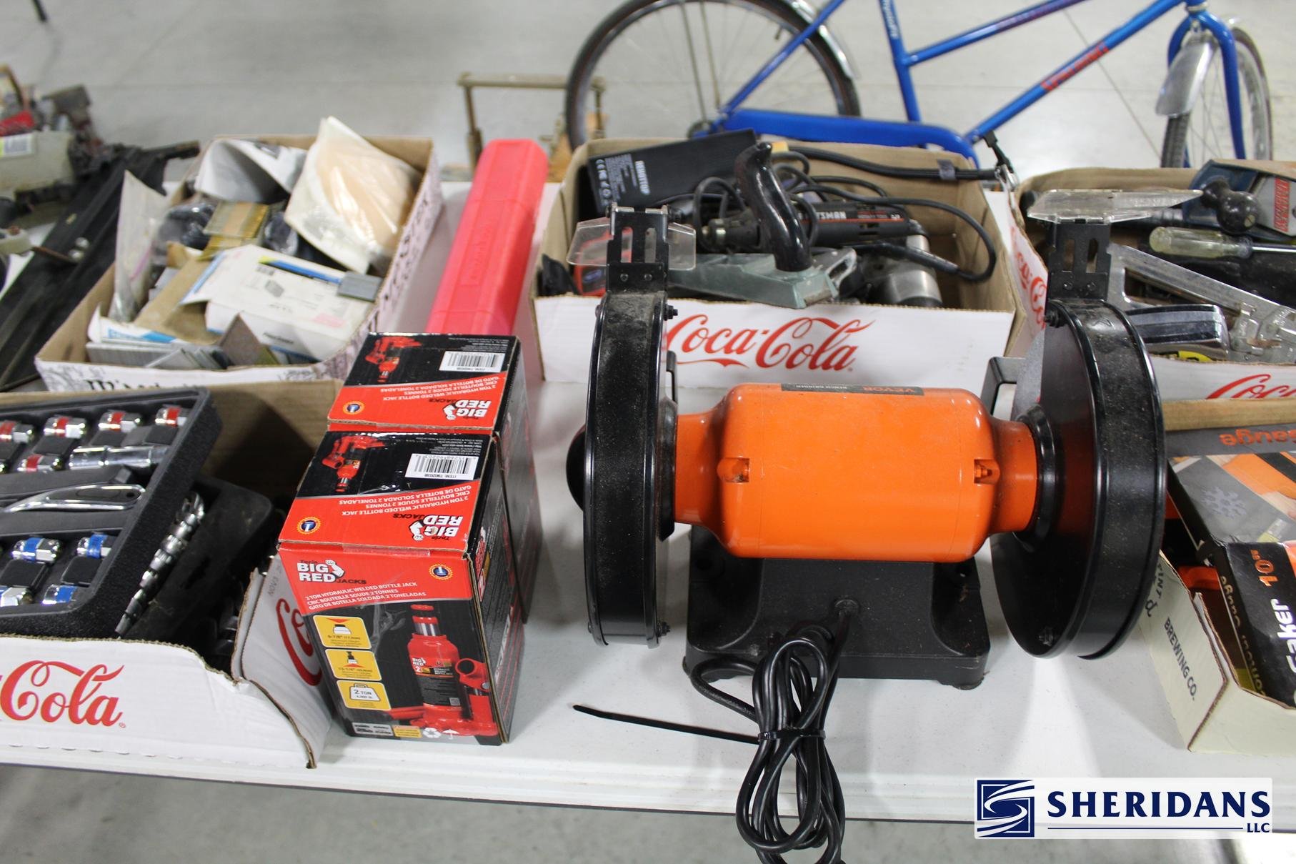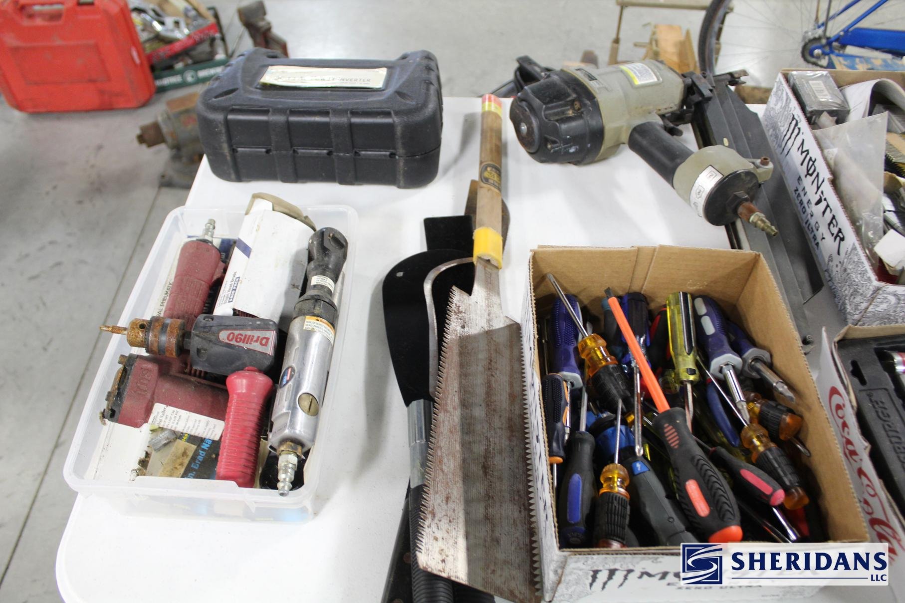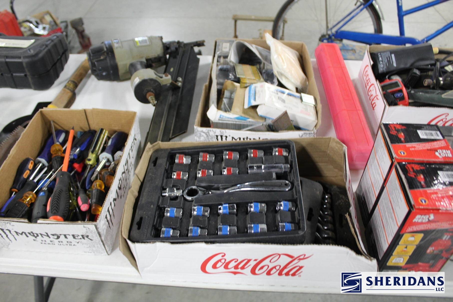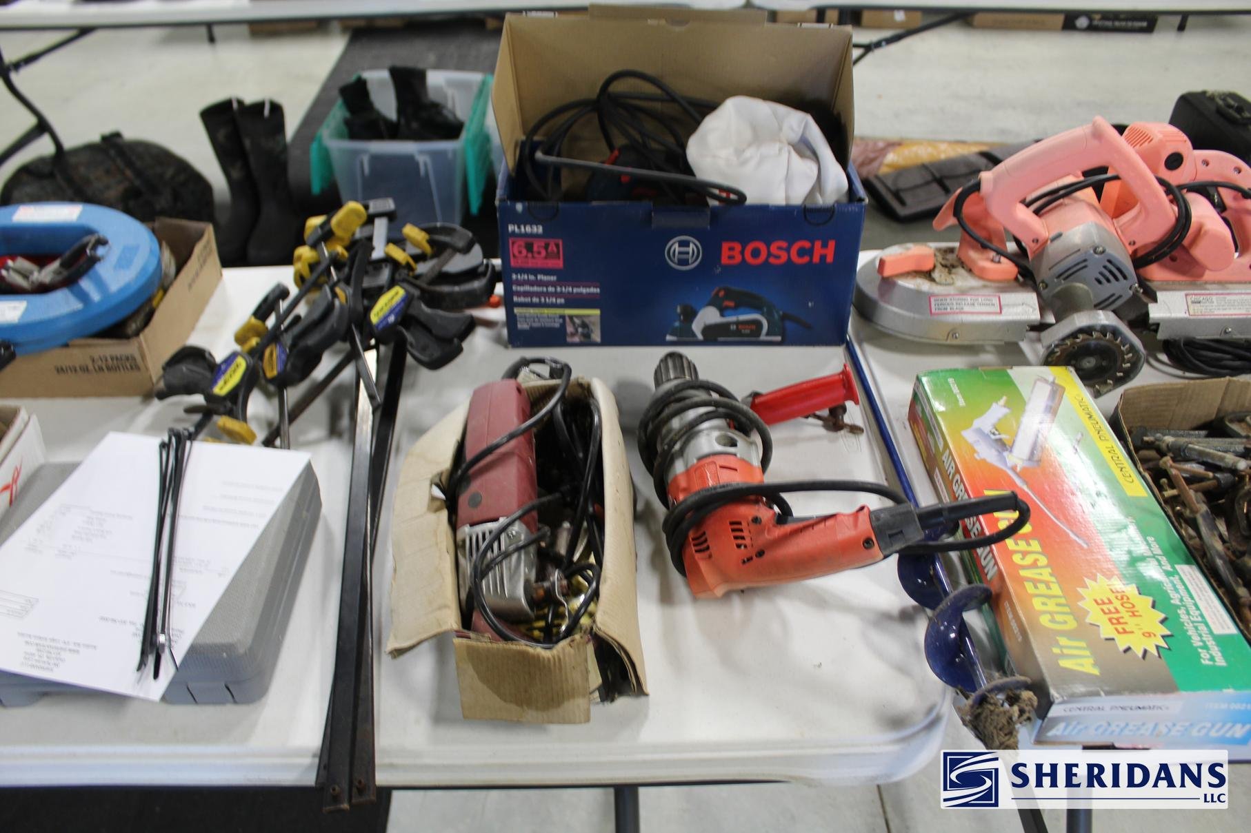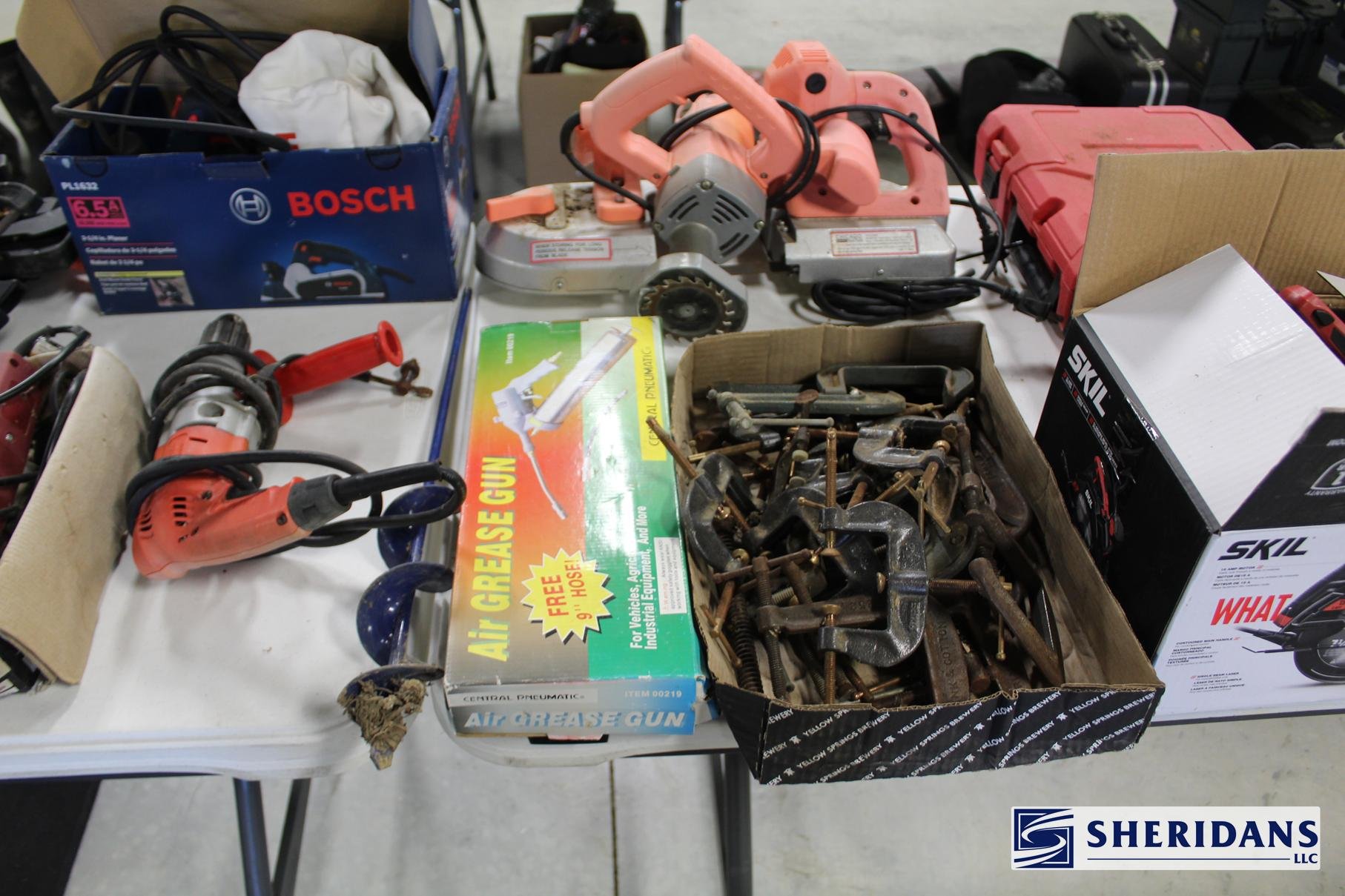 Tools: Extensive selection of power tools, hand tools, cordless drills, saws, grinders, sanders, nailers, pneumatic tools, clamps, vises, measuring tools, socket and wrench sets, tool boxes, shop equipment, generators, compressors, welders, jacks, ladders, shop vacs, lawn and garden tools, pressure washer, chain saws, miter and band saws, drill press, and assorted shop accessories.