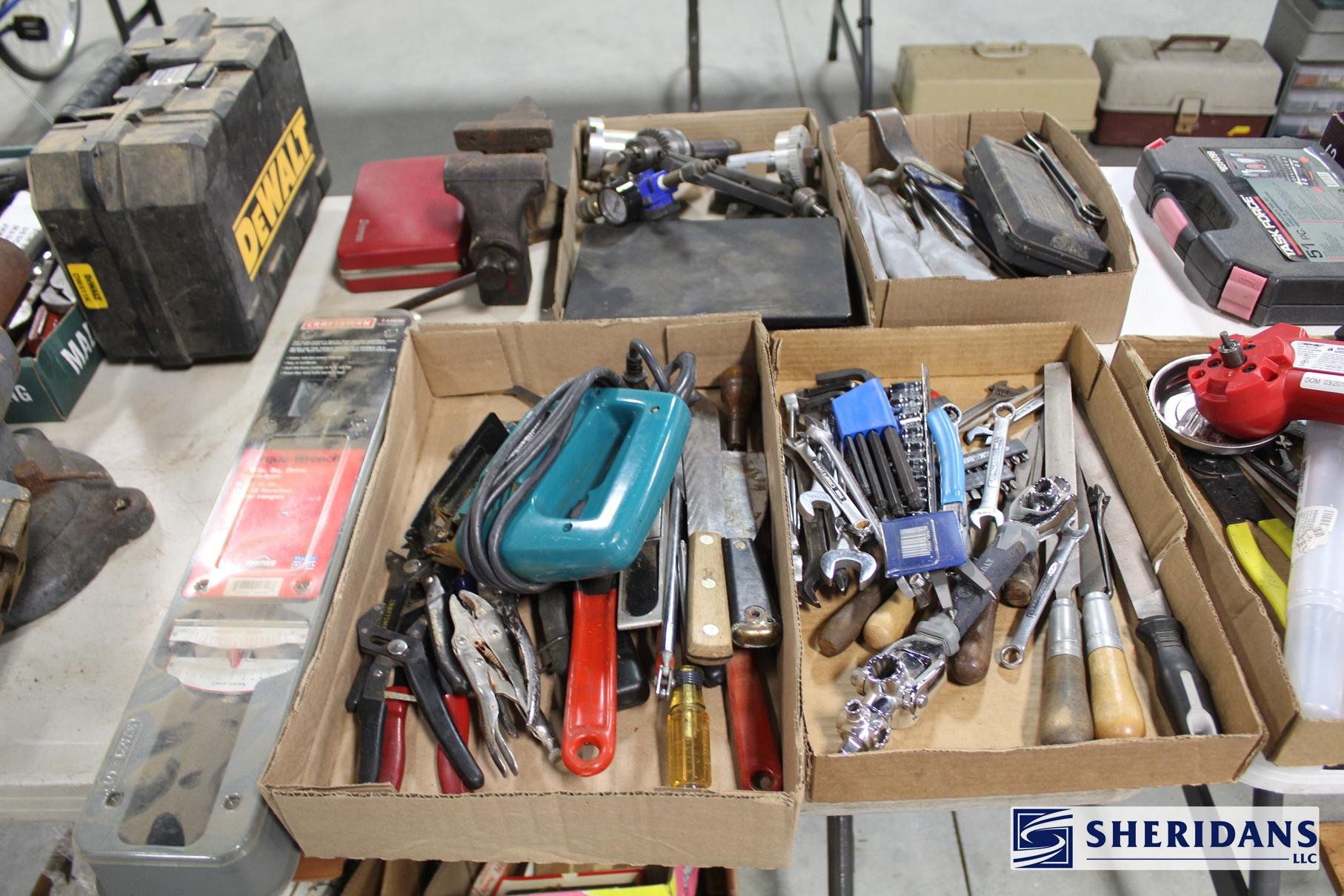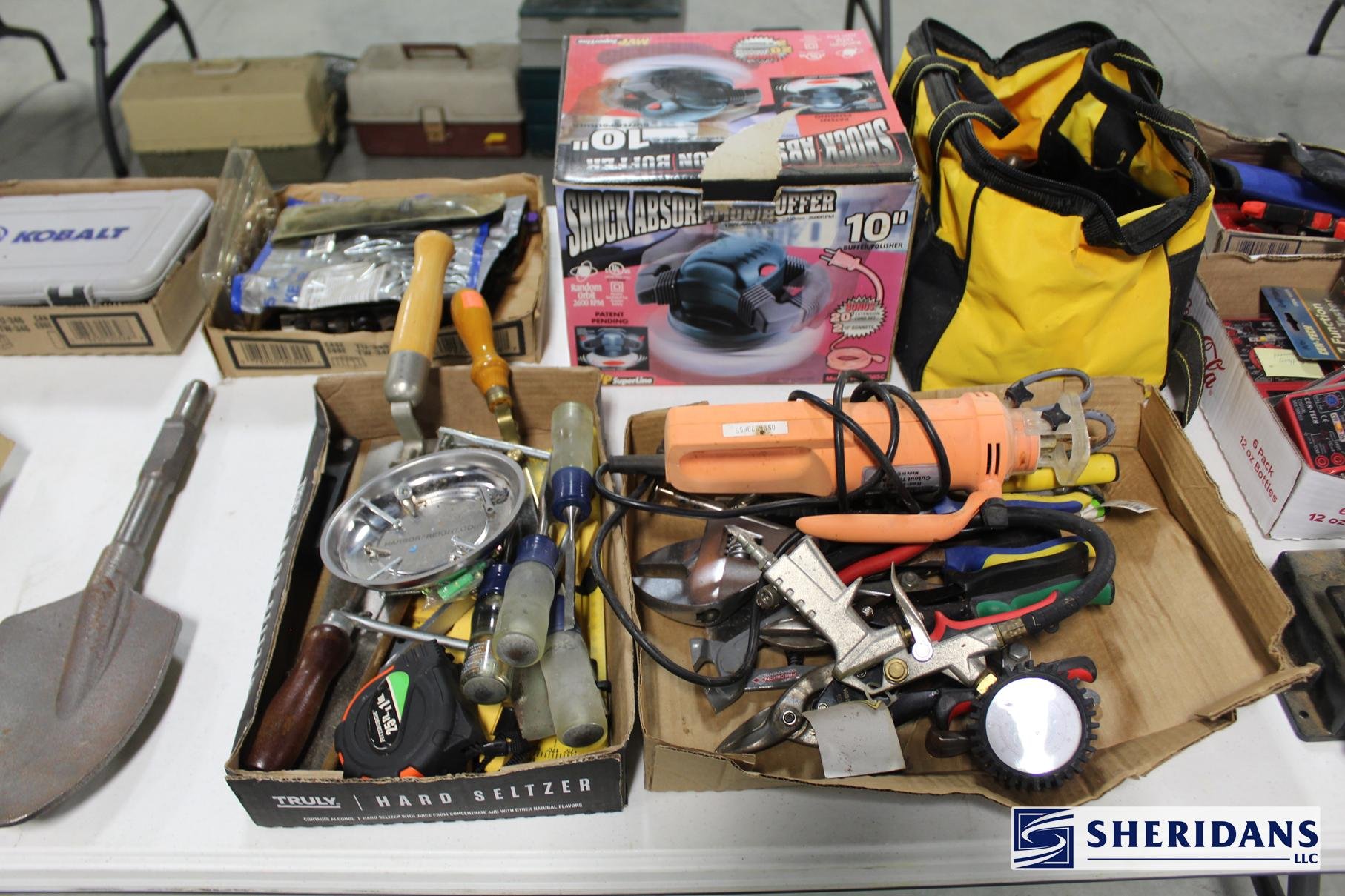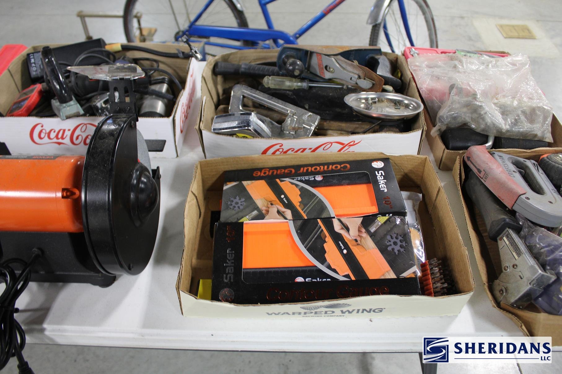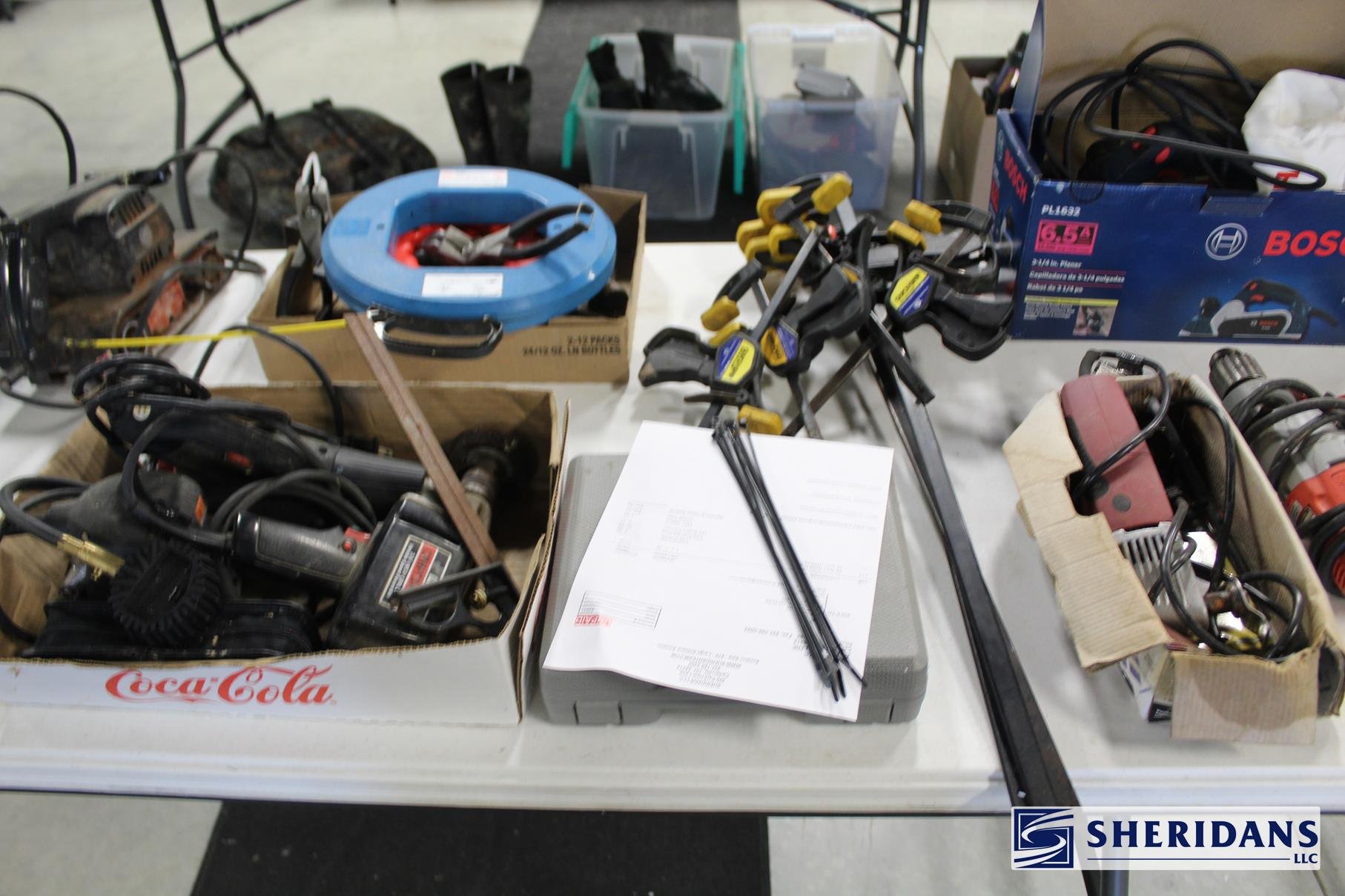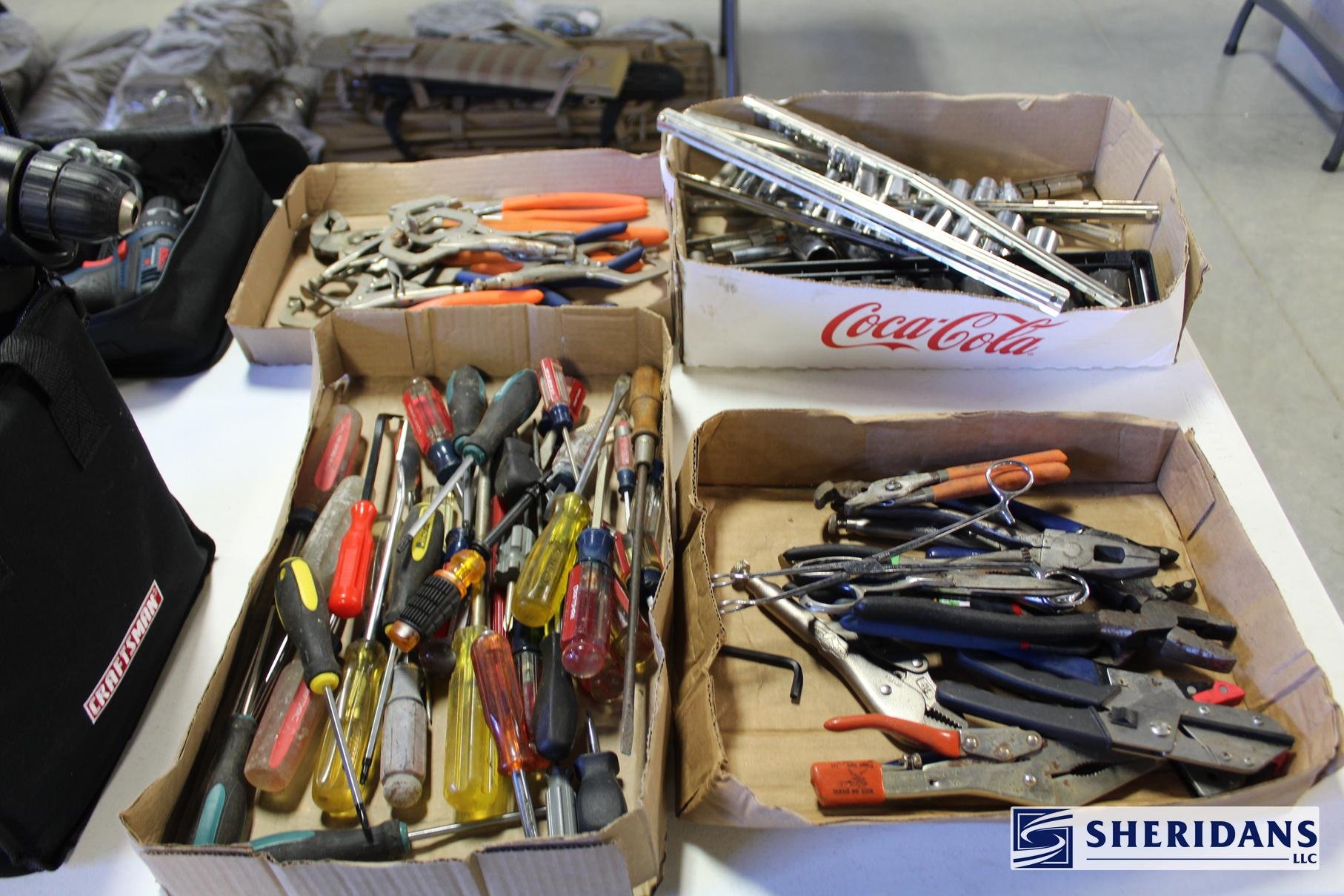 Tools: Extensive selection of power tools, hand tools, cordless drills, saws, grinders, sanders, nailers, pneumatic tools, clamps, vises, measuring tools, socket and wrench sets, tool boxes, shop equipment, generators, compressors, welders, jacks, ladders, shop vacs, lawn and garden tools, pressure washer, chain saws, miter and band saws, drill press, and assorted shop accessories.