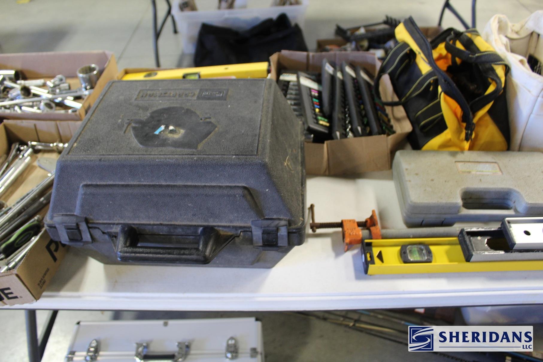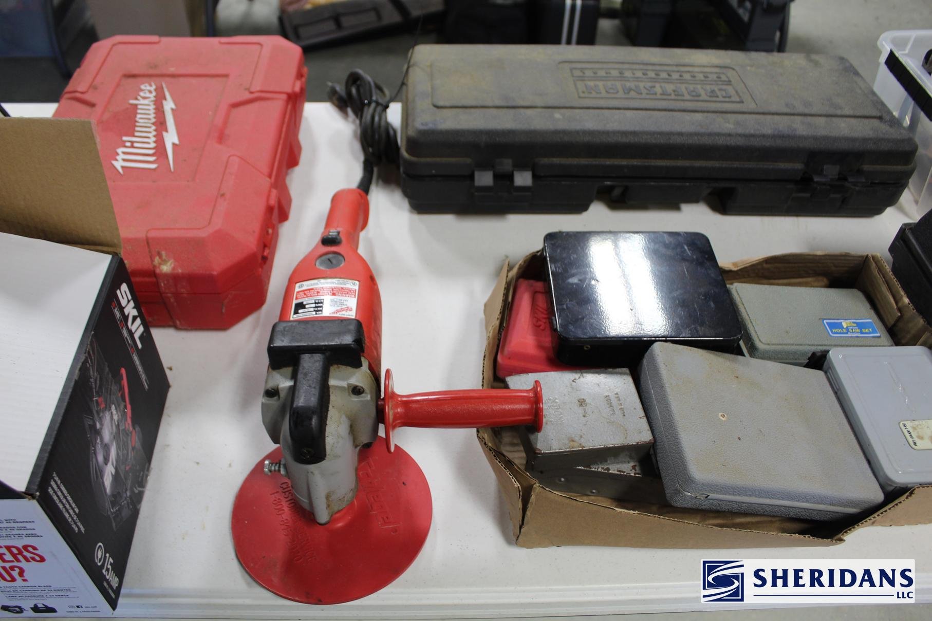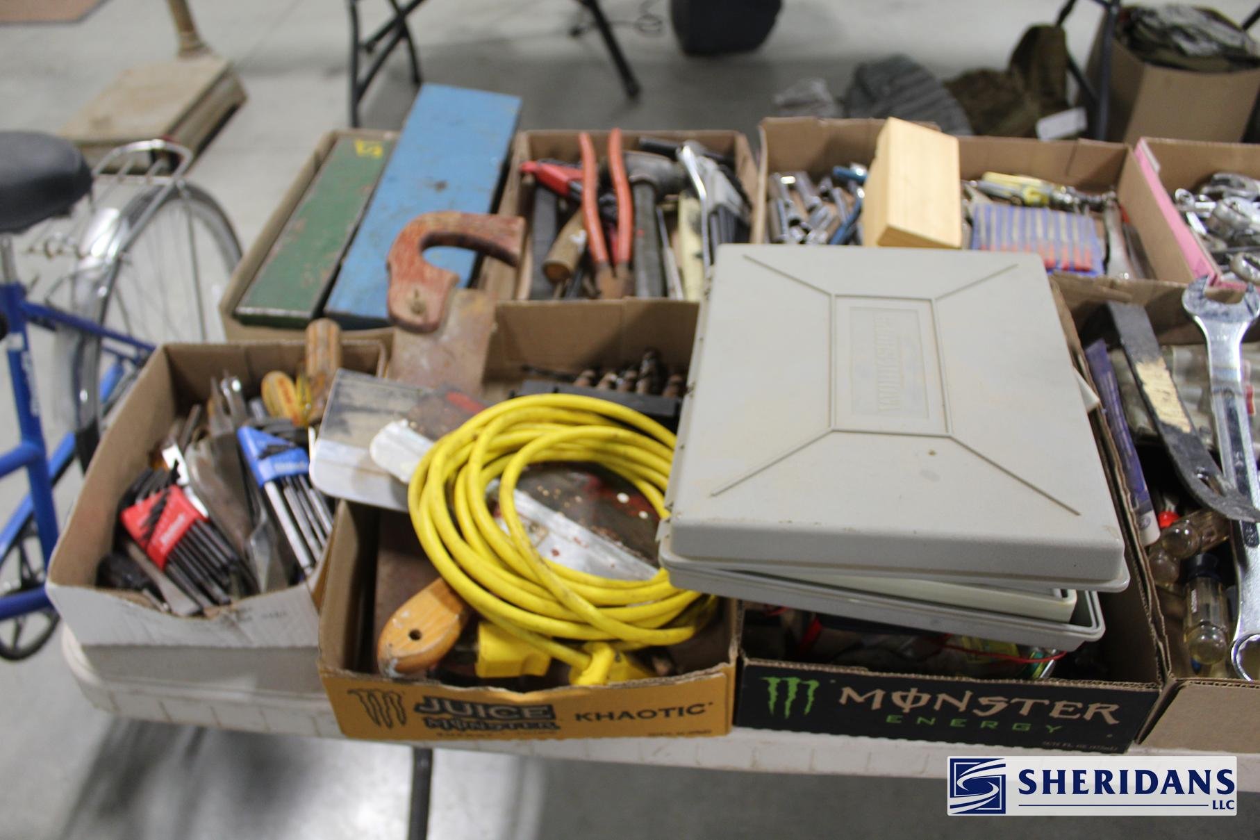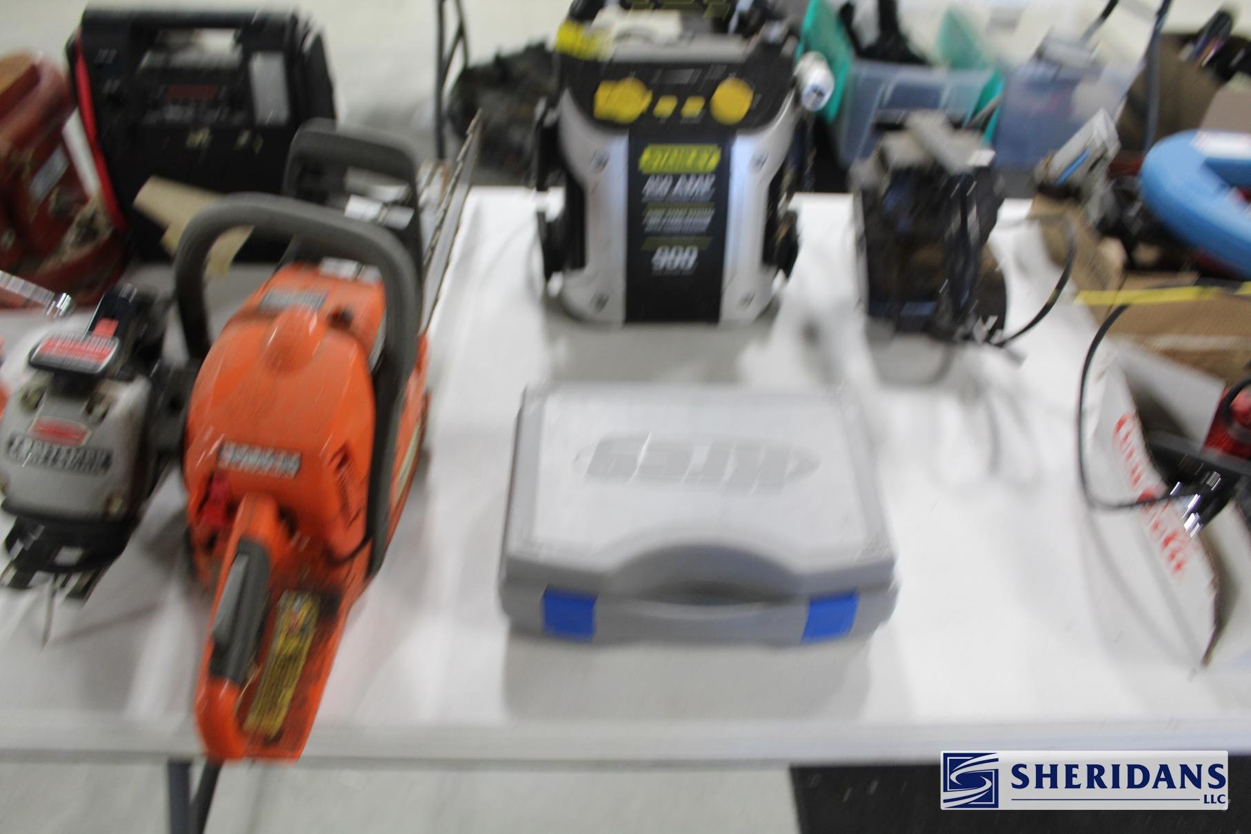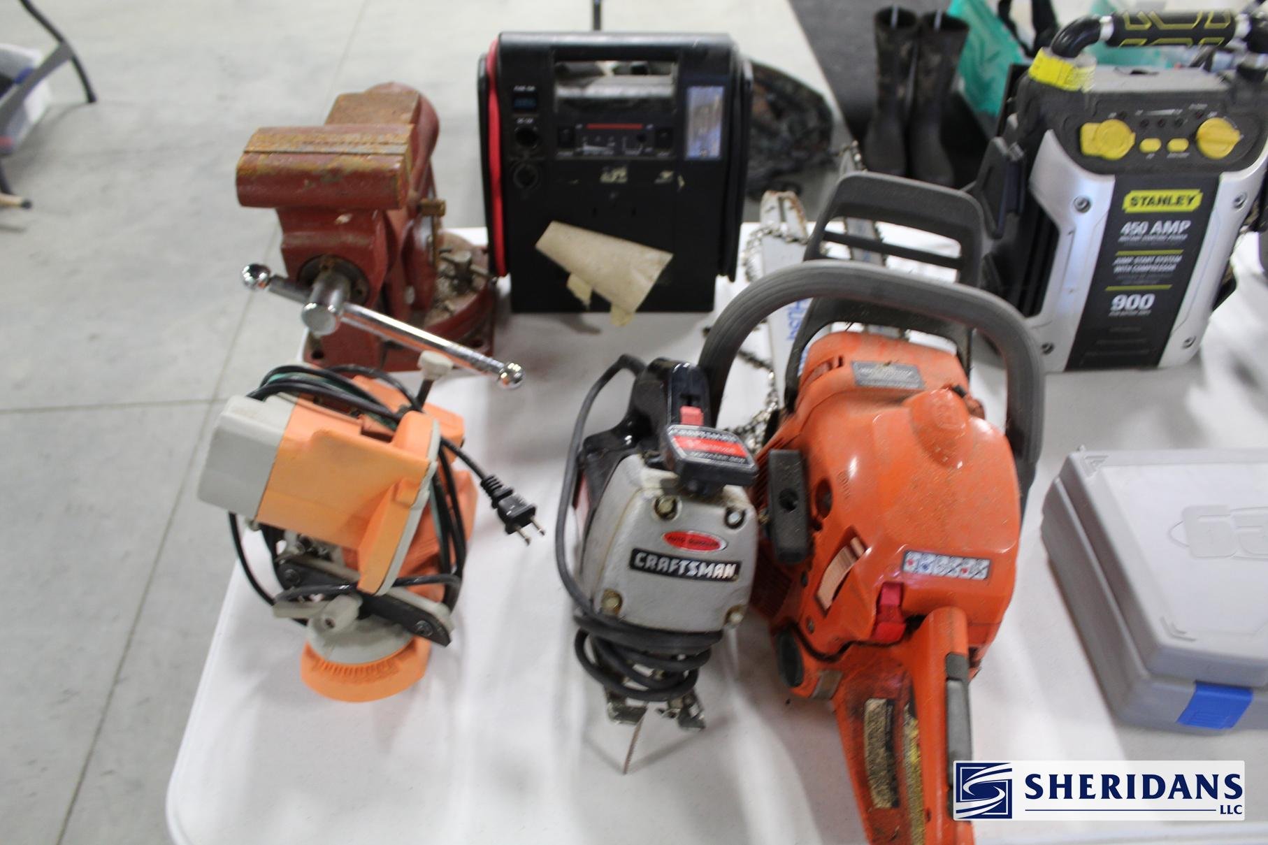 Tools: Extensive selection of power tools, hand tools, cordless drills, saws, grinders, sanders, nailers, pneumatic tools, clamps, vises, measuring tools, socket and wrench sets, tool boxes, shop equipment, generators, compressors, welders, jacks, ladders, shop vacs, lawn and garden tools, pressure washer, chain saws, miter and band saws, drill press, and assorted shop accessories.