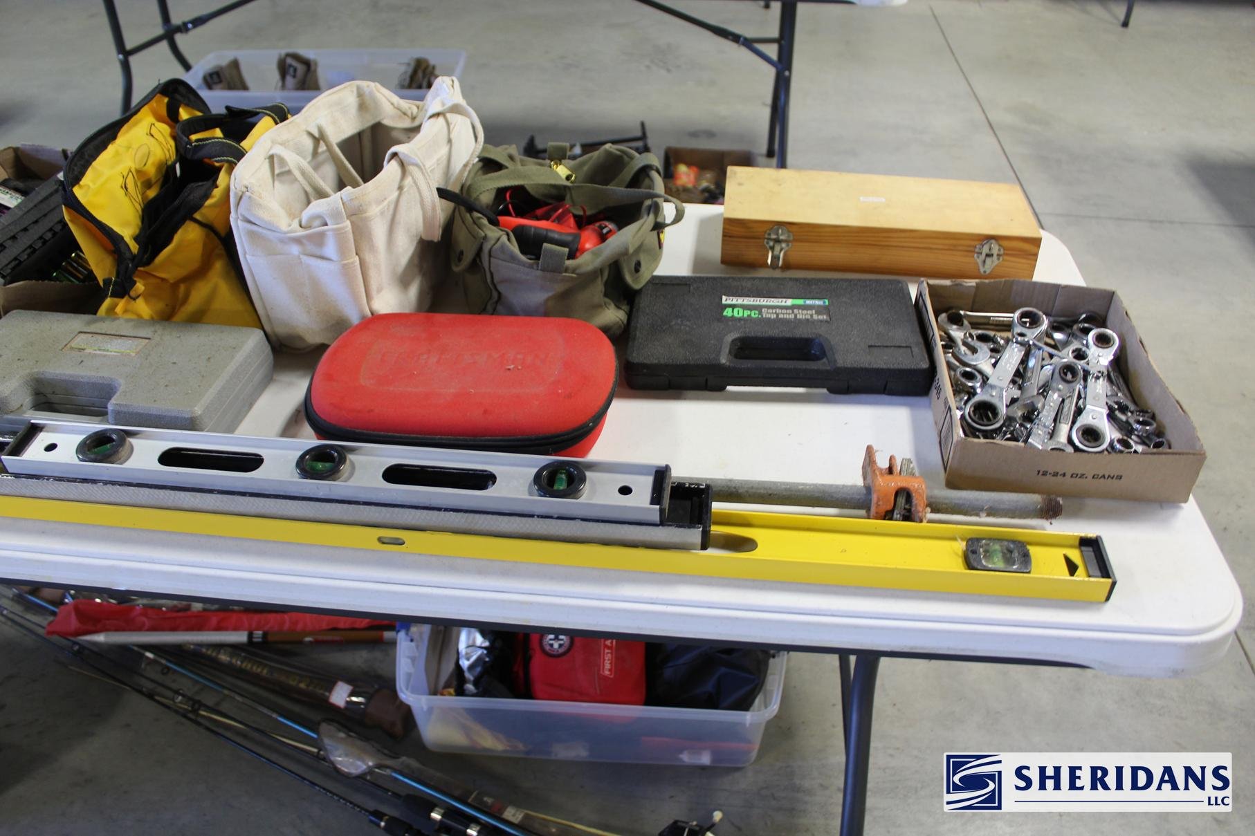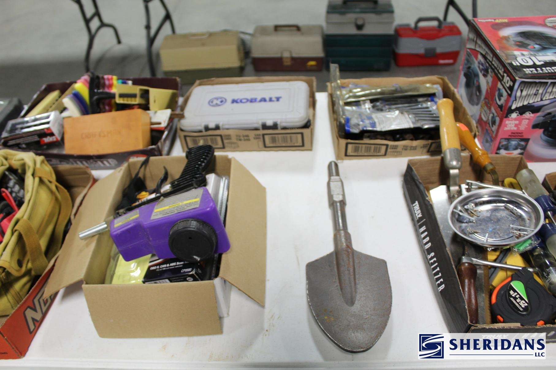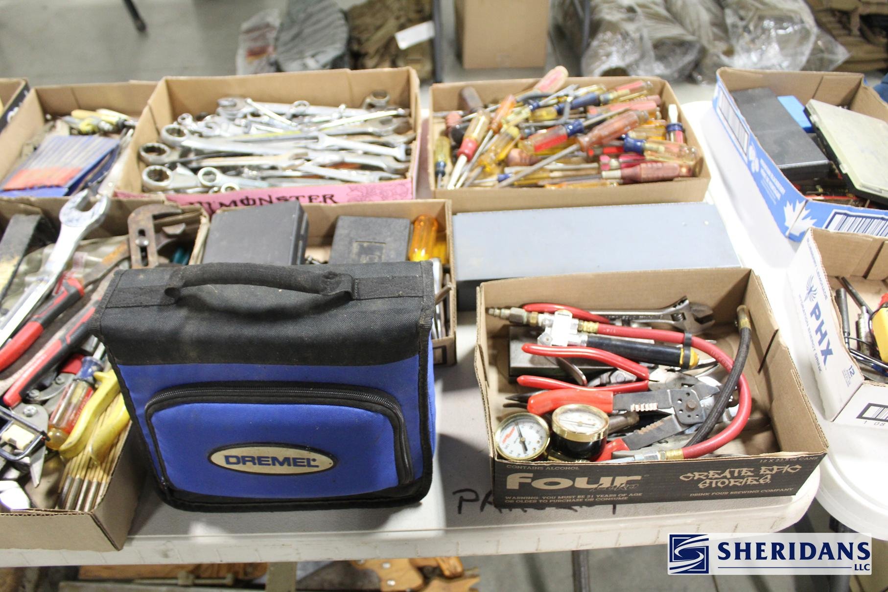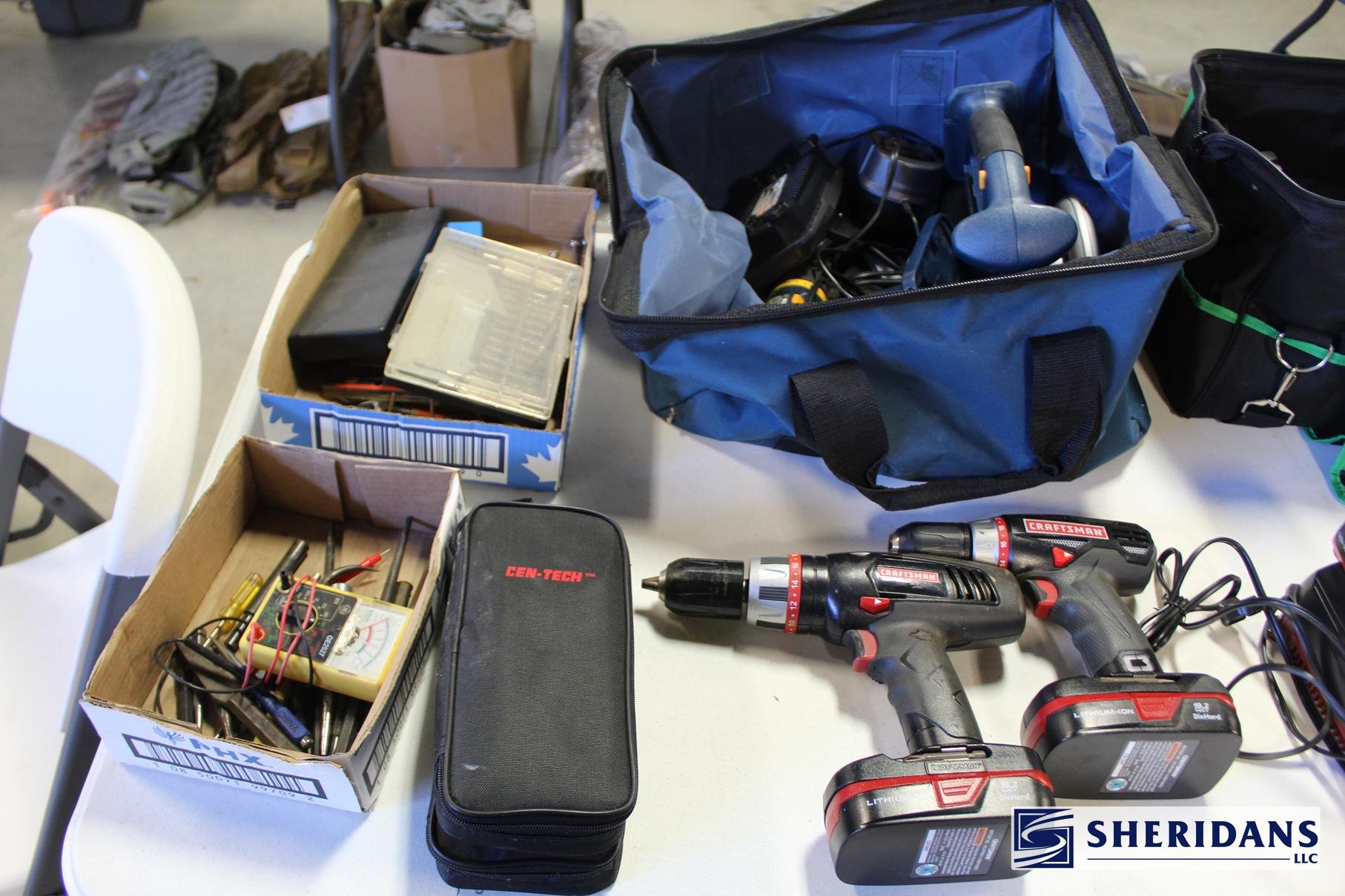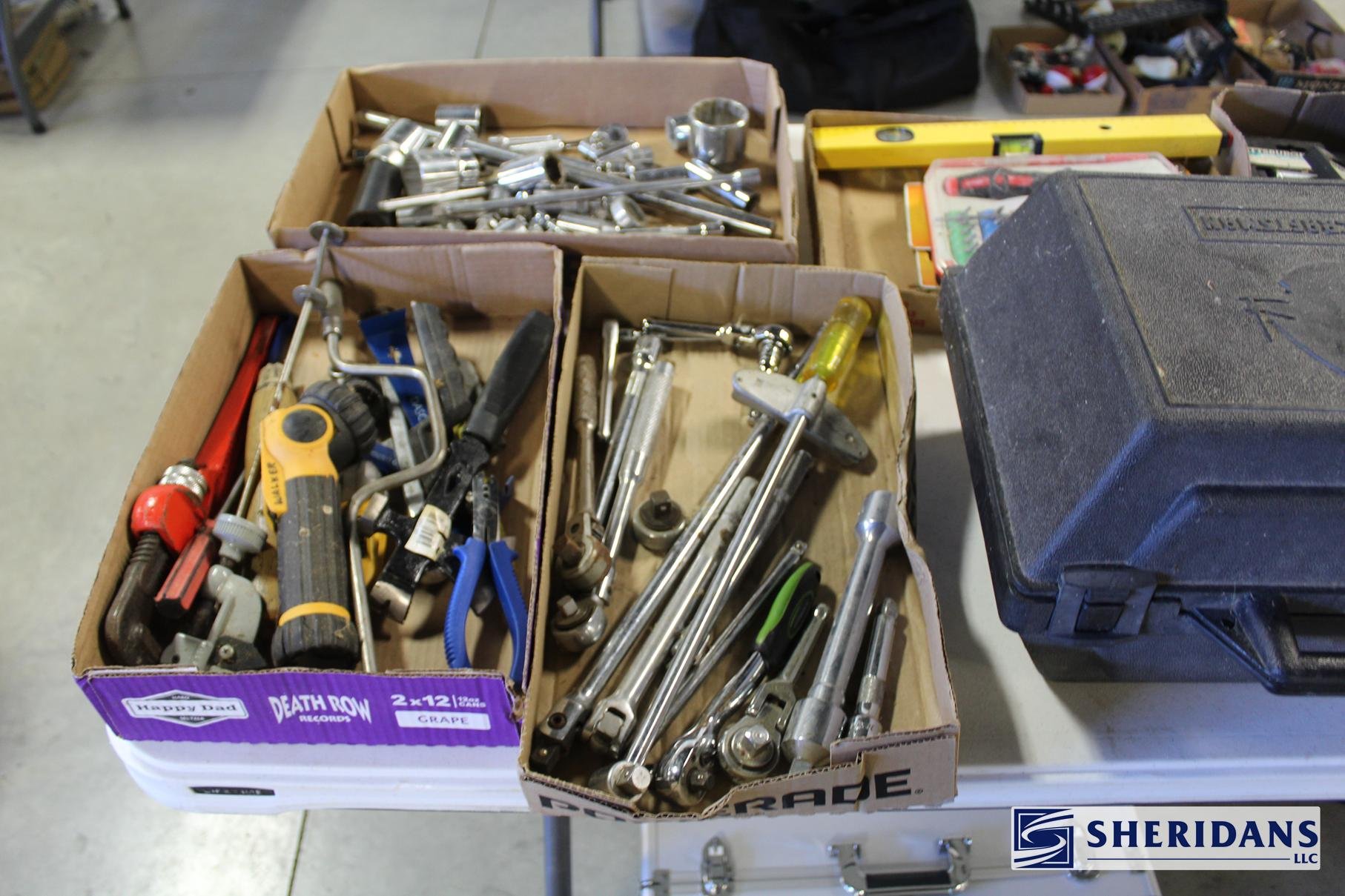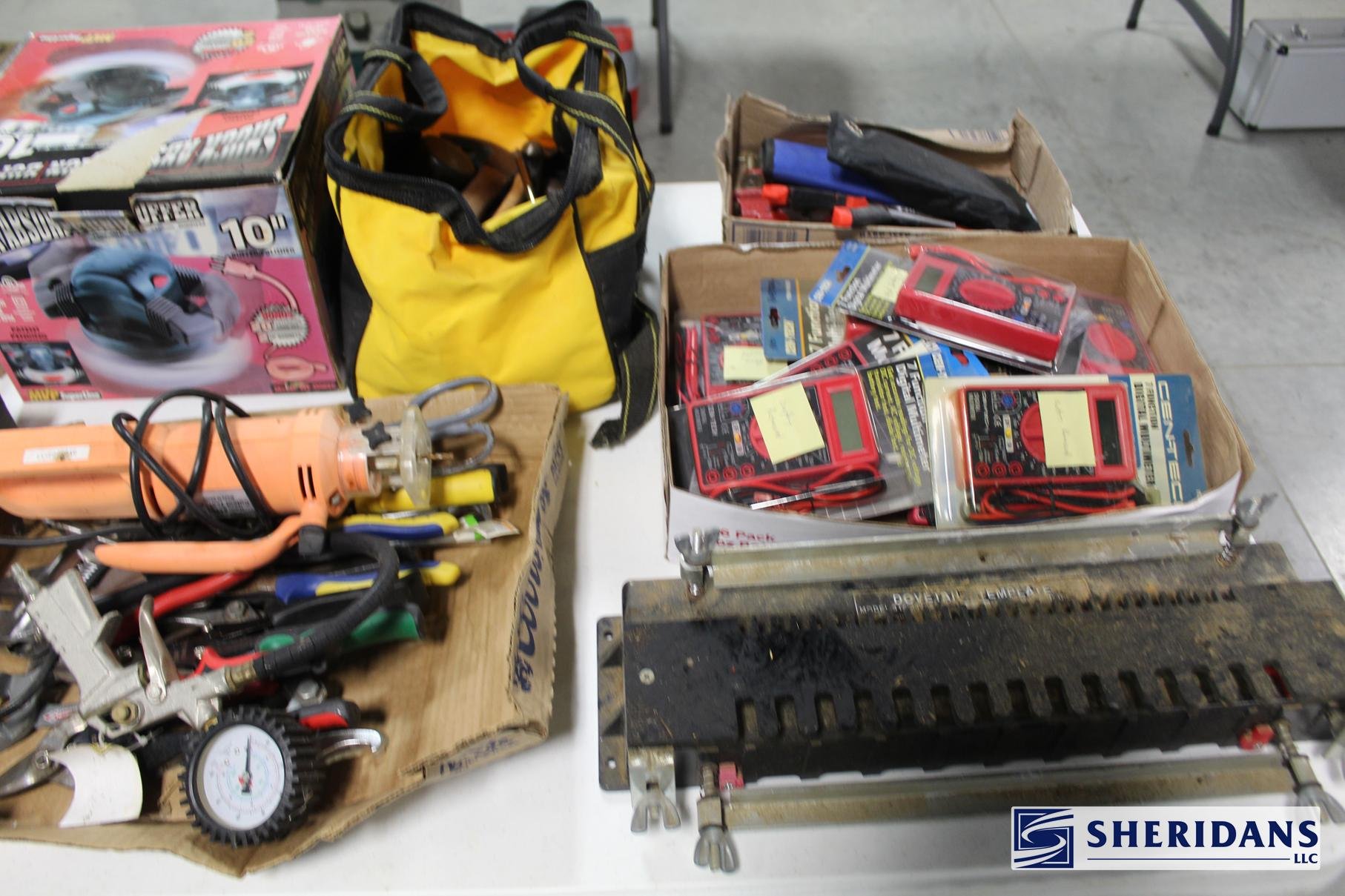Tools: Extensive selection of power tools, hand tools, cordless drills, saws, grinders, sanders, nailers, pneumatic tools, clamps, vises, measuring tools, socket and wrench sets, tool boxes, shop equipment, generators, compressors, welders, jacks, ladders, shop vacs, lawn and garden tools, pressure washer, chain saws, miter and band saws, drill press, and assorted shop accessories.