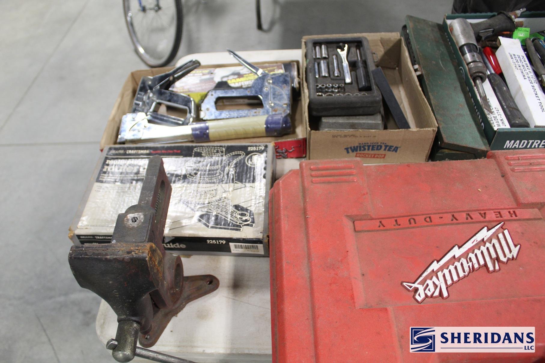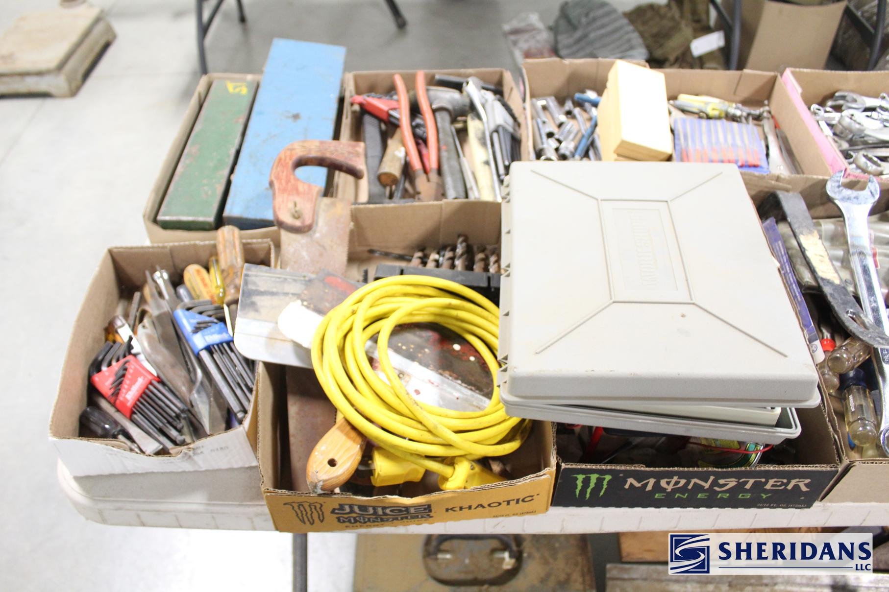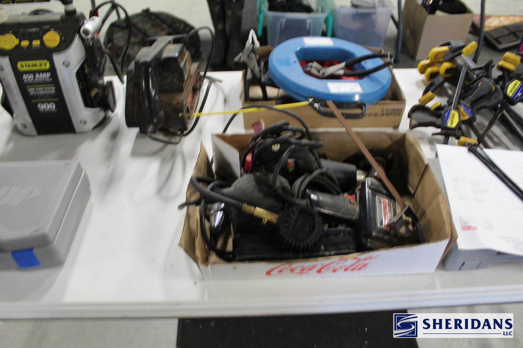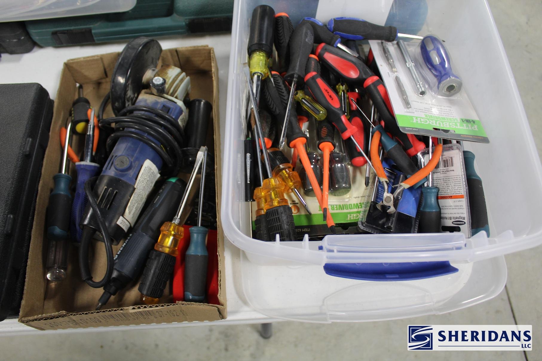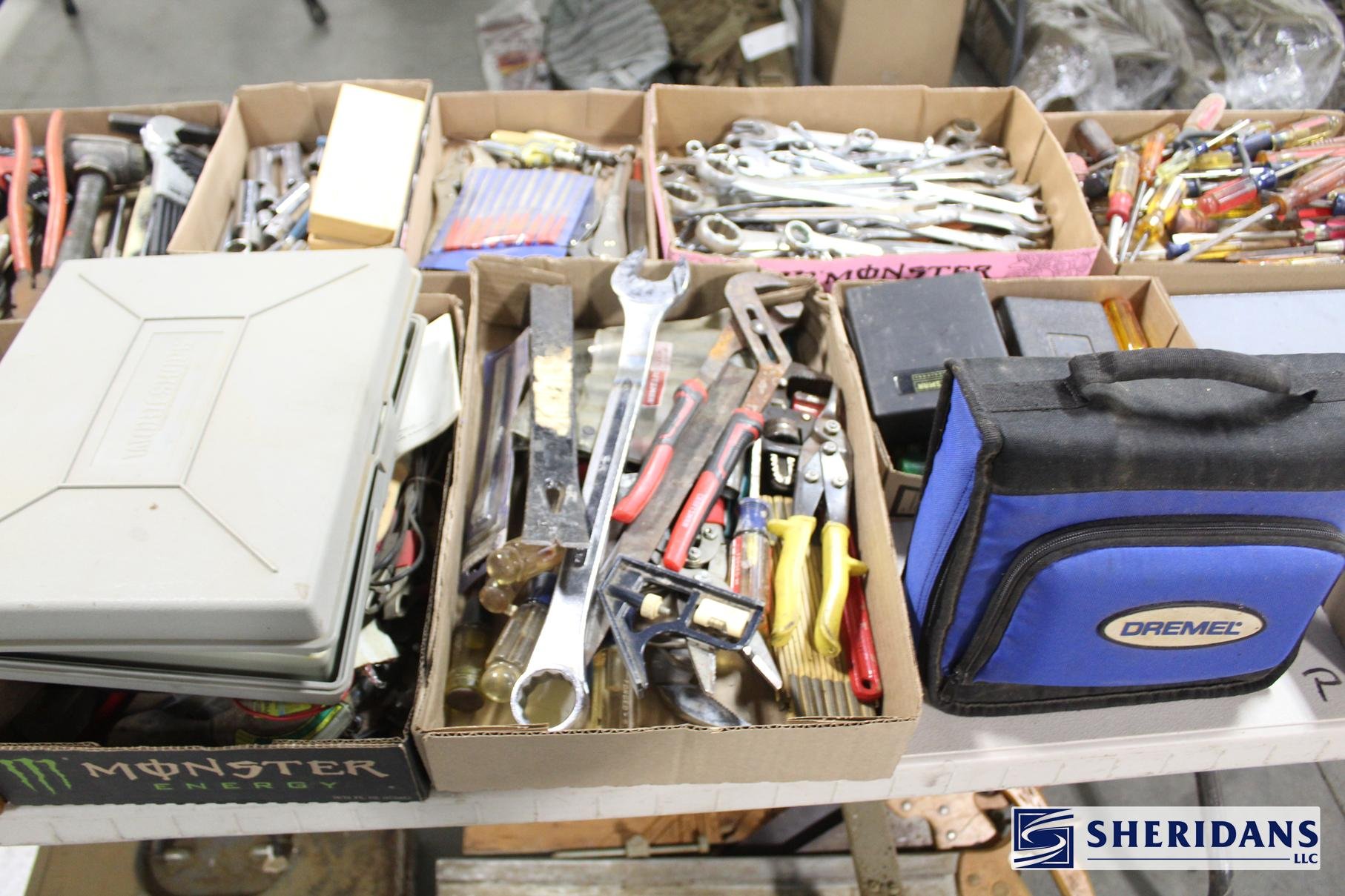 Tools: Extensive selection of power tools, hand tools, cordless drills, saws, grinders, sanders, nailers, pneumatic tools, clamps, vises, measuring tools, socket and wrench sets, tool boxes, shop equipment, generators, compressors, welders, jacks, ladders, shop vacs, lawn and garden tools, pressure washer, chain saws, miter and band saws, drill press, and assorted shop accessories.