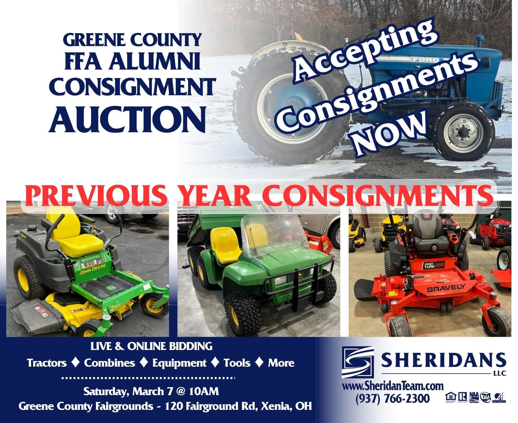 The Greene County FFA Alumni Association provides assistance and financial support to many deserving youth throughout the year. All consignment fees go to support these Alumni Association endeavors. Call early to consign your machinery, equipment, & tools. Advertising throughout the nation. Earlier consignments will be featured in traditional print advertising.