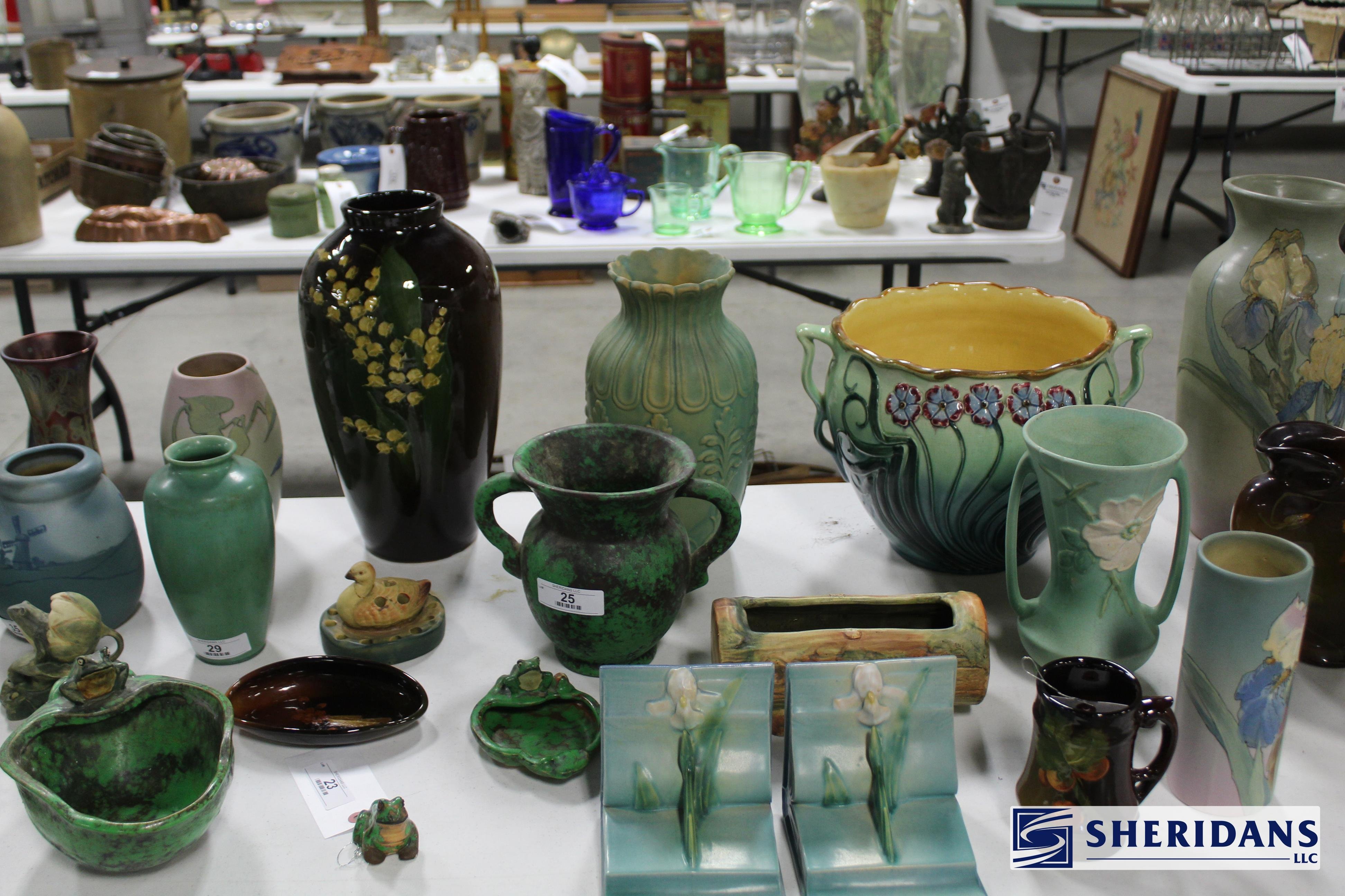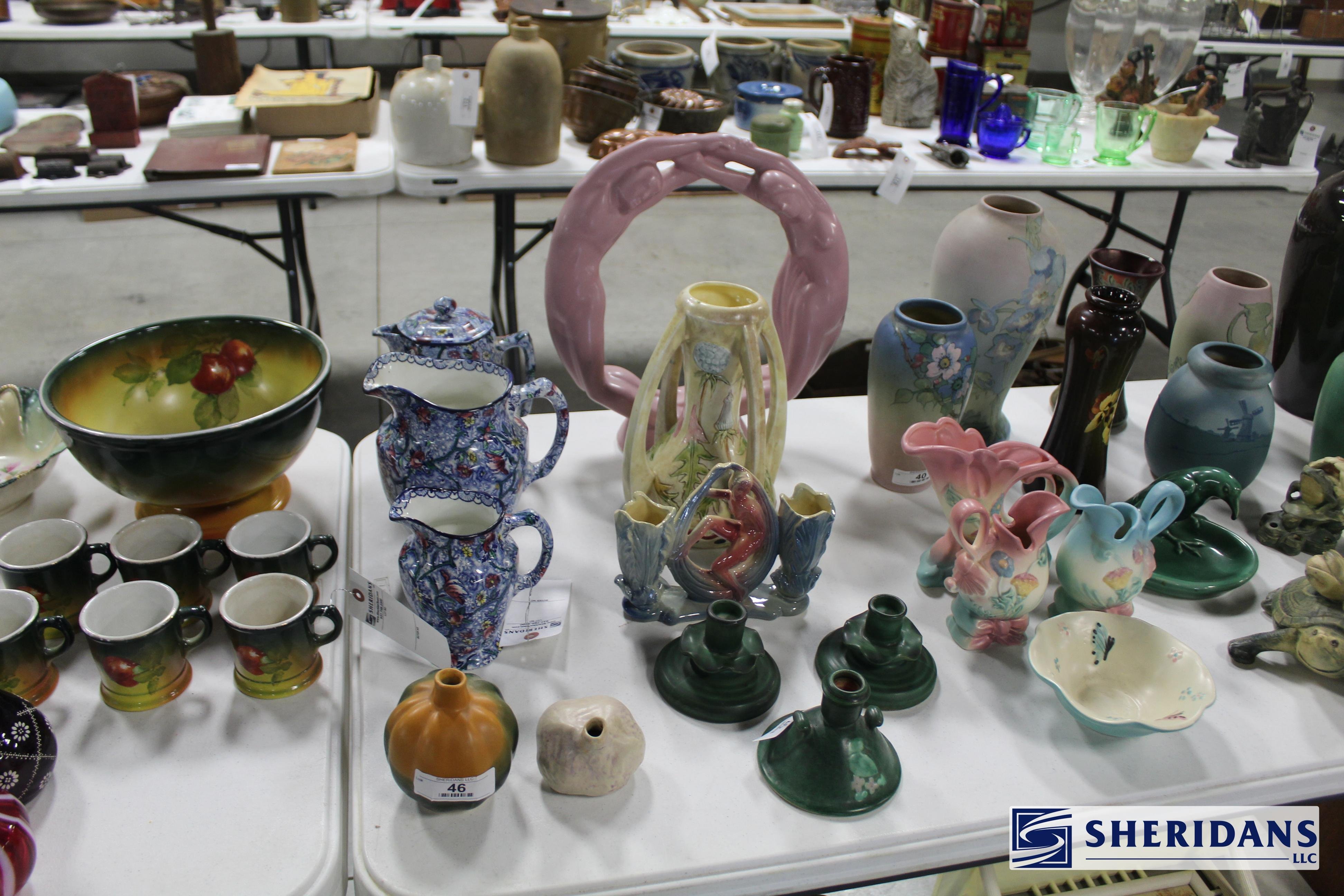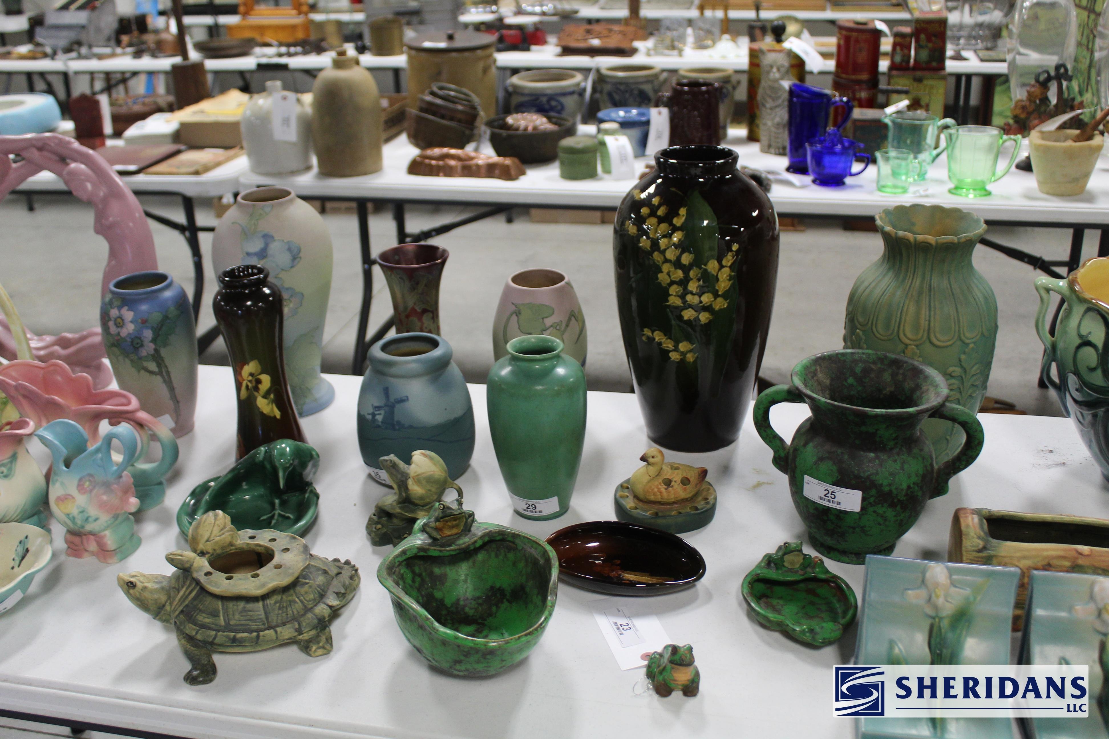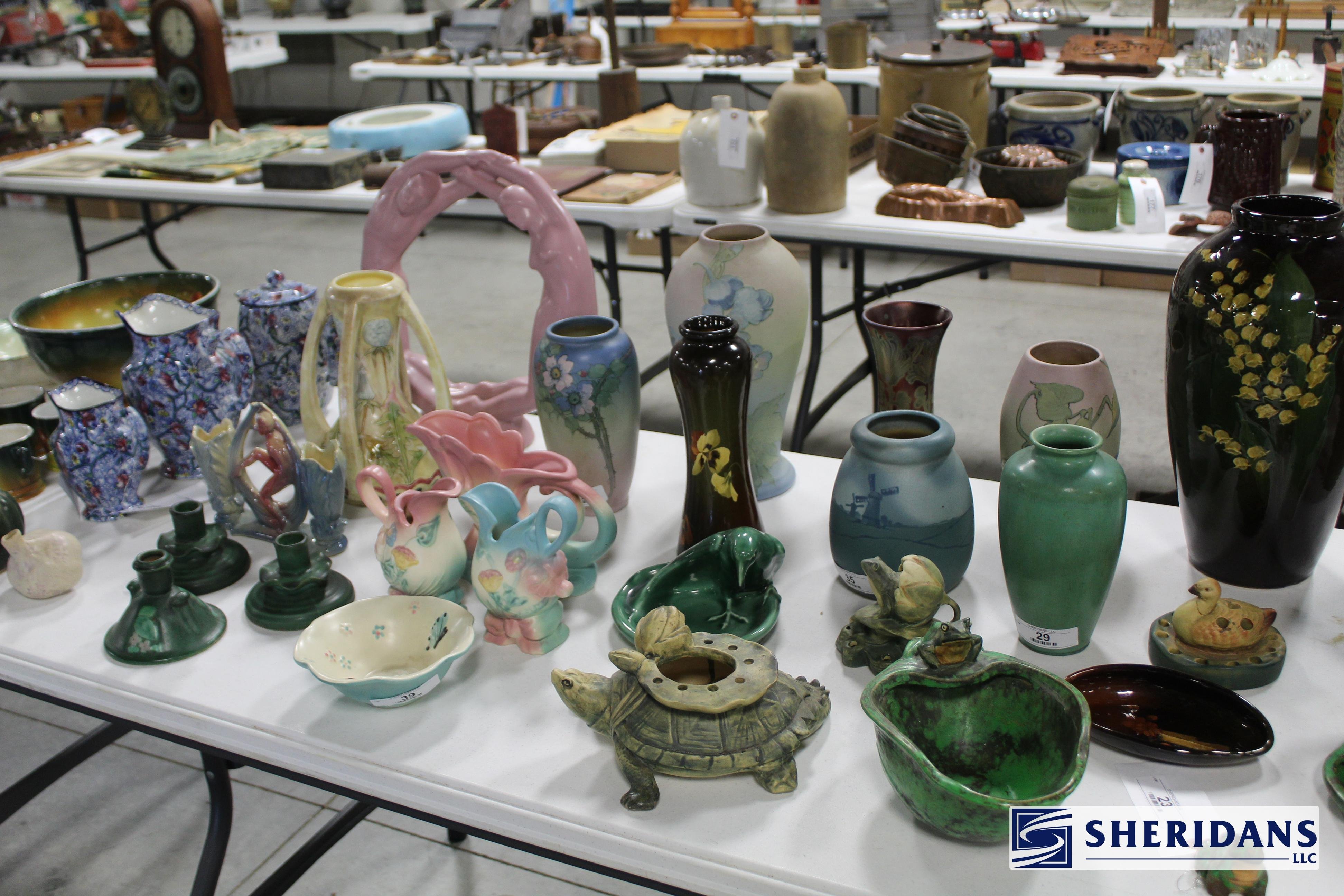 Pottery: Large collection of Weller pottery including L’Art pillow vase, multiple Hudson vases (signed examples), Coppertone frogs, trays, bowls & vases, Muskota animal-form flower frogs, Dresden vase, Sicard vase, candlesticks & decorated examples; collection of Roseville pottery including Rozane pillow vase, arts & crafts jardinière & bookends; Rookwood pottery including 1926 arts & crafts vase, decorated tray & rook pin tray; Nippon decorated vase & pitcher; Royal Doulton large character mugs including Gunsmith, Old Salt, Blacksmith, North American Indian & The Falconer; Royal Dux figural pieces; Hull pottery group including bonnets & cornucopia; McCoy art pottery vase; Owens floral vase; Burley Winter embossed vase; Anfora four-handled vase; RS Prussia serving bowls; Ringtons Maling ware pitchers; Theodore Haviland Limoges china set; Wedgwood biscuit jar; Wheeling stoneware cider bowl; German decorated crocks & stoneware crocks; flow blue & blue & white transferware pitchers & platters; Fiesta ware collection; Hall Jewel tea pitcher; Williamsburg pewter teapot; assorted oriental pottery including ginger jar & decorative pieces; jade bowls & cloisonne pieces.