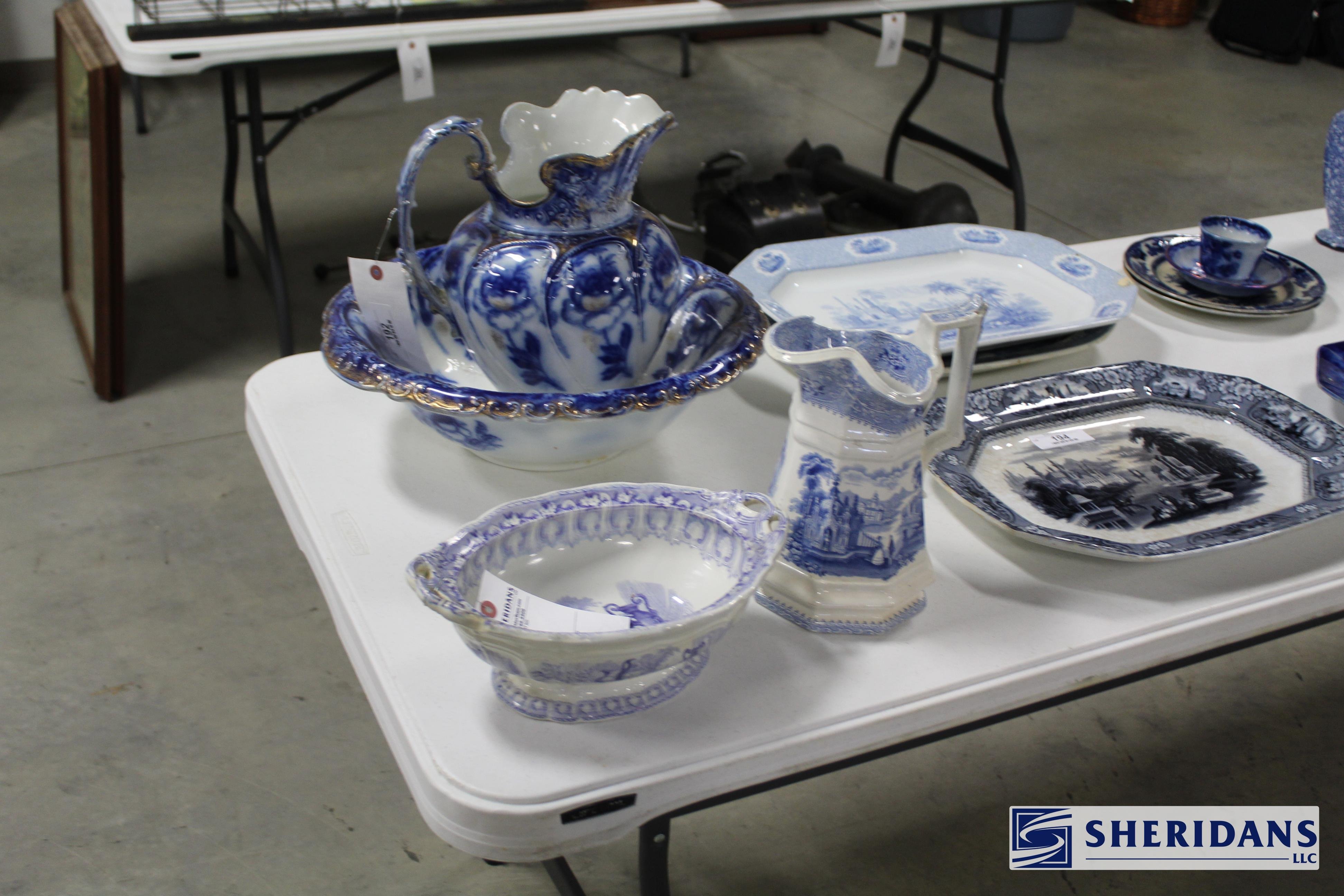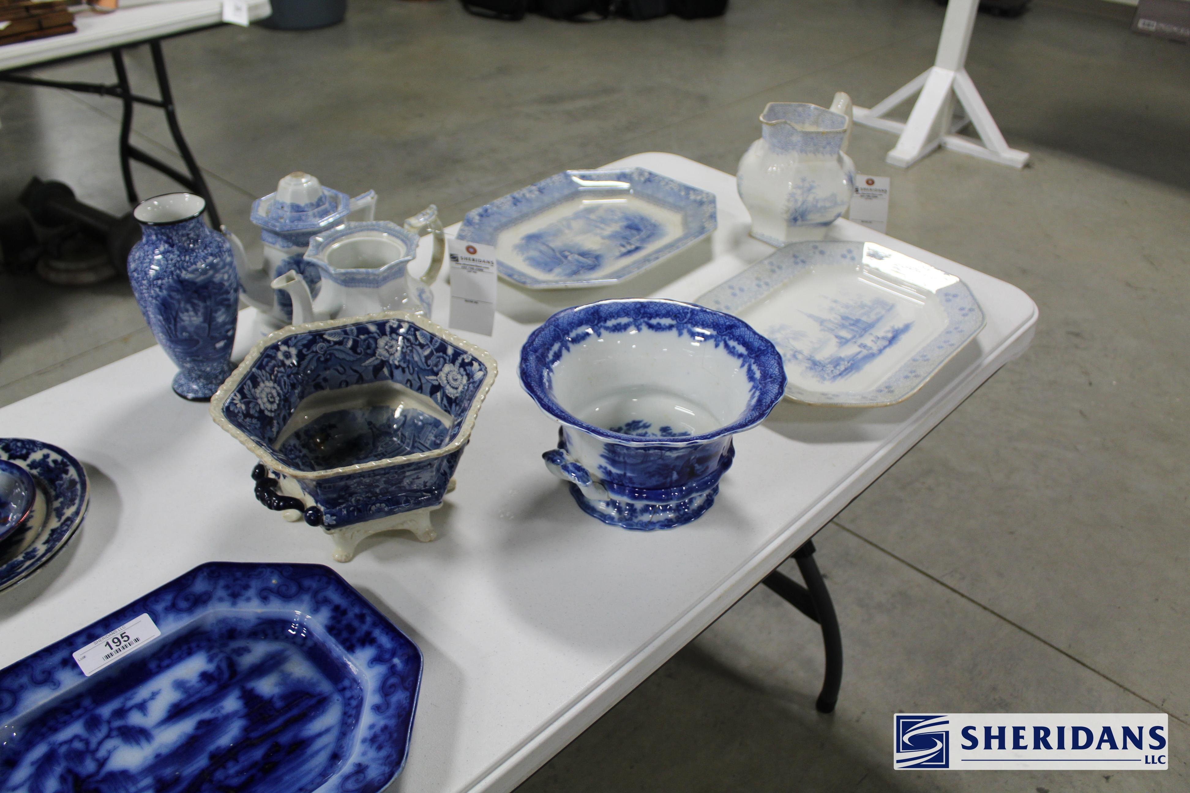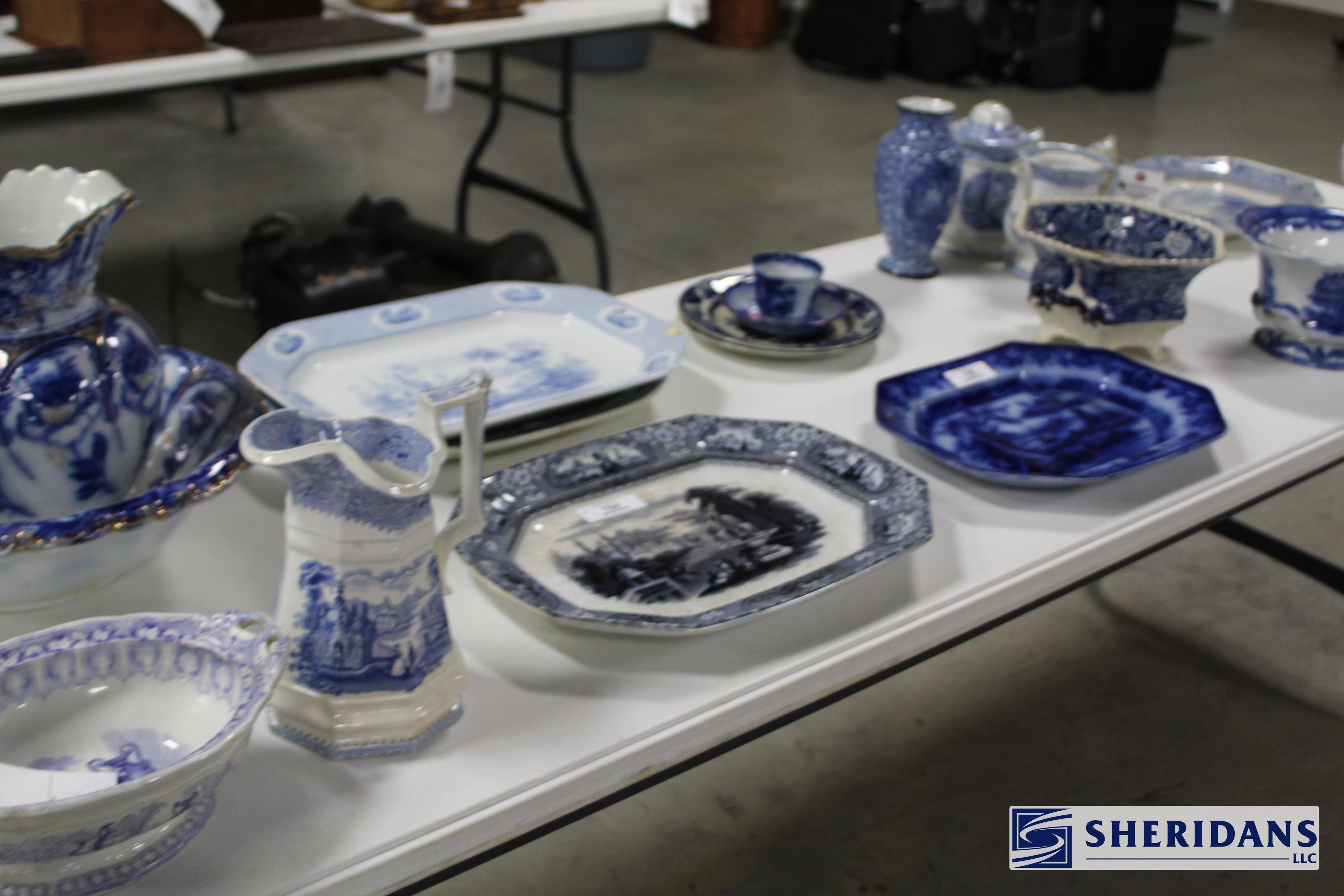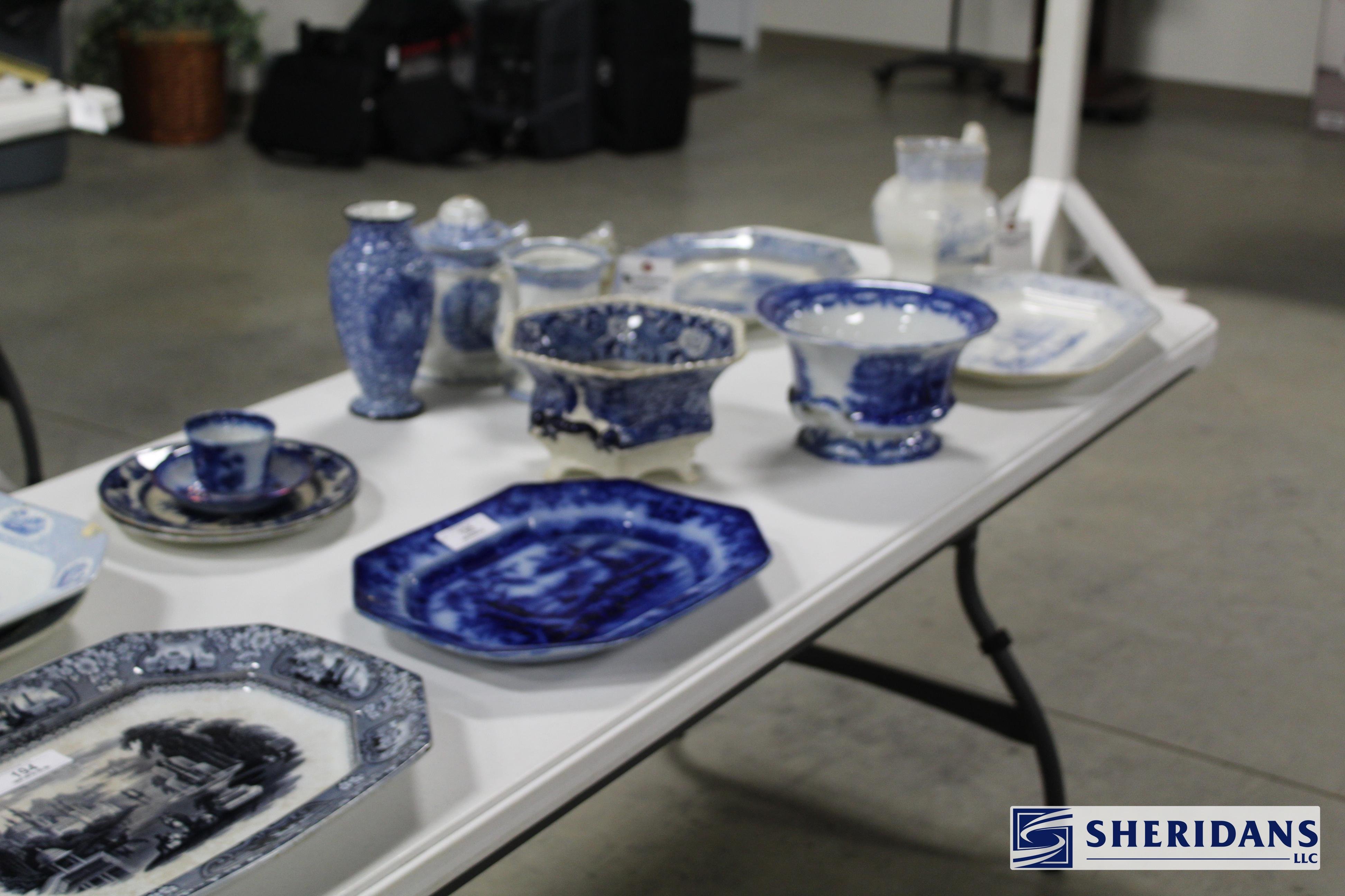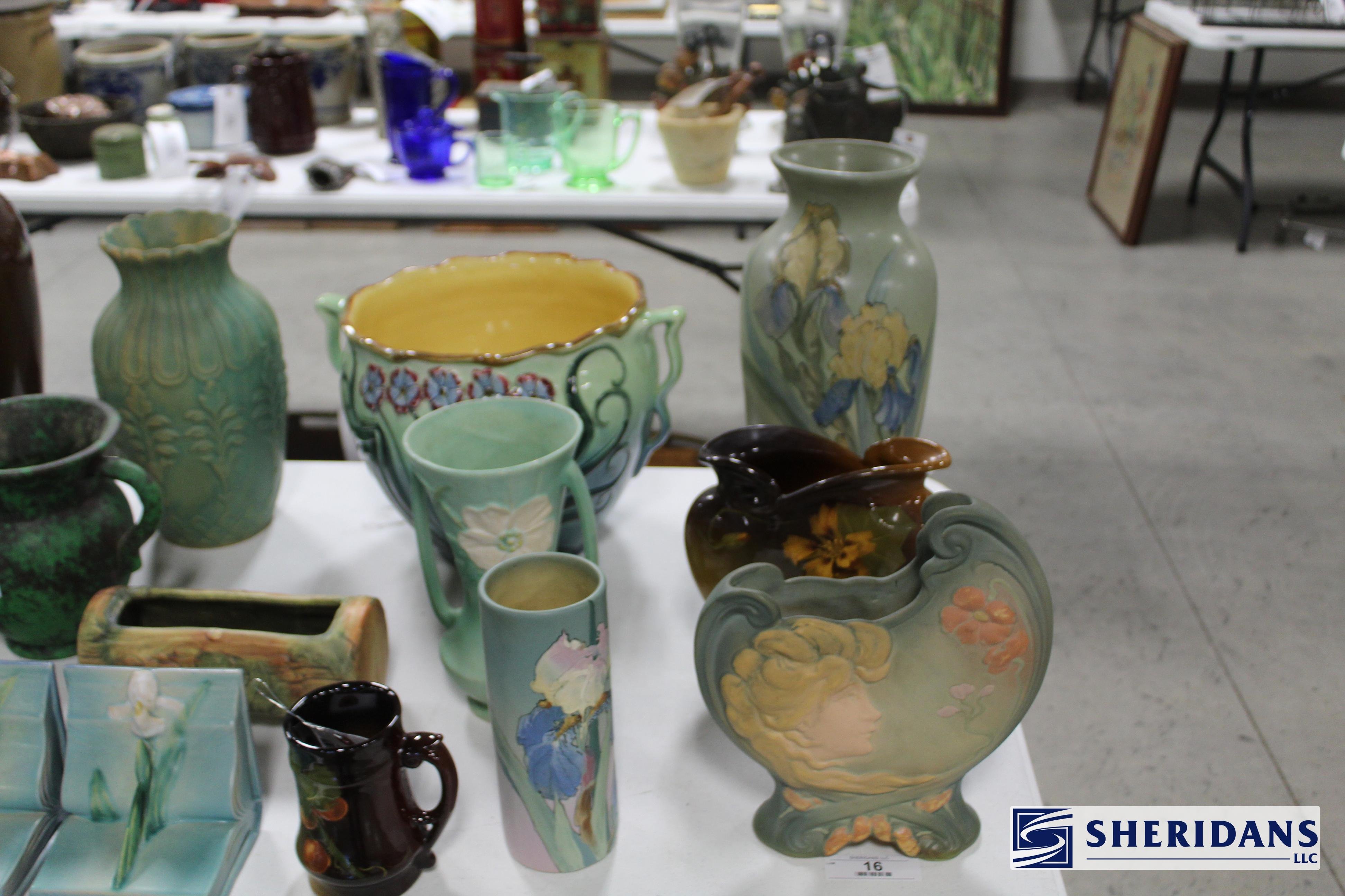 Pottery: Large collection of Weller pottery including L’Art pillow vase, multiple Hudson vases (signed examples), Coppertone frogs, trays, bowls & vases, Muskota animal-form flower frogs, Dresden vase, Sicard vase, candlesticks & decorated examples; collection of Roseville pottery including Rozane pillow vase, arts & crafts jardinière & bookends; Rookwood pottery including 1926 arts & crafts vase, decorated tray & rook pin tray; Nippon decorated vase & pitcher; Royal Doulton large character mugs including Gunsmith, Old Salt, Blacksmith, North American Indian & The Falconer; Royal Dux figural pieces; Hull pottery group including bonnets & cornucopia; McCoy art pottery vase; Owens floral vase; Burley Winter embossed vase; Anfora four-handled vase; RS Prussia serving bowls; Ringtons Maling ware pitchers; Theodore Haviland Limoges china set; Wedgwood biscuit jar; Wheeling stoneware cider bowl; German decorated crocks & stoneware crocks; flow blue & blue & white transferware pitchers & platters; Fiesta ware collection; Hall Jewel tea pitcher; Williamsburg pewter teapot; assorted oriental pottery including ginger jar & decorative pieces; jade bowls & cloisonne pieces.
