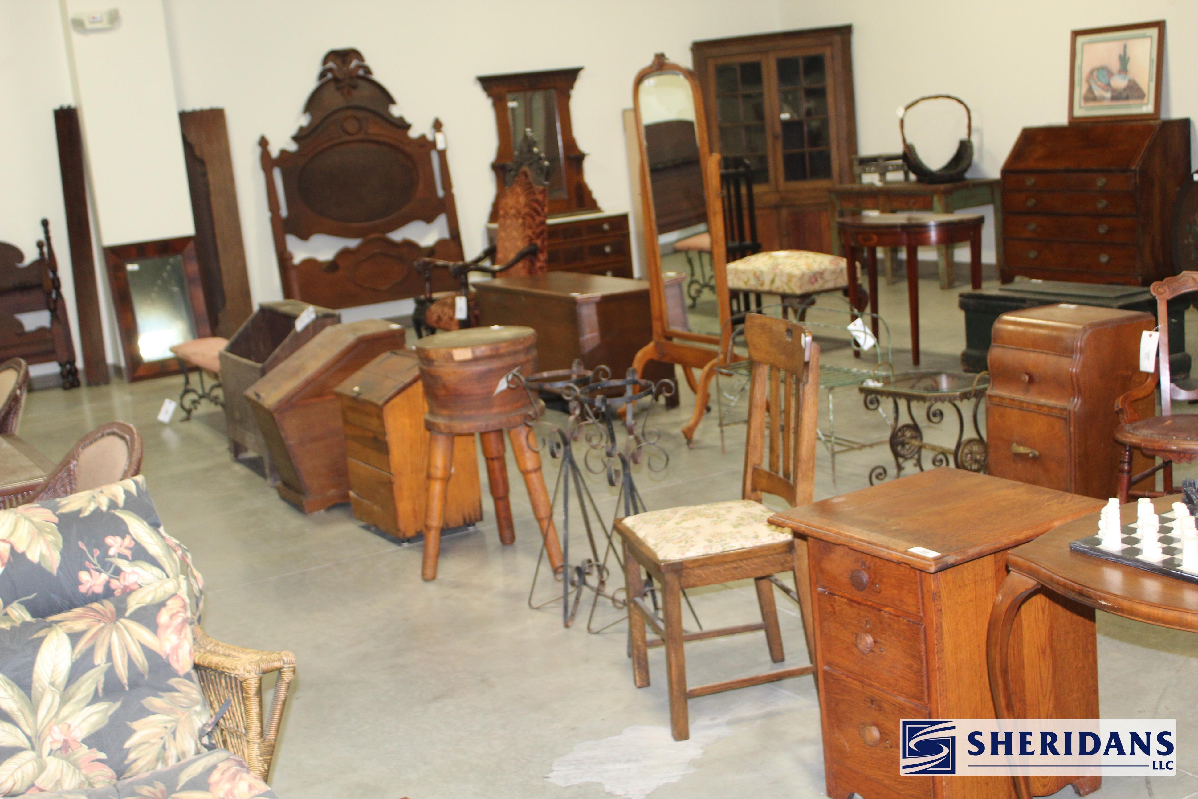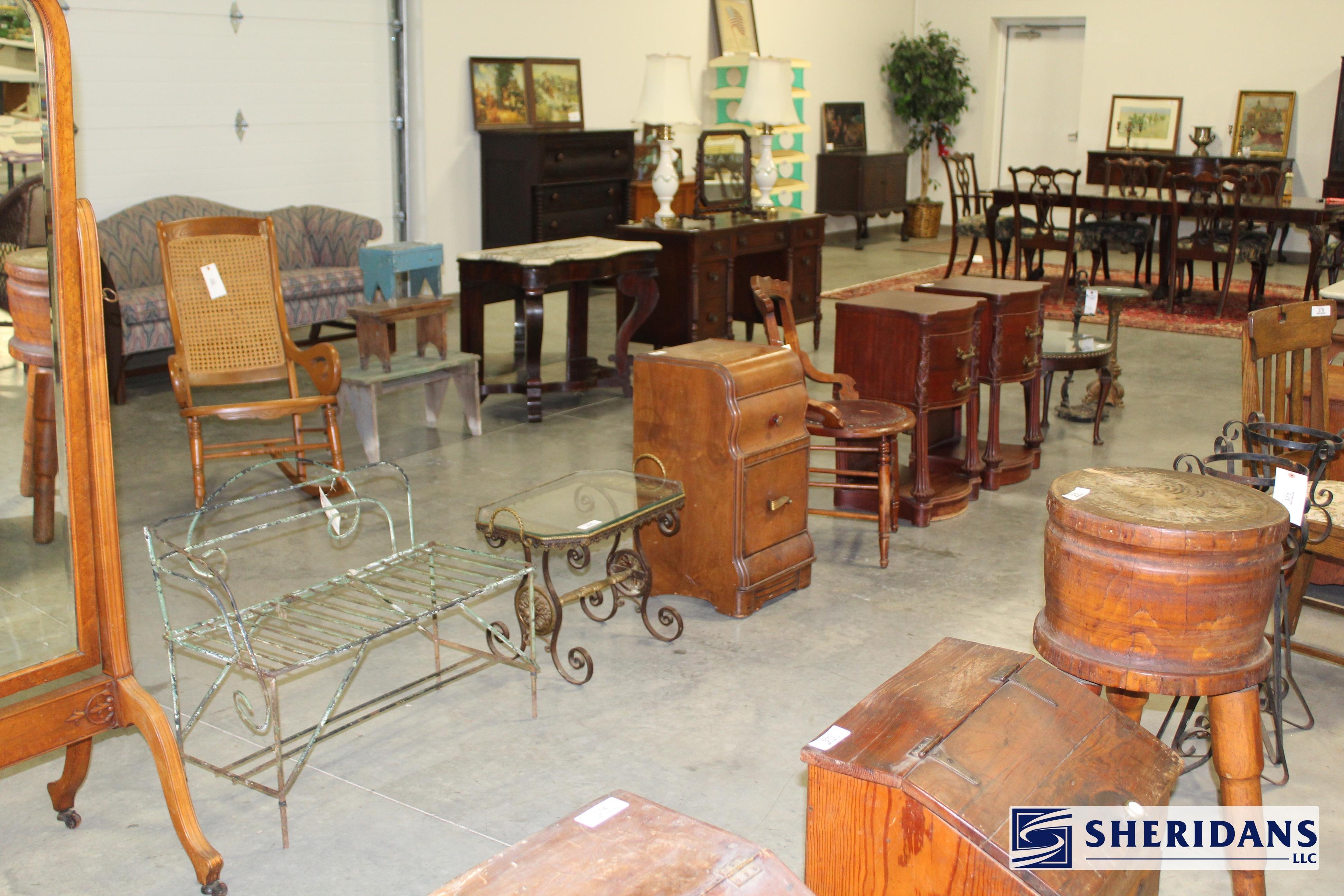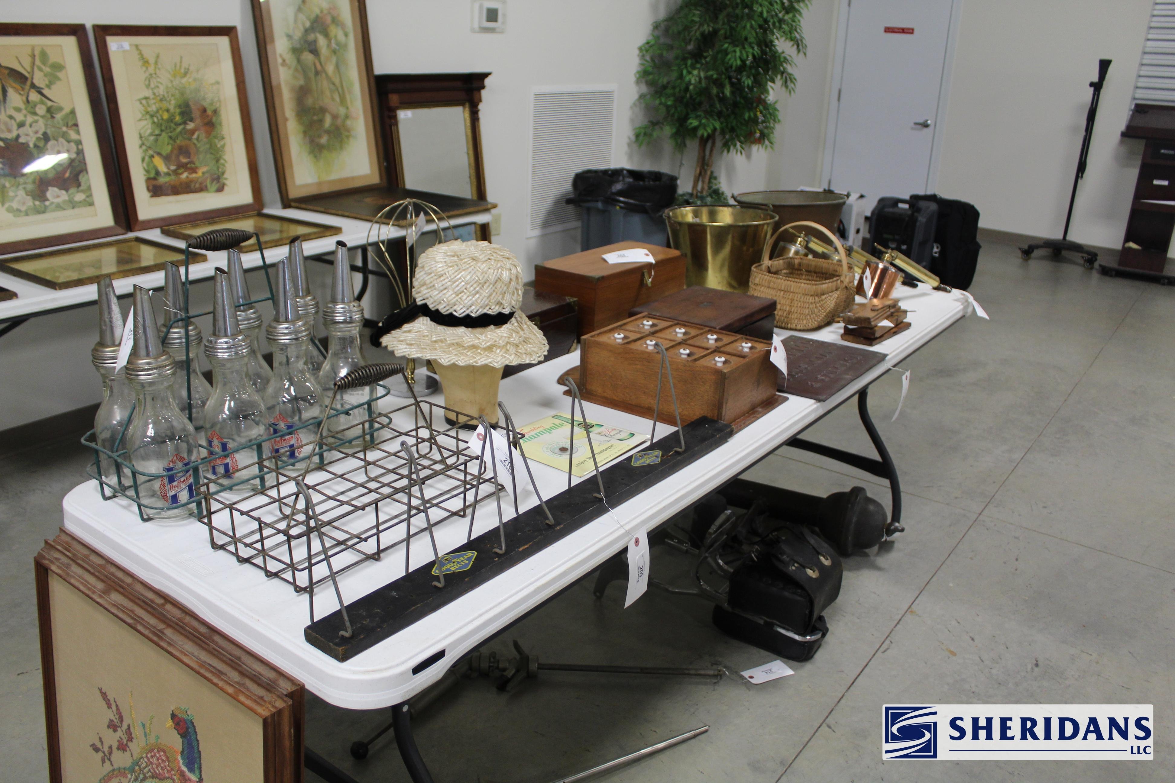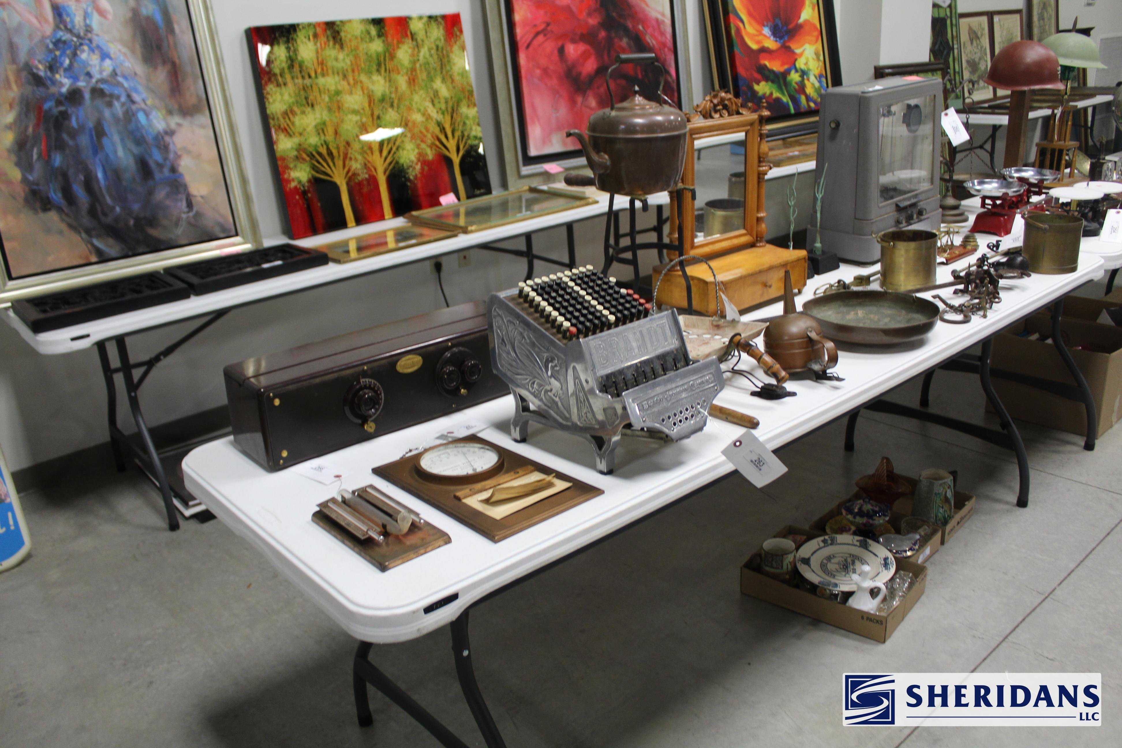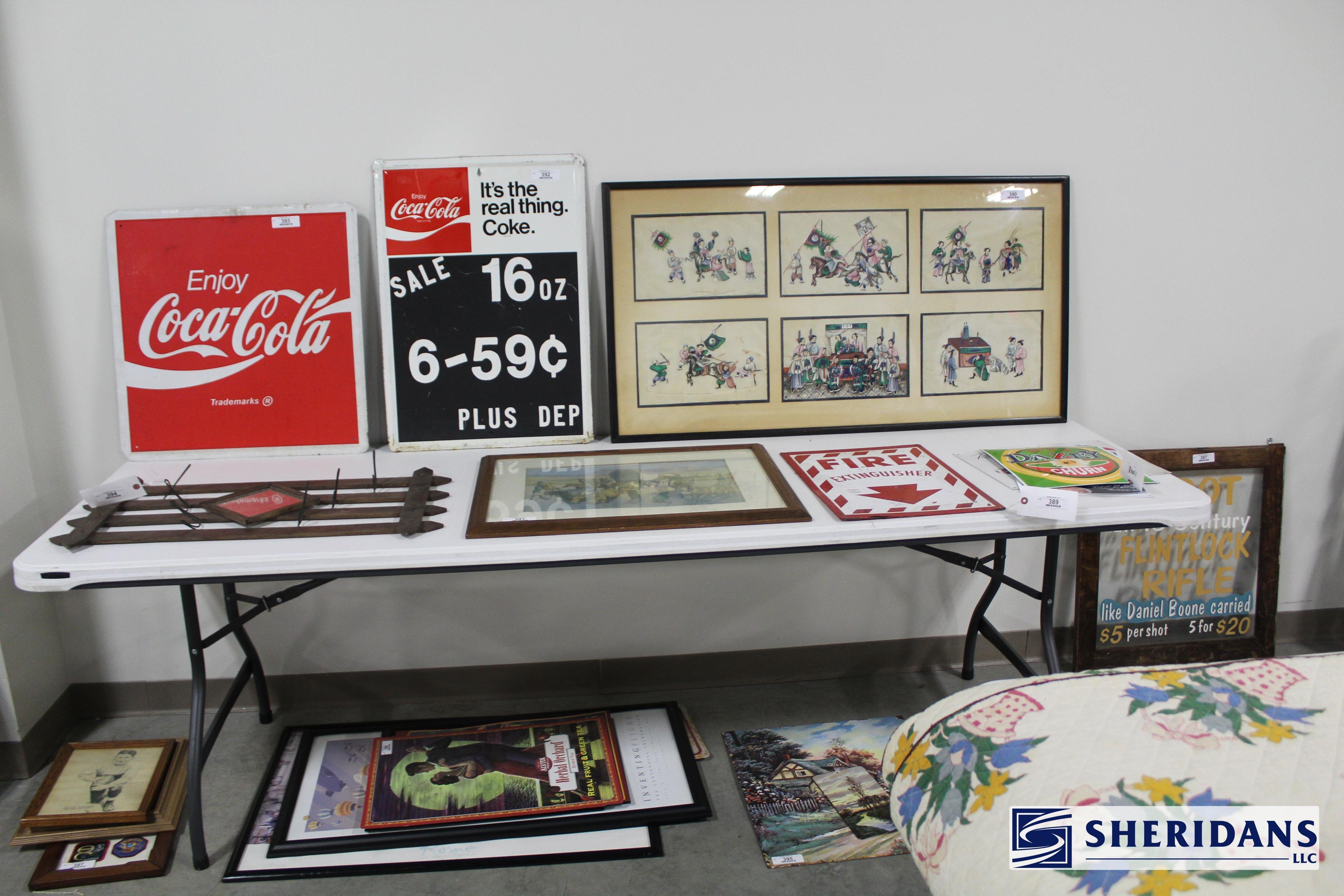 Antiques: Extensive selection of antique furniture including walnut, mahogany & oak pieces such as desks, dressers, cupboards, side tables, mirrors, beds, empire & Victorian examples, wicker furniture & marble-top stands; framed artwork & paintings including oil on canvas works, signed prints, oriental artwork & stained glass; advertising & country store items including Coca-Cola signs, thermometers, menu boards, Gruen advertising clock, Remington gun displays, Huston Bickett hardware sign, tobacco & fruit crate labels, & various metal & porcelain signs; lighting including brass & kerosene lamps, Aladdin lantern, trench art lamps & decorative shades; clocks & timepieces including Seth Thomas mantel clock & other advertising clocks; cast iron items including urns, planter stands, match holders, doorstops, fireplace tools & household pieces; scales & store fixtures including Winchester brass bushel scale, merchant scales, balance scales & Brandt automatic cashier; vintage toys & collectibles including Marx tin toy, antique push toy, Madame Alexander dolls & slot machine; sporting & military items including mounted deer head, powder flask & Signal Corps box; glass & decorative arts including Fostoria, candlewick, copper luster & assorted art glass