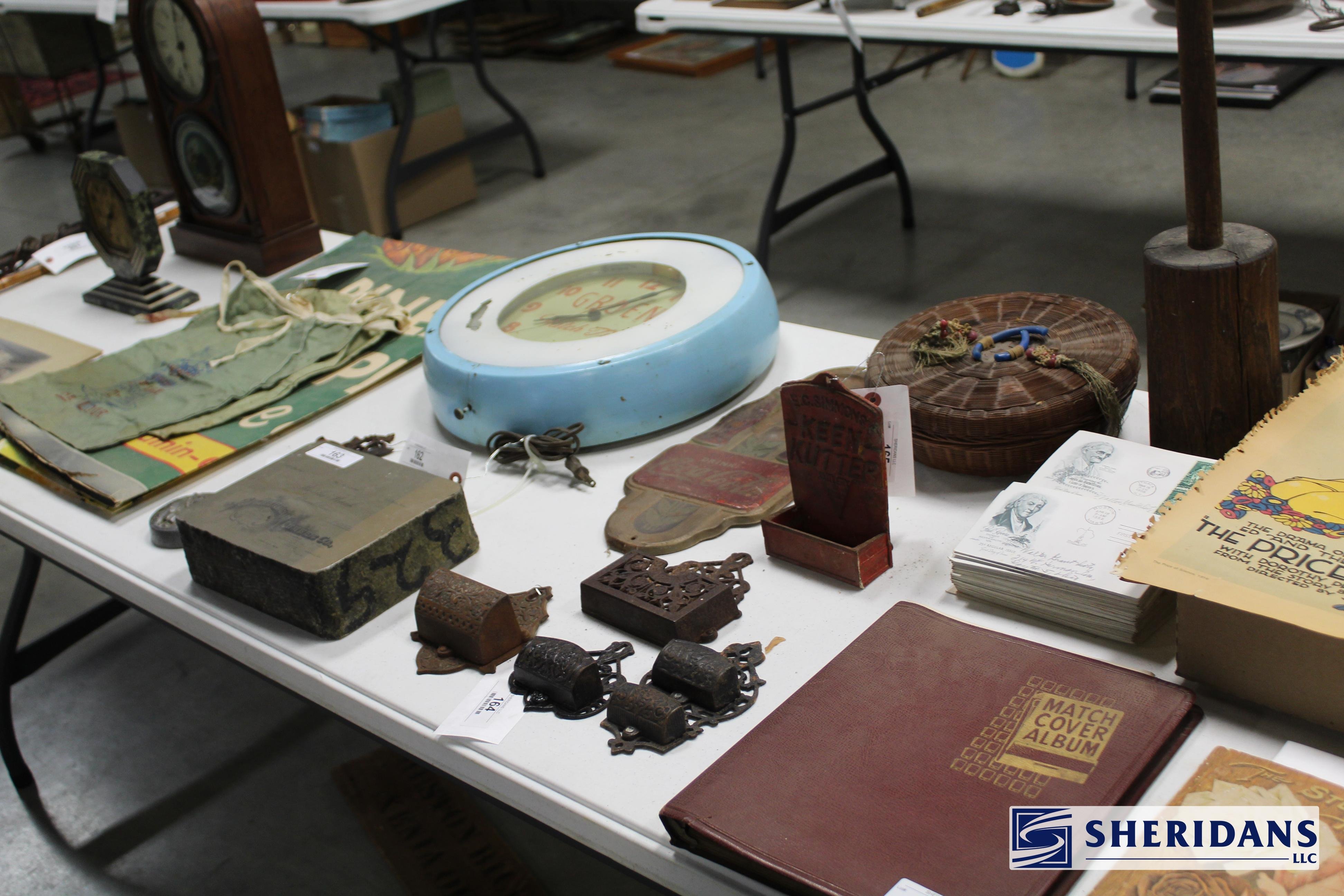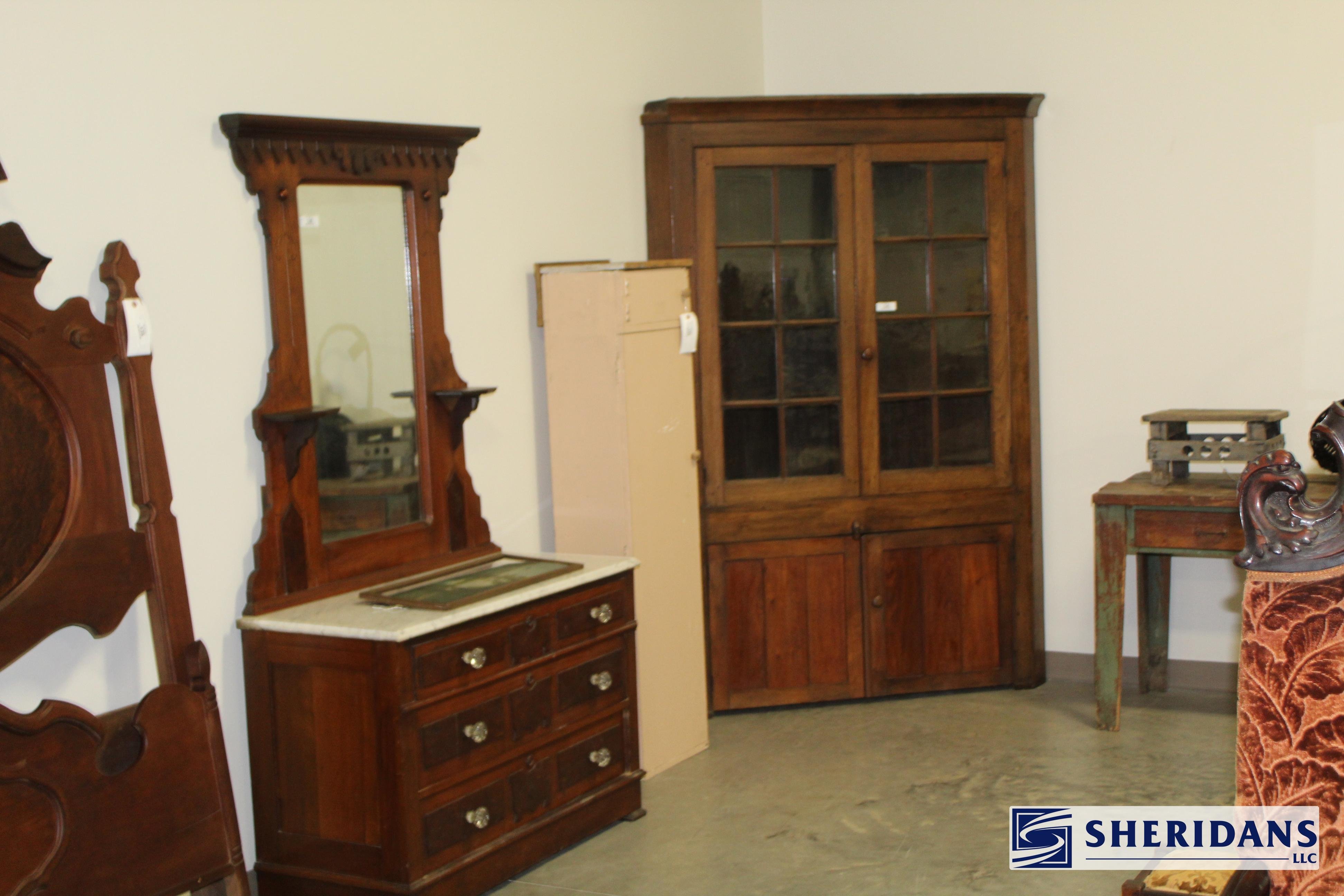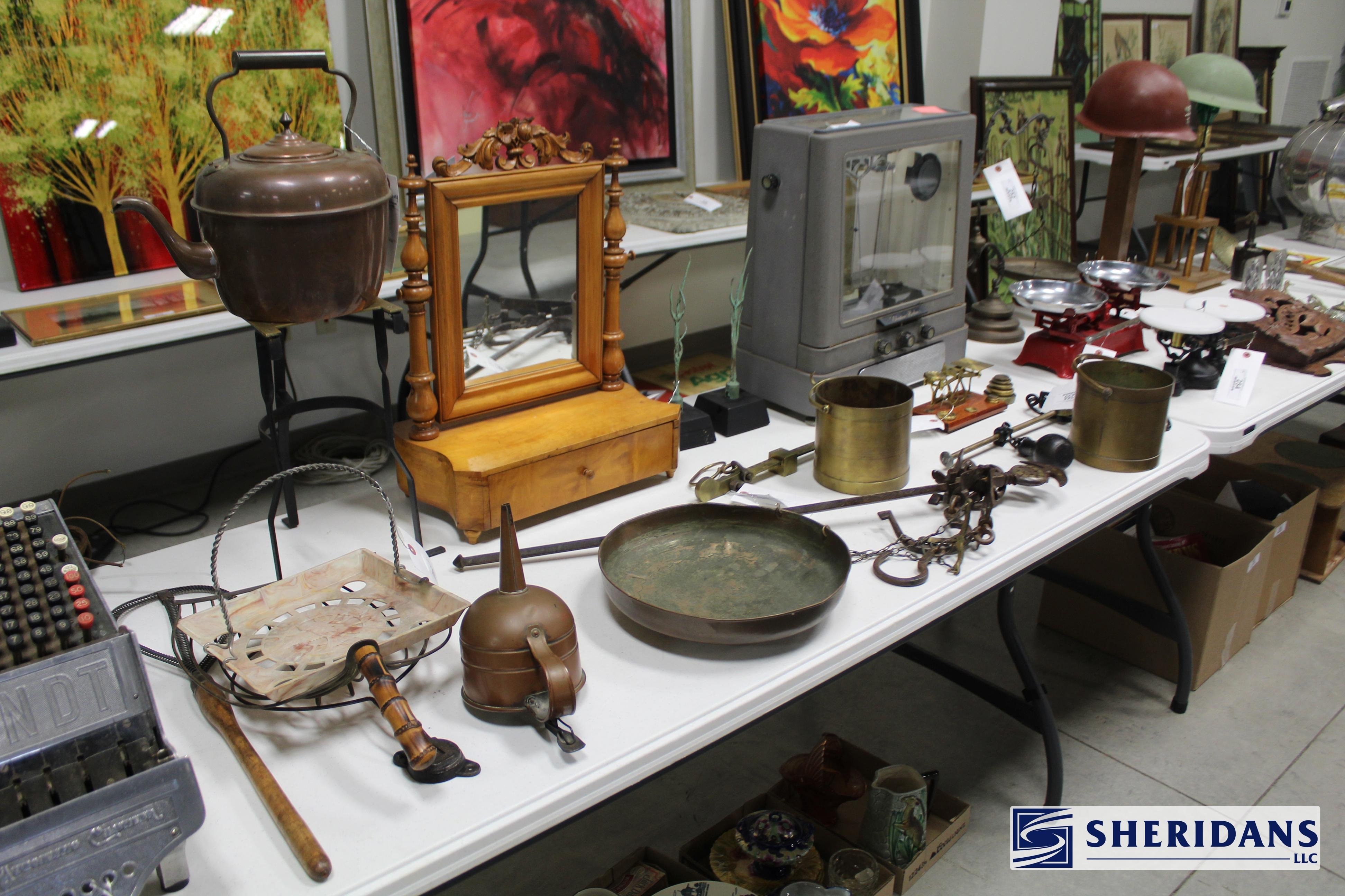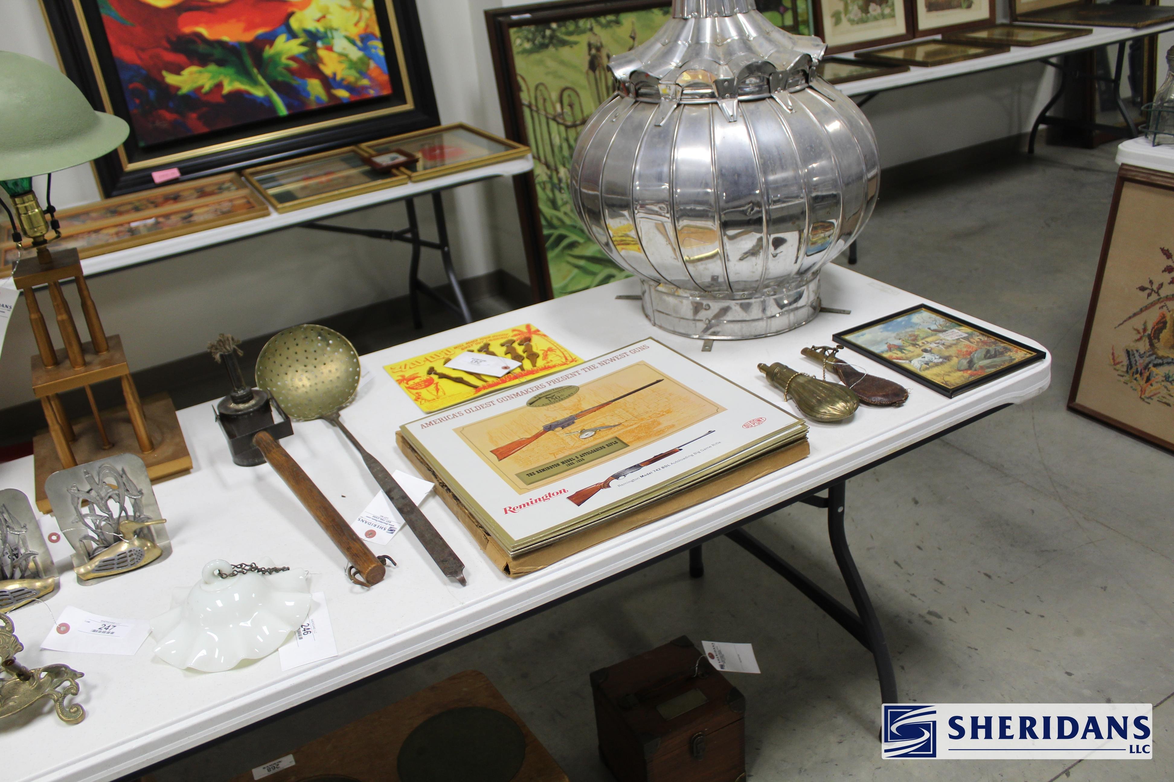 Antiques: Extensive selection of antique furniture including walnut, mahogany & oak pieces such as desks, dressers, cupboards, side tables, mirrors, beds, empire & Victorian examples, wicker furniture & marble-top stands; framed artwork & paintings including oil on canvas works, signed prints, oriental artwork & stained glass; advertising & country store items including Coca-Cola signs, thermometers, menu boards, Gruen advertising clock, Remington gun displays, Huston Bickett hardware sign, tobacco & fruit crate labels, & various metal & porcelain signs; lighting including brass & kerosene lamps, Aladdin lantern, trench art lamps & decorative shades; clocks & timepieces including Seth Thomas mantel clock & other advertising clocks; cast iron items including urns, planter stands, match holders, doorstops, fireplace tools & household pieces; scales & store fixtures including Winchester brass bushel scale, merchant scales, balance scales & Brandt automatic cashier; vintage toys & collectibles including Marx tin toy, antique push toy, Madame Alexander dolls & slot machine; sporting & military items including mounted deer head, powder flask & Signal Corps box; glass & decorative arts including Fostoria, candlewick, copper luster & assorted art glass