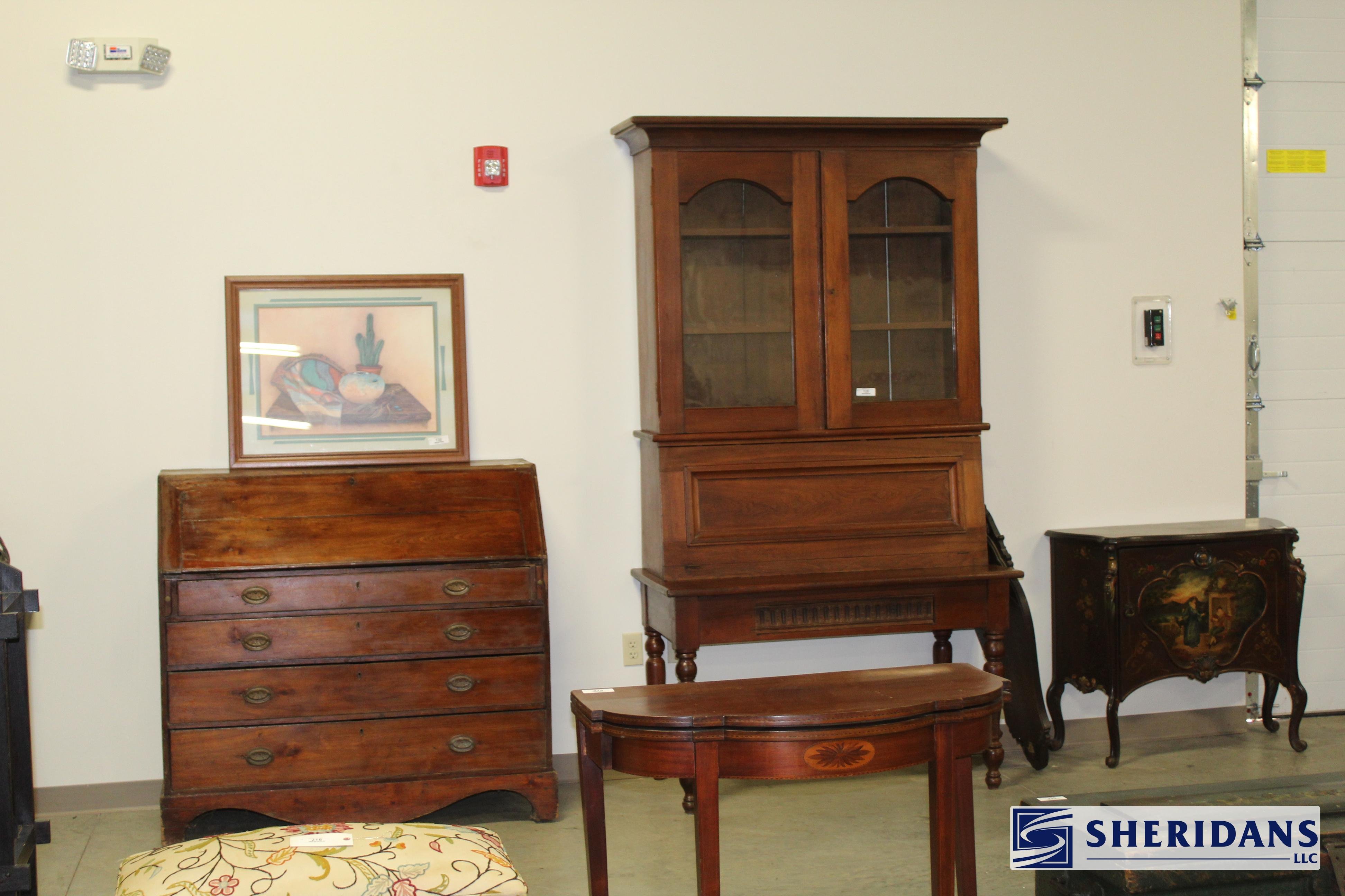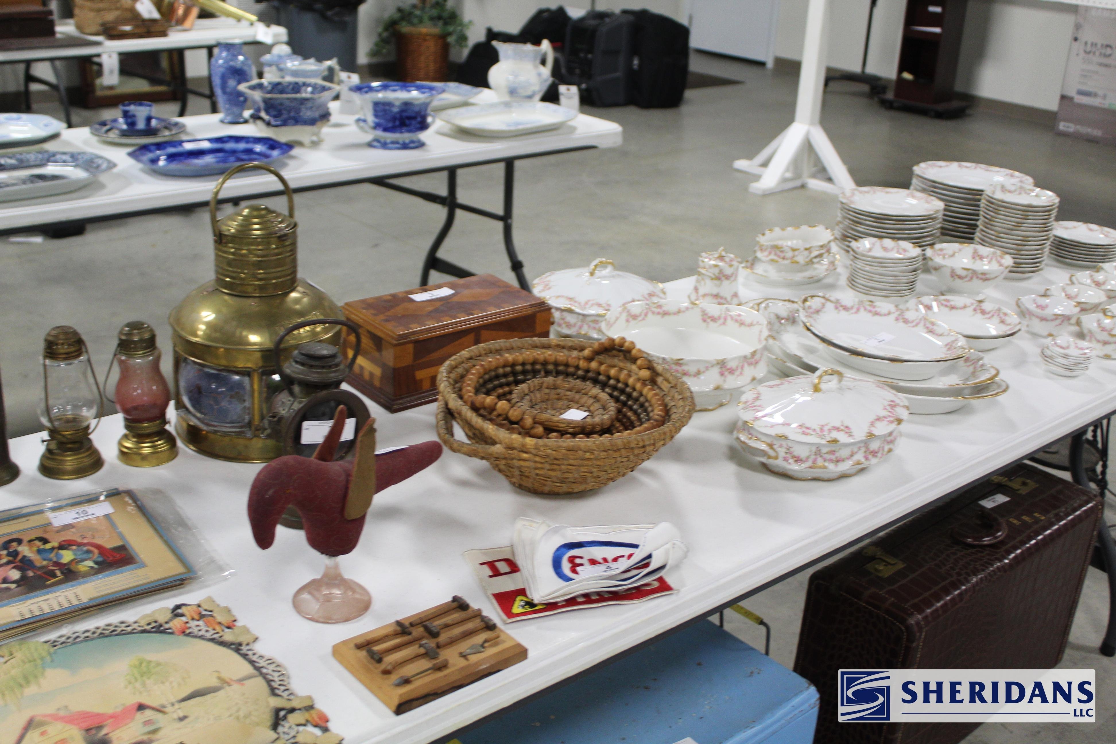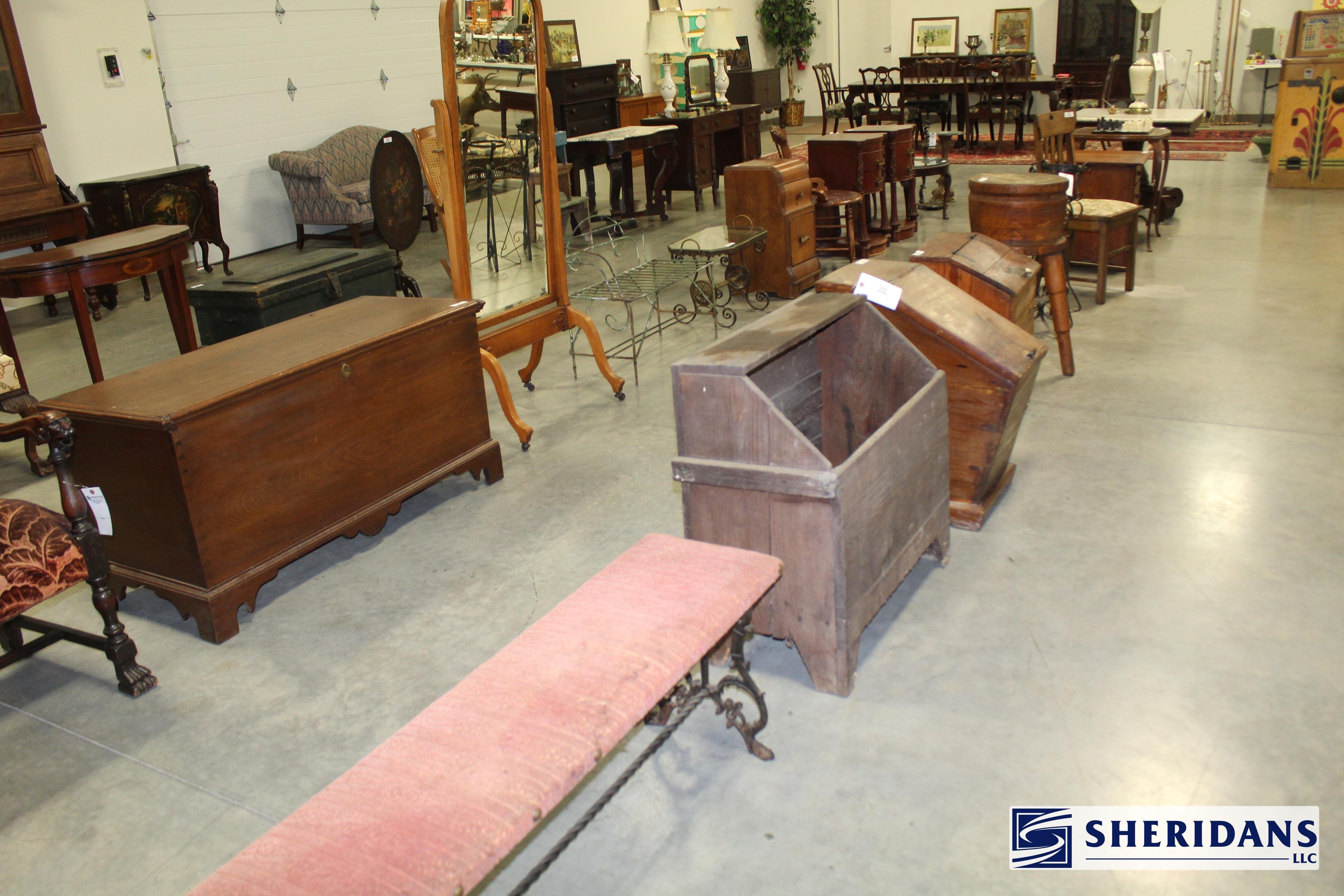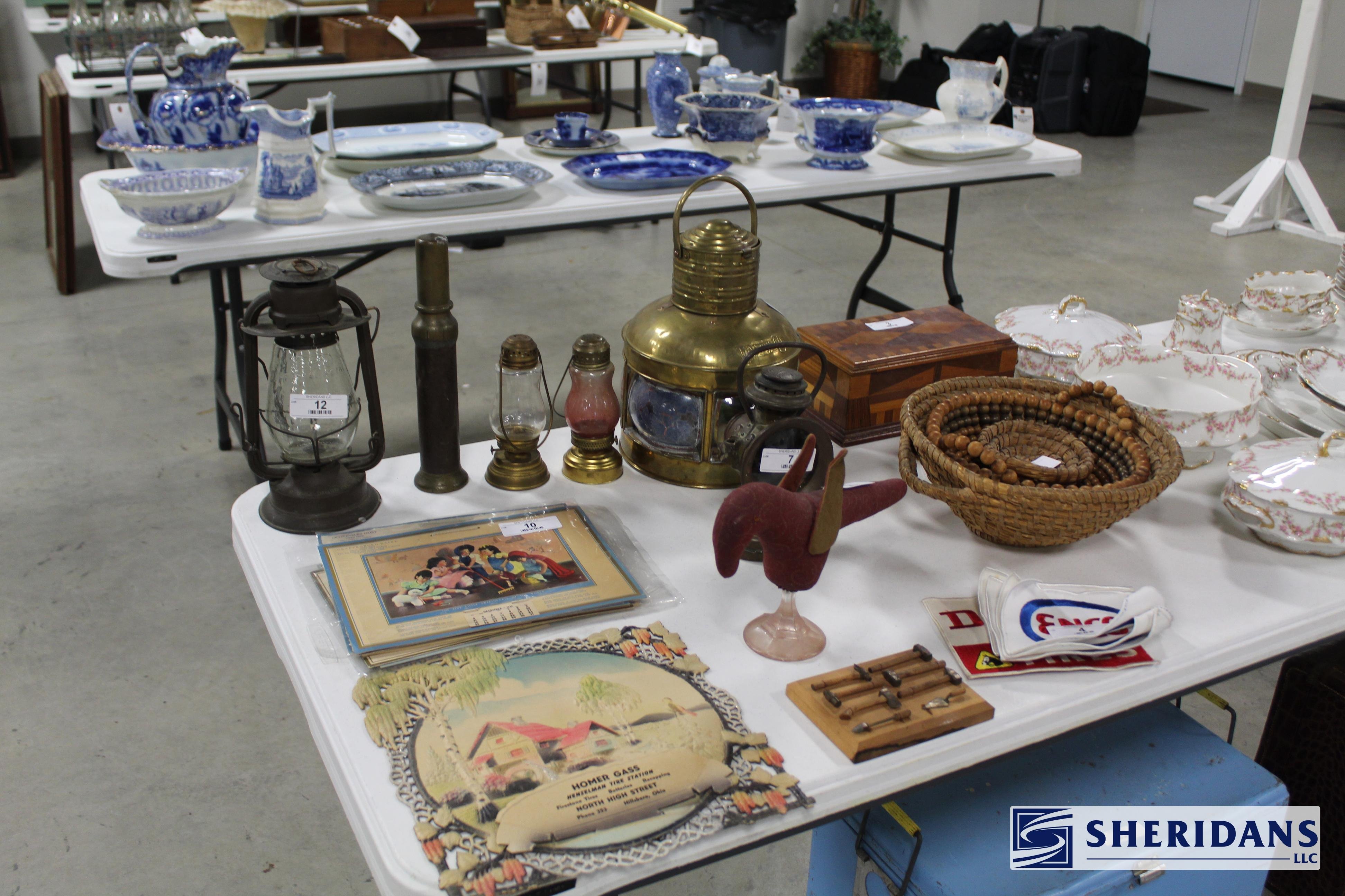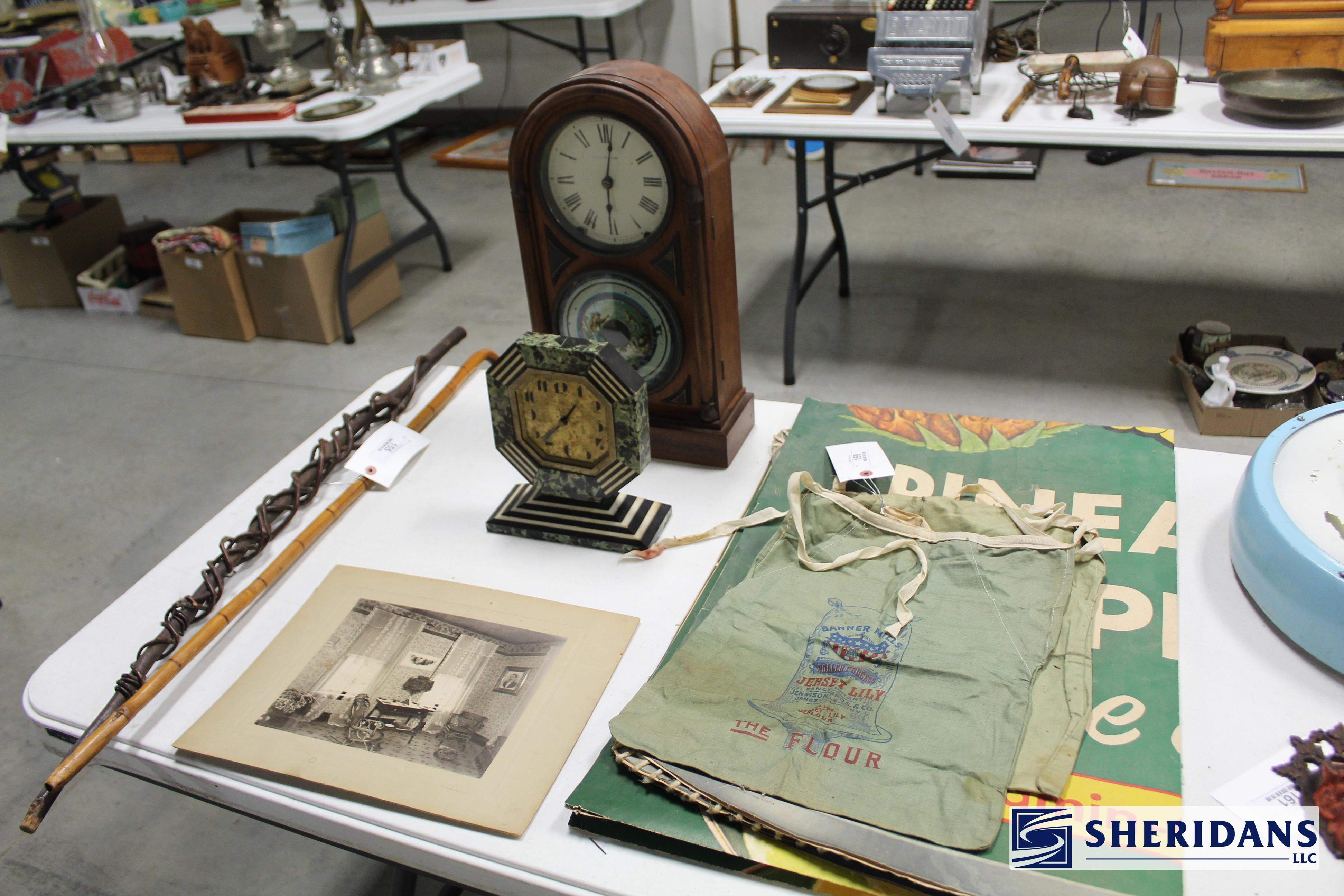 Antiques: Extensive selection of antique furniture including walnut, mahogany & oak pieces such as desks, dressers, cupboards, side tables, mirrors, beds, empire & Victorian examples, wicker furniture & marble-top stands; framed artwork & paintings including oil on canvas works, signed prints, oriental artwork & stained glass; advertising & country store items including Coca-Cola signs, thermometers, menu boards, Gruen advertising clock, Remington gun displays, Huston Bickett hardware sign, tobacco & fruit crate labels, & various metal & porcelain signs; lighting including brass & kerosene lamps, Aladdin lantern, trench art lamps & decorative shades; clocks & timepieces including Seth Thomas mantel clock & other advertising clocks; cast iron items including urns, planter stands, match holders, doorstops, fireplace tools & household pieces; scales & store fixtures including Winchester brass bushel scale, merchant scales, balance scales & Brandt automatic cashier; vintage toys & collectibles including Marx tin toy, antique push toy, Madame Alexander dolls & slot machine; sporting & military items including mounted deer head, powder flask & Signal Corps box; glass & decorative arts including Fostoria, candlewick, copper luster & assorted art glass