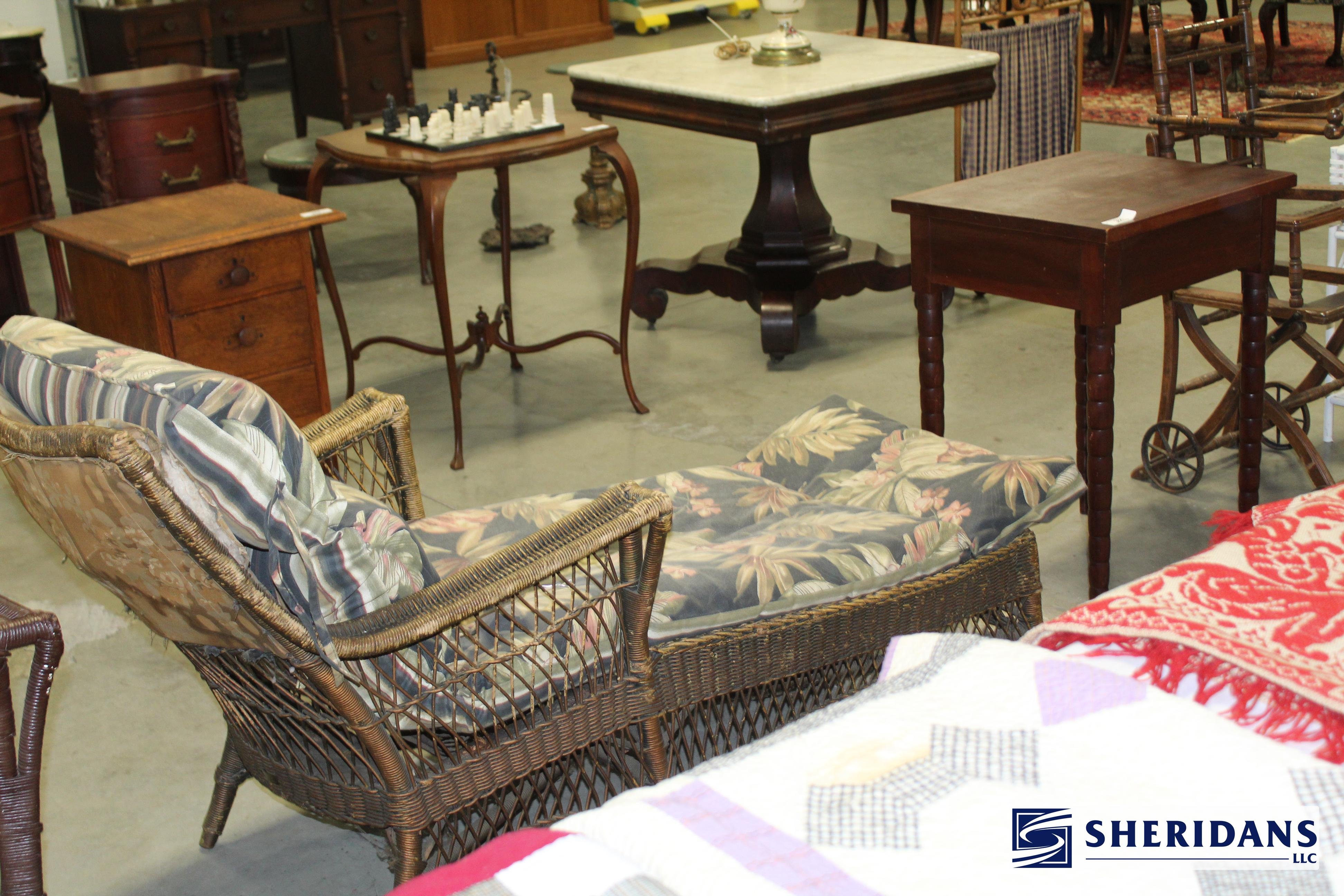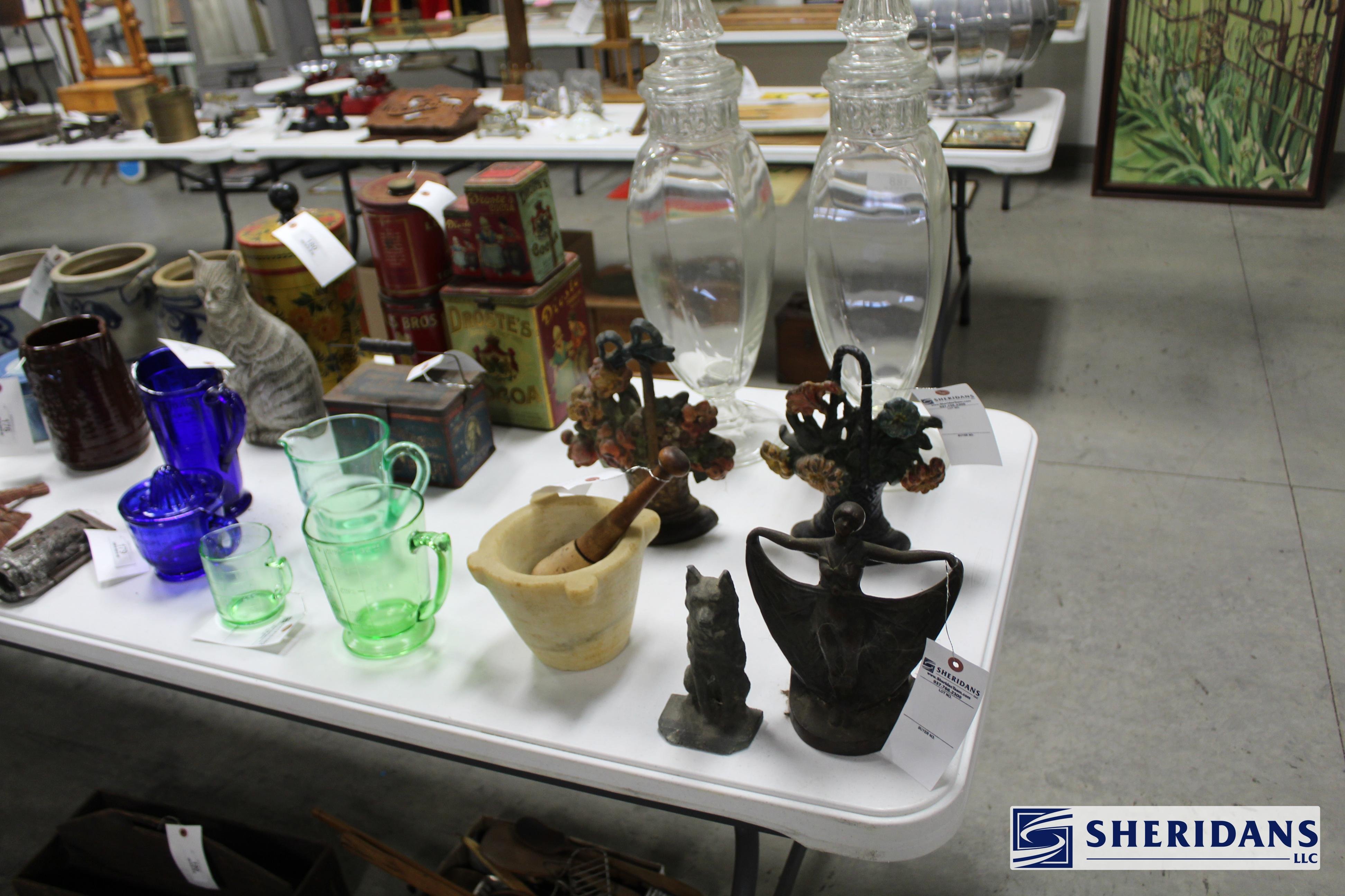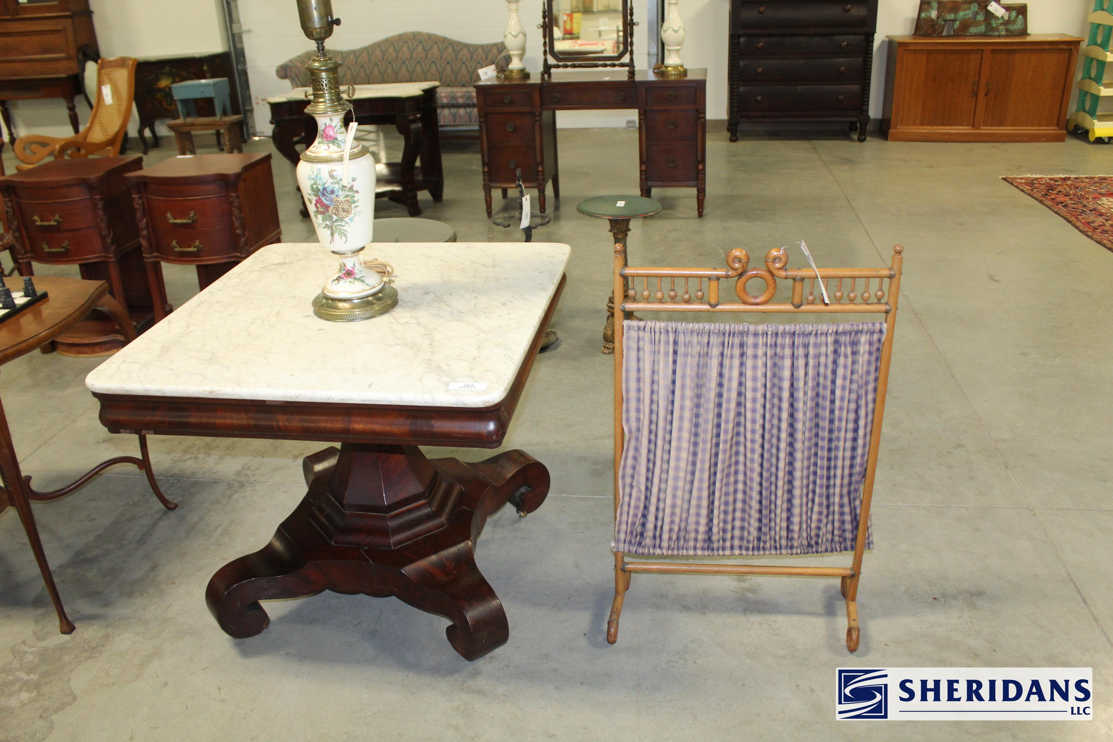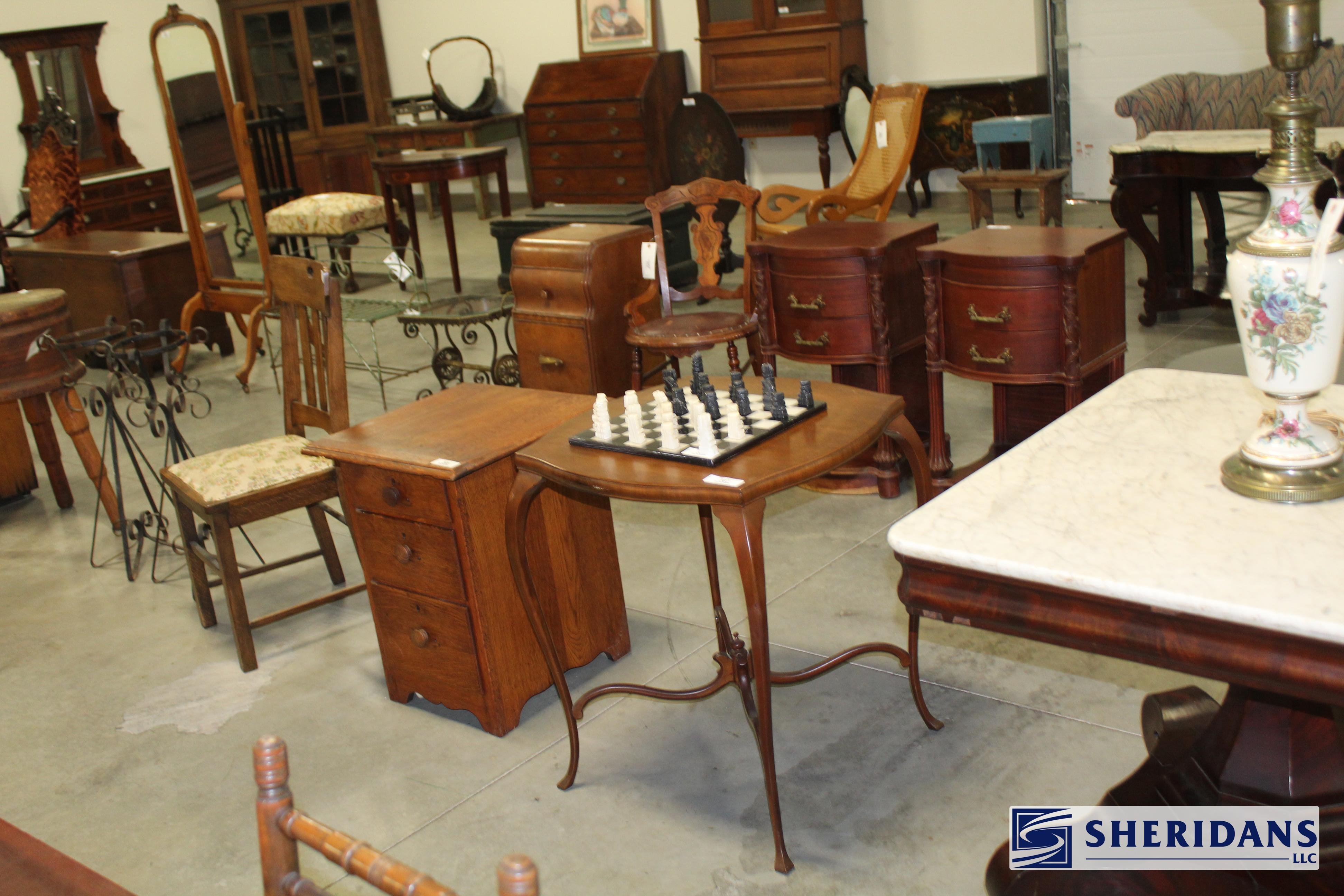 Antiques: Extensive selection of antique furniture including walnut, mahogany & oak pieces such as desks, dressers, cupboards, side tables, mirrors, beds, empire & Victorian examples, wicker furniture & marble-top stands; framed artwork & paintings including oil on canvas works, signed prints, oriental artwork & stained glass; advertising & country store items including Coca-Cola signs, thermometers, menu boards, Gruen advertising clock, Remington gun displays, Huston Bickett hardware sign, tobacco & fruit crate labels, & various metal & porcelain signs; lighting including brass & kerosene lamps, Aladdin lantern, trench art lamps & decorative shades; clocks & timepieces including Seth Thomas mantel clock & other advertising clocks; cast iron items including urns, planter stands, match holders, doorstops, fireplace tools & household pieces; scales & store fixtures including Winchester brass bushel scale, merchant scales, balance scales & Brandt automatic cashier; vintage toys & collectibles including Marx tin toy, antique push toy, Madame Alexander dolls & slot machine; sporting & military items including mounted deer head, powder flask & Signal Corps box; glass & decorative arts including Fostoria, candlewick, copper luster & assorted art glass