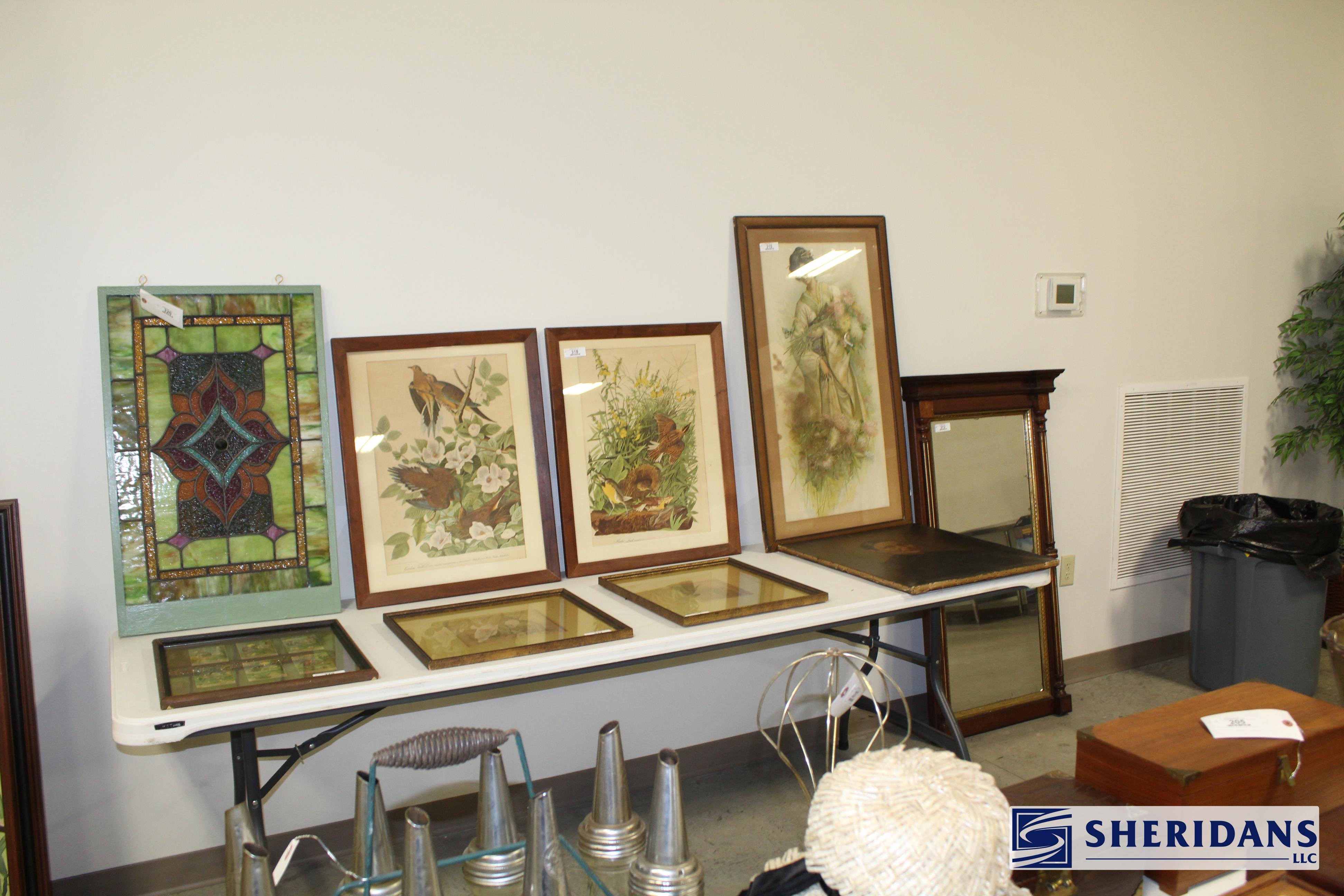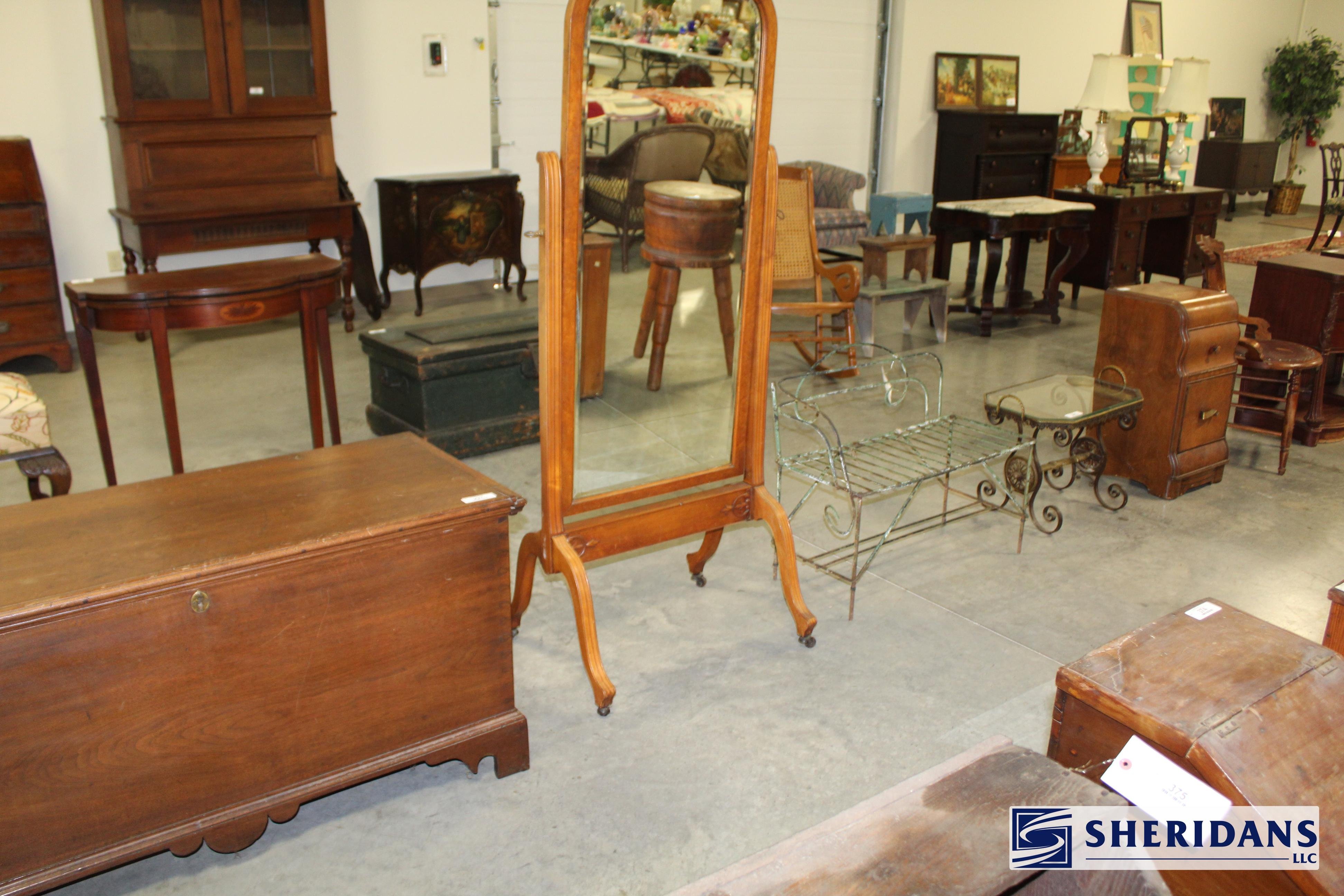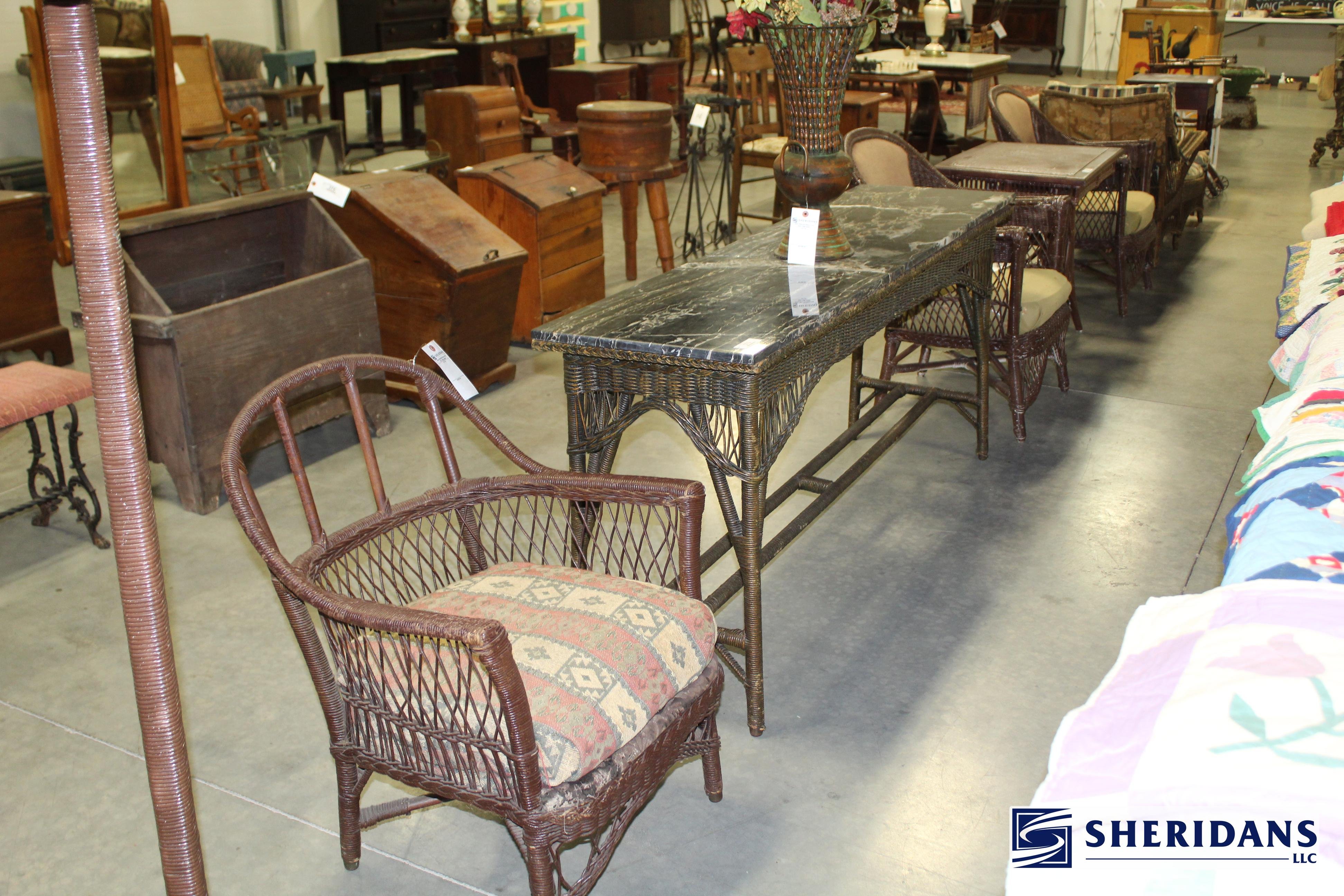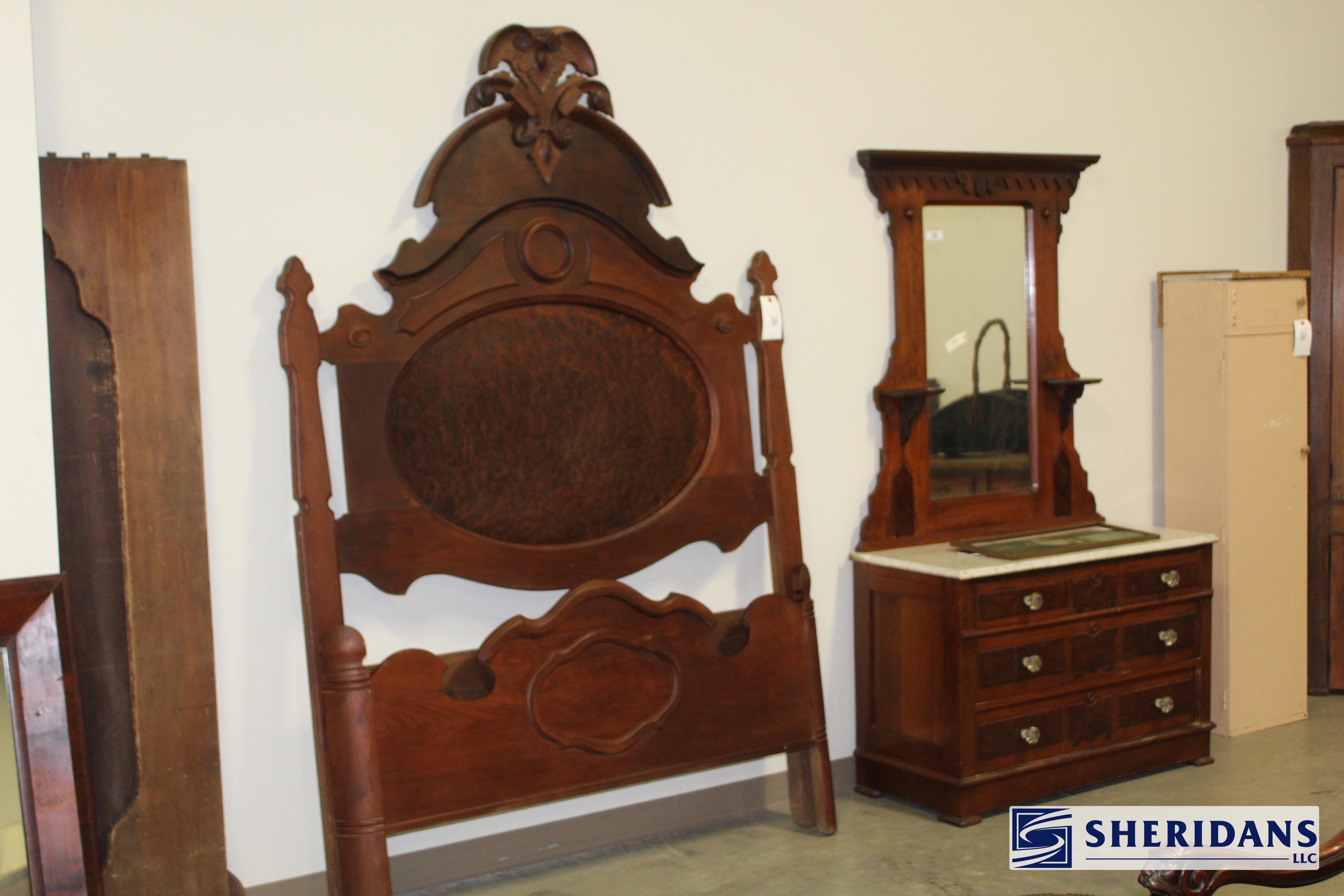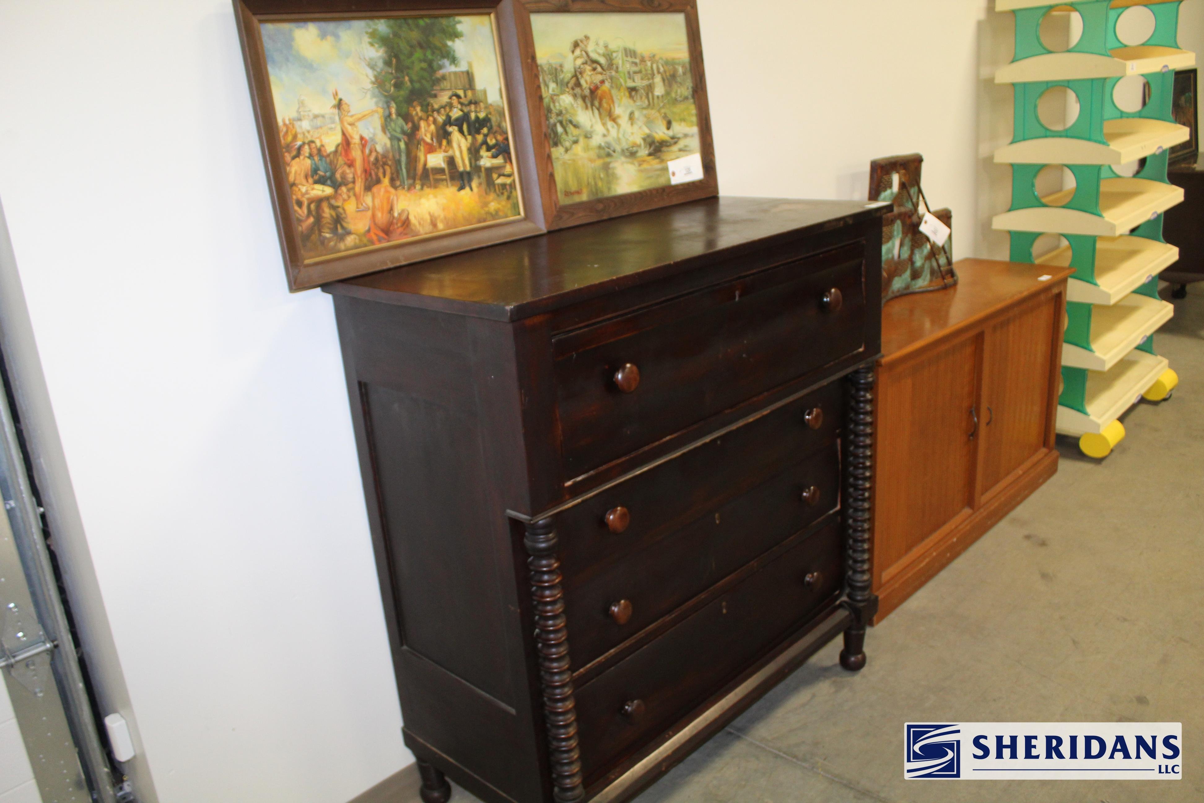 Antiques: Extensive selection of antique furniture including walnut, mahogany & oak pieces such as desks, dressers, cupboards, side tables, mirrors, beds, empire & Victorian examples, wicker furniture & marble-top stands; framed artwork & paintings including oil on canvas works, signed prints, oriental artwork & stained glass; advertising & country store items including Coca-Cola signs, thermometers, menu boards, Gruen advertising clock, Remington gun displays, Huston Bickett hardware sign, tobacco & fruit crate labels, & various metal & porcelain signs; lighting including brass & kerosene lamps, Aladdin lantern, trench art lamps & decorative shades; clocks & timepieces including Seth Thomas mantel clock & other advertising clocks; cast iron items including urns, planter stands, match holders, doorstops, fireplace tools & household pieces; scales & store fixtures including Winchester brass bushel scale, merchant scales, balance scales & Brandt automatic cashier; vintage toys & collectibles including Marx tin toy, antique push toy, Madame Alexander dolls & slot machine; sporting & military items including mounted deer head, powder flask & Signal Corps box; glass & decorative arts including Fostoria, candlewick, copper luster & assorted art glass