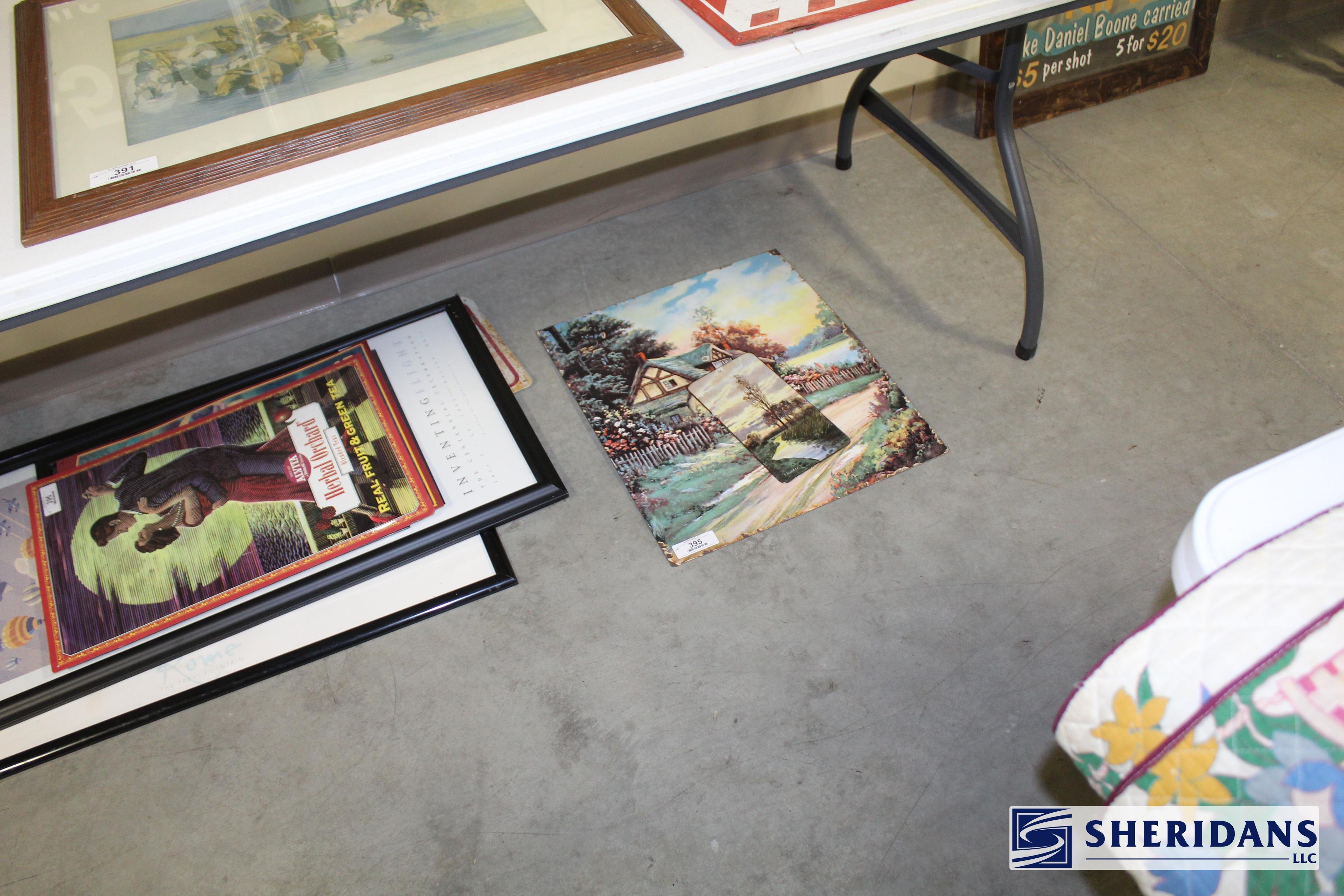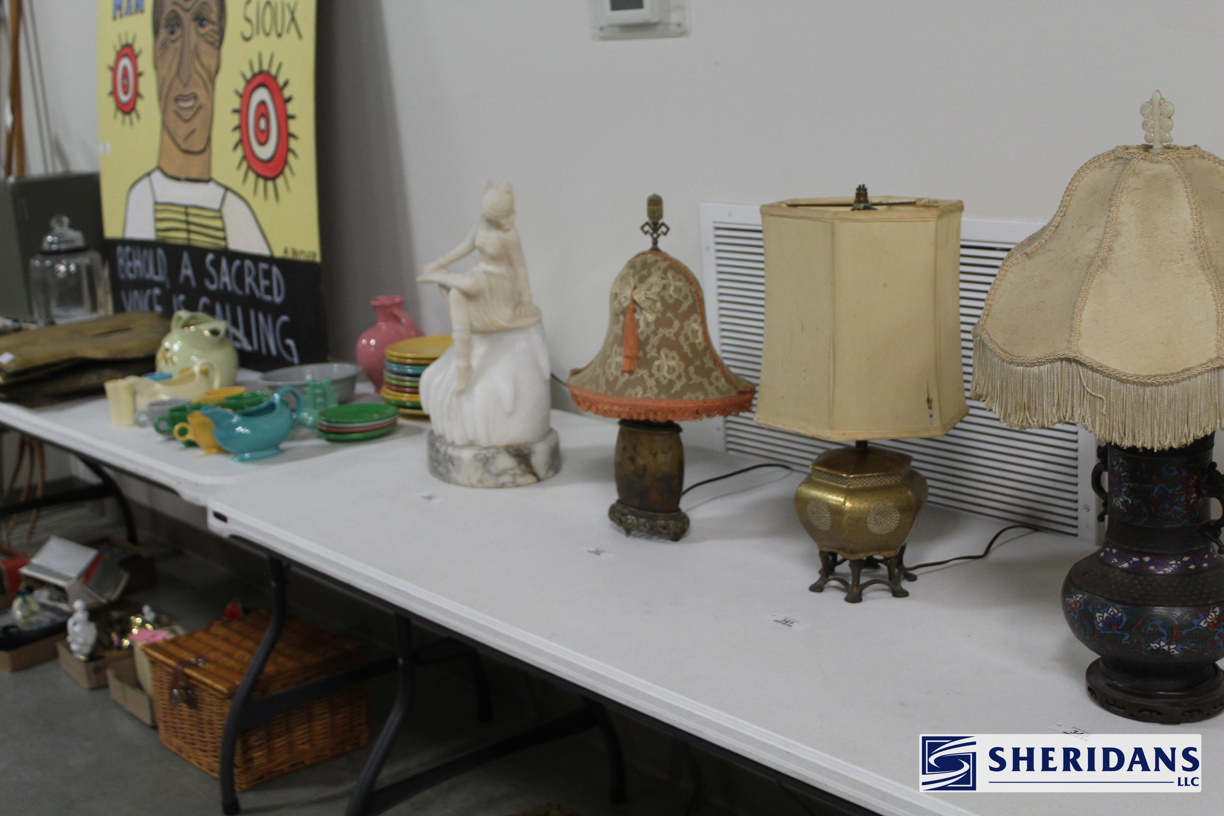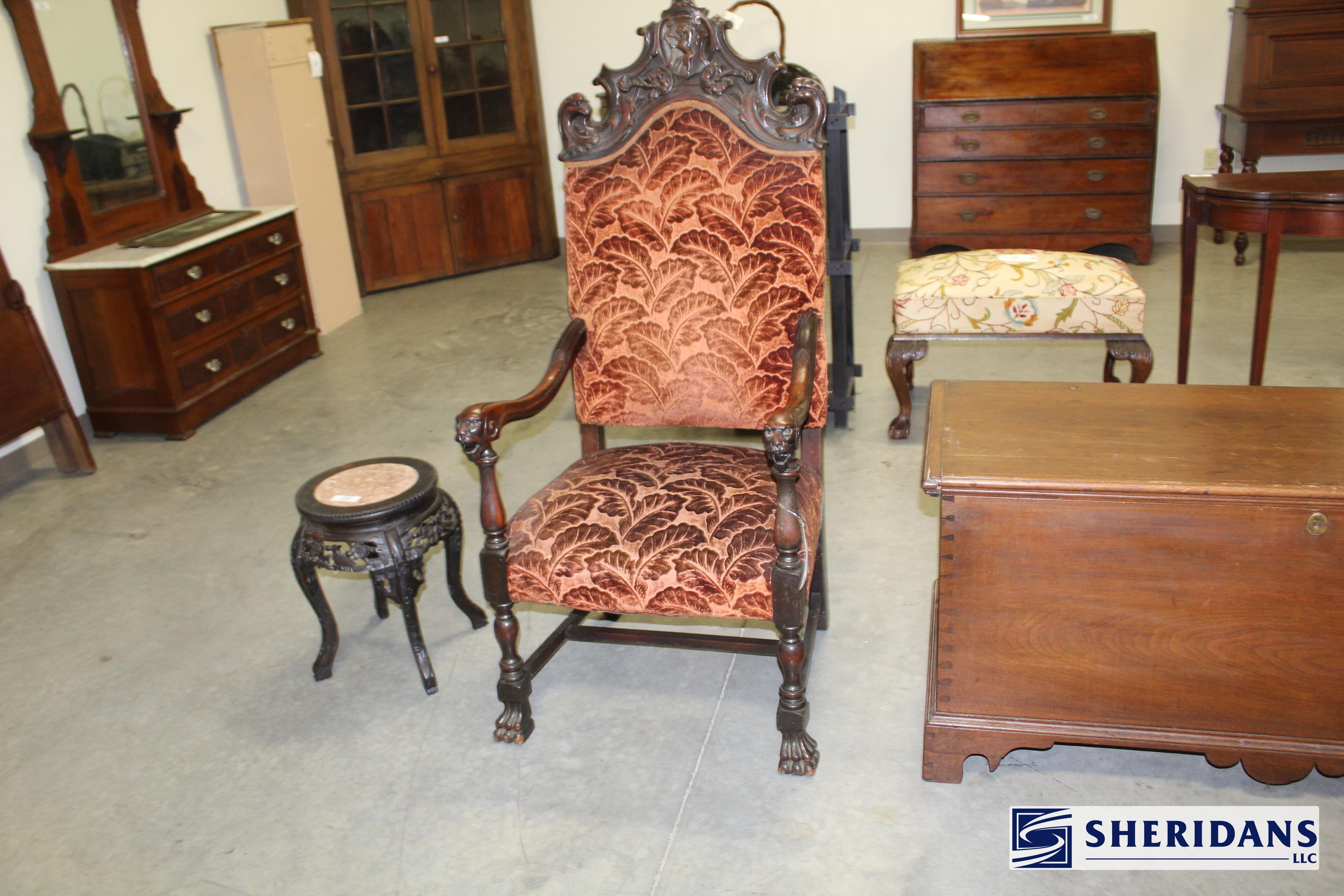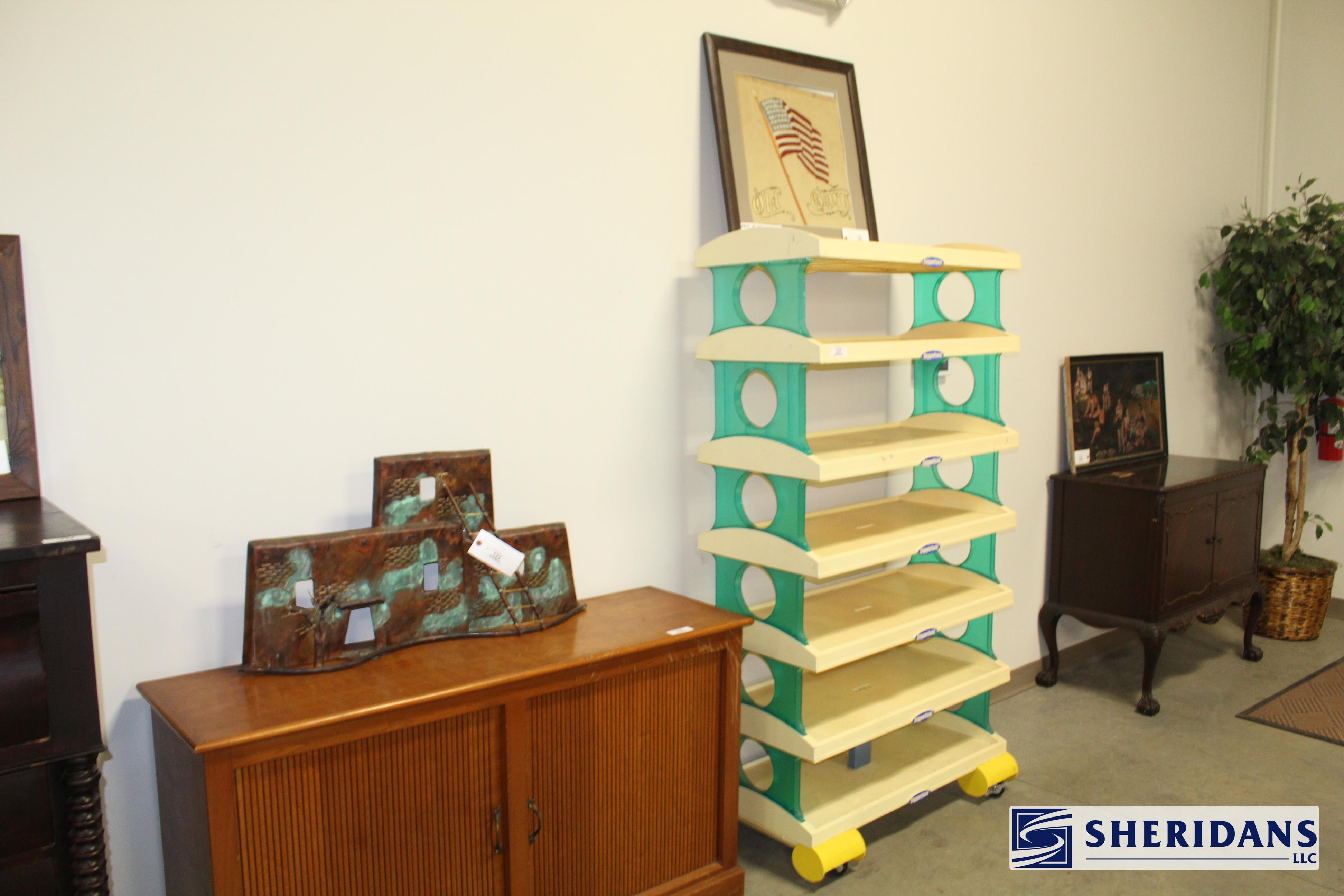 Antiques: Extensive selection of antique furniture including walnut, mahogany & oak pieces such as desks, dressers, cupboards, side tables, mirrors, beds, empire & Victorian examples, wicker furniture & marble-top stands; framed artwork & paintings including oil on canvas works, signed prints, oriental artwork & stained glass; advertising & country store items including Coca-Cola signs, thermometers, menu boards, Gruen advertising clock, Remington gun displays, Huston Bickett hardware sign, tobacco & fruit crate labels, & various metal & porcelain signs; lighting including brass & kerosene lamps, Aladdin lantern, trench art lamps & decorative shades; clocks & timepieces including Seth Thomas mantel clock & other advertising clocks; cast iron items including urns, planter stands, match holders, doorstops, fireplace tools & household pieces; scales & store fixtures including Winchester brass bushel scale, merchant scales, balance scales & Brandt automatic cashier; vintage toys & collectibles including Marx tin toy, antique push toy, Madame Alexander dolls & slot machine; sporting & military items including mounted deer head, powder flask & Signal Corps box; glass & decorative arts including Fostoria, candlewick, copper luster & assorted art glass