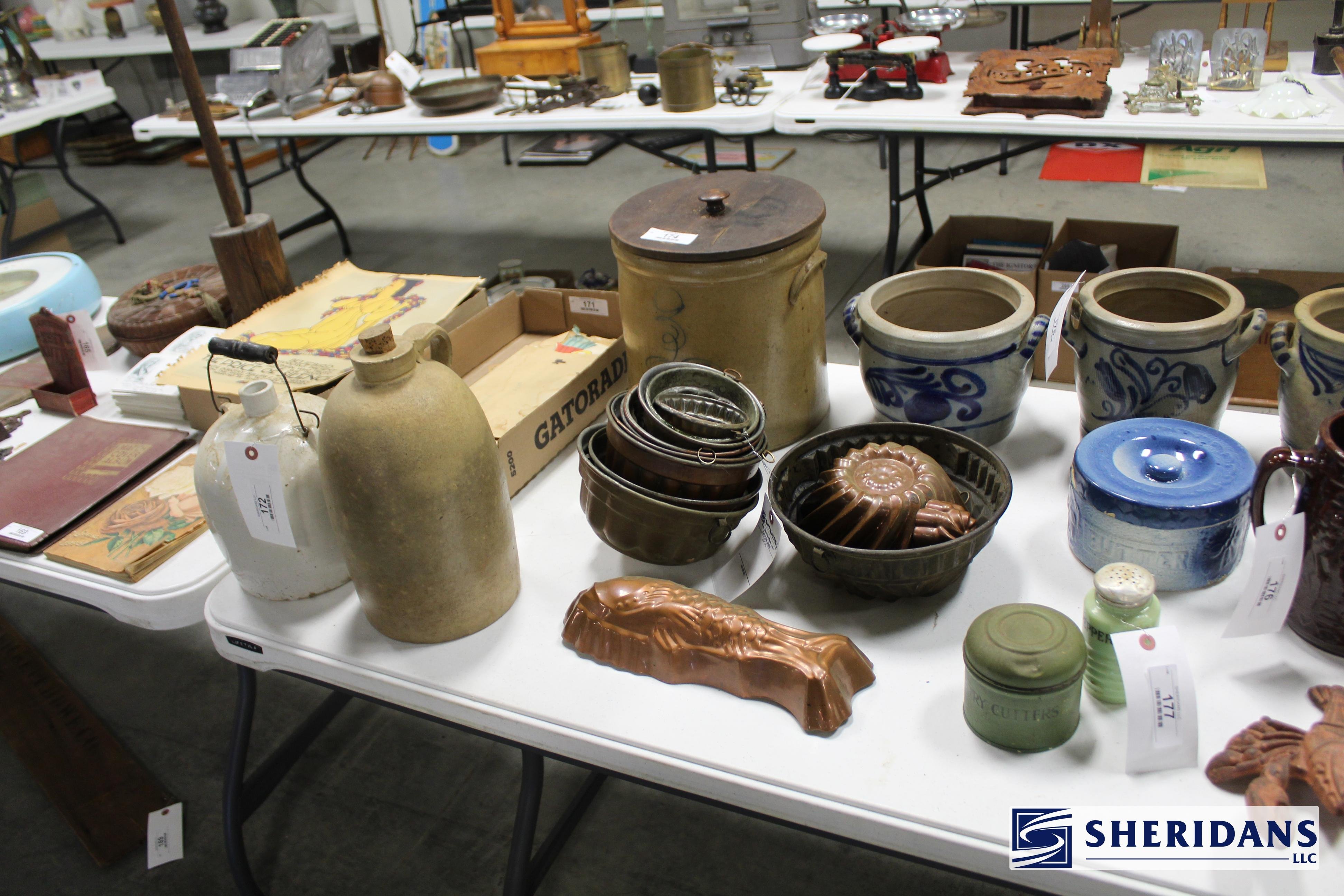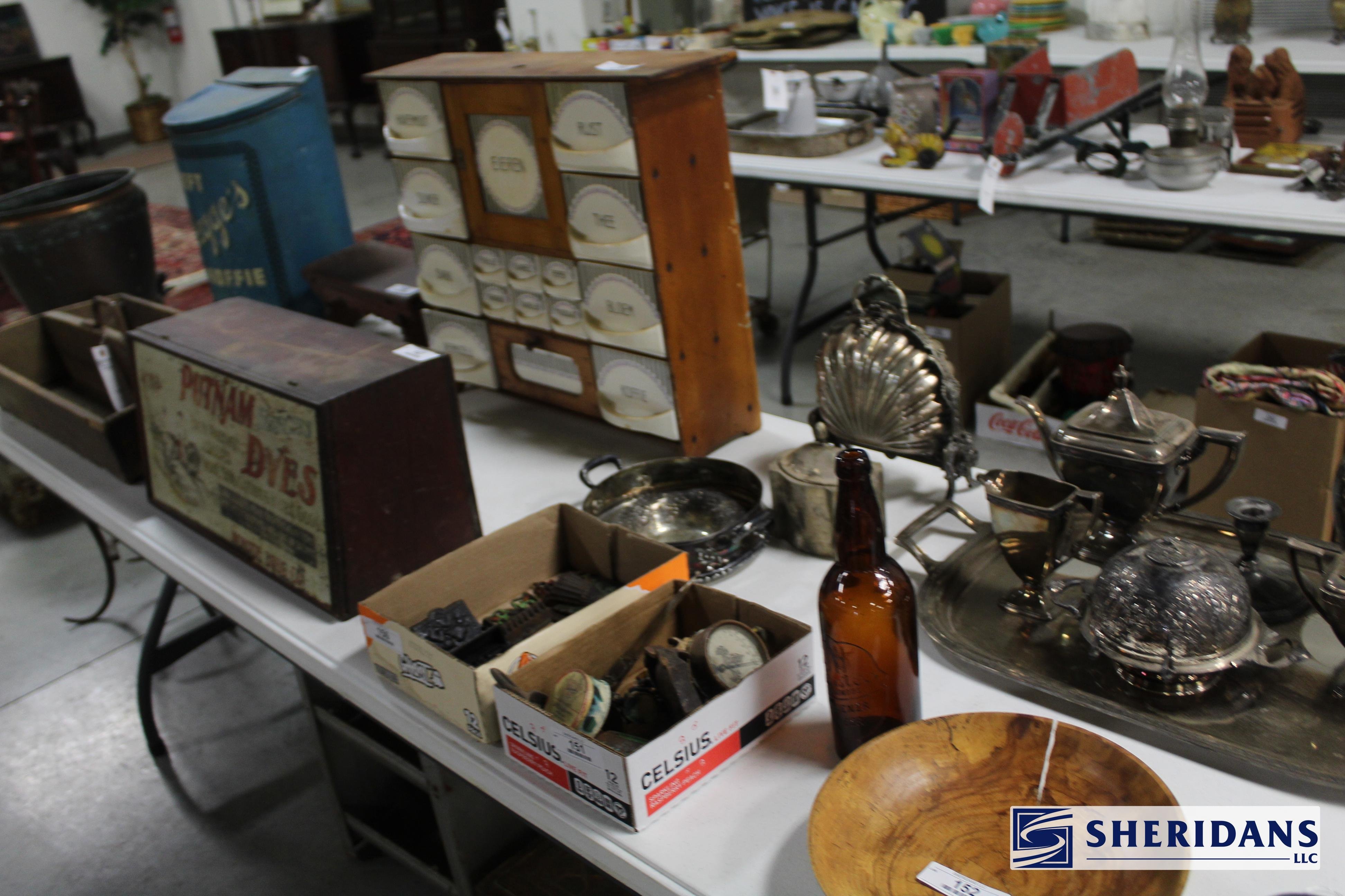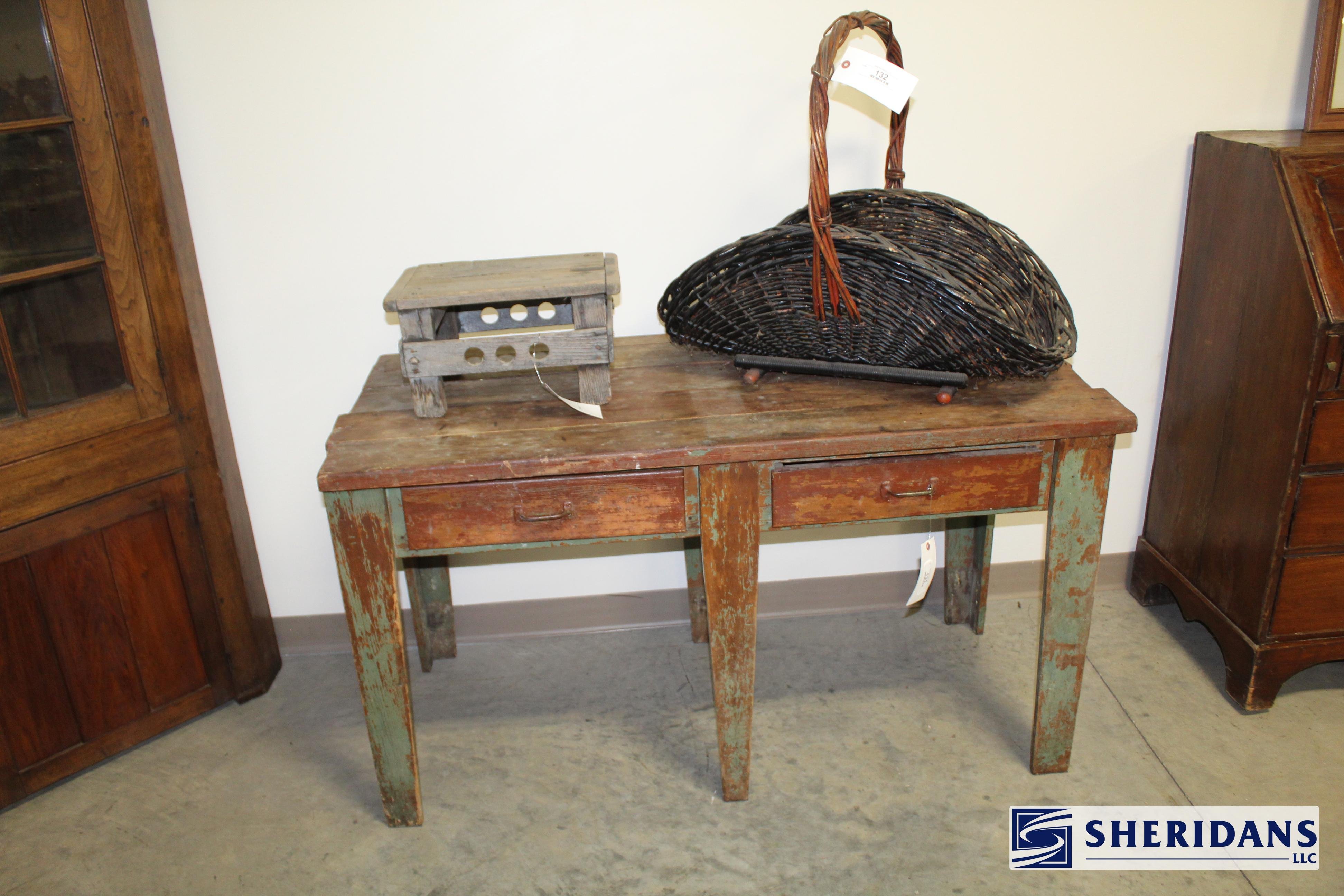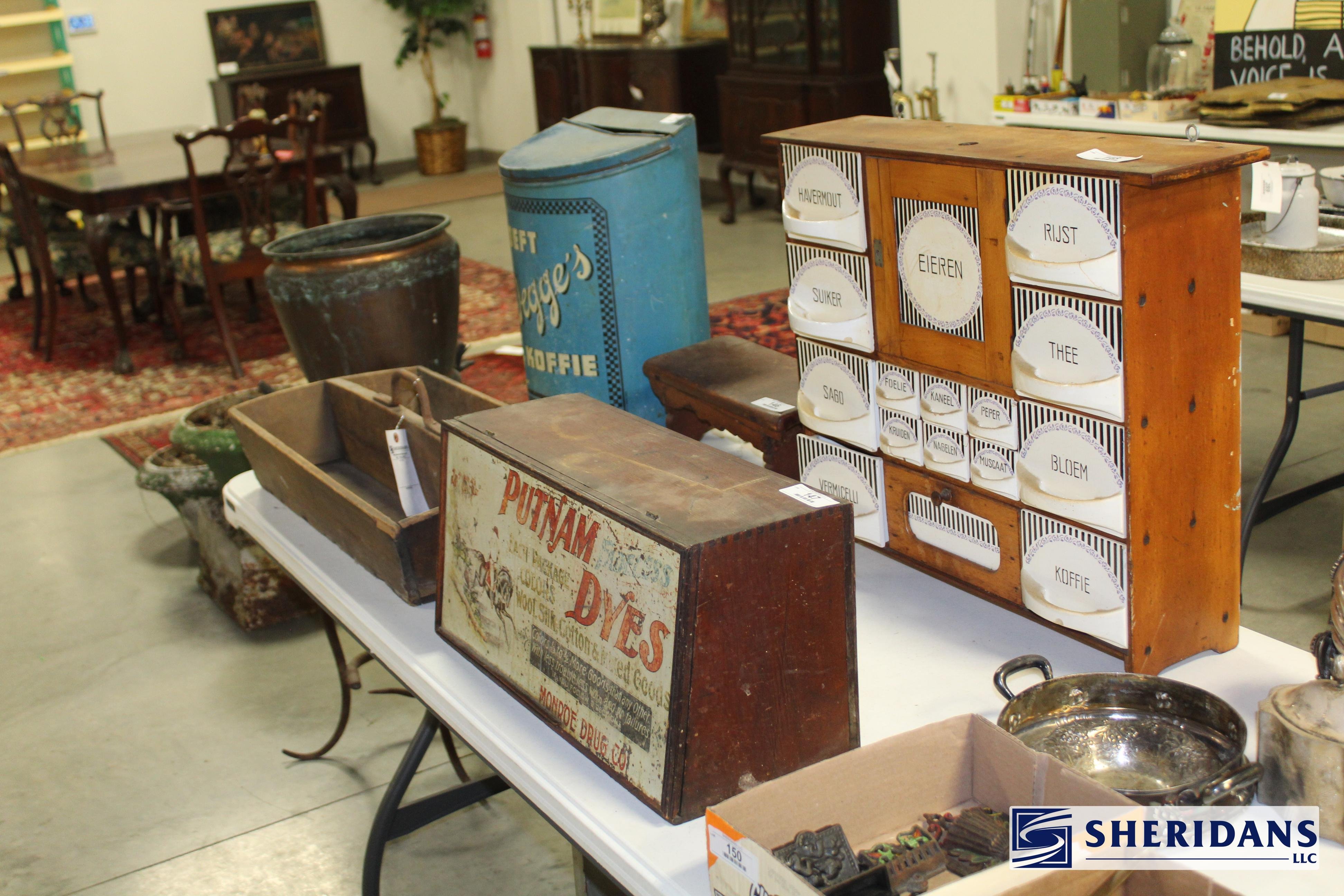 Primitives: straw folk art baskets; folk art sewing box; folk art pincushion; oak shoe shine stand; walnut portable desk; bamboo inlay shelf; papier-mache turkey; quilt selection; brass fish bookends; primitive work table; twig basket; primitive stool group; early walnut corner cupboard; primitive cupboard; primitive wooden carrier; Putnam pie cabinet; wood porcelain spice chest; wood molding planes; early traveling desk; oak spice cabinet; wood storage boxes; wood carrier group; early handled basket; maple dresser top stand; walnut letter holder; butcher block; pine lift-top bin; country lift-top bin; kindling box; maple high chair stroller.